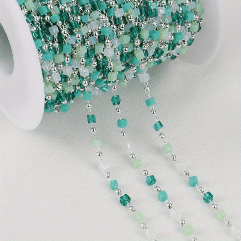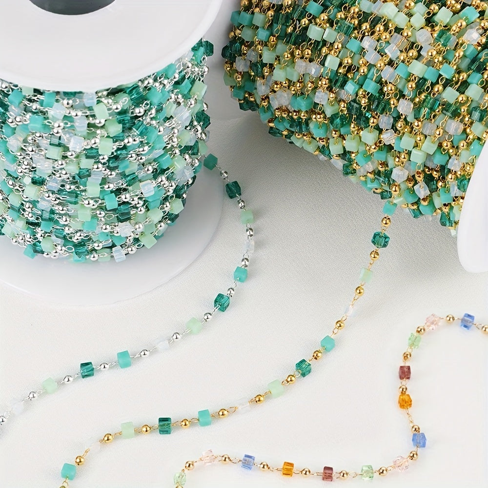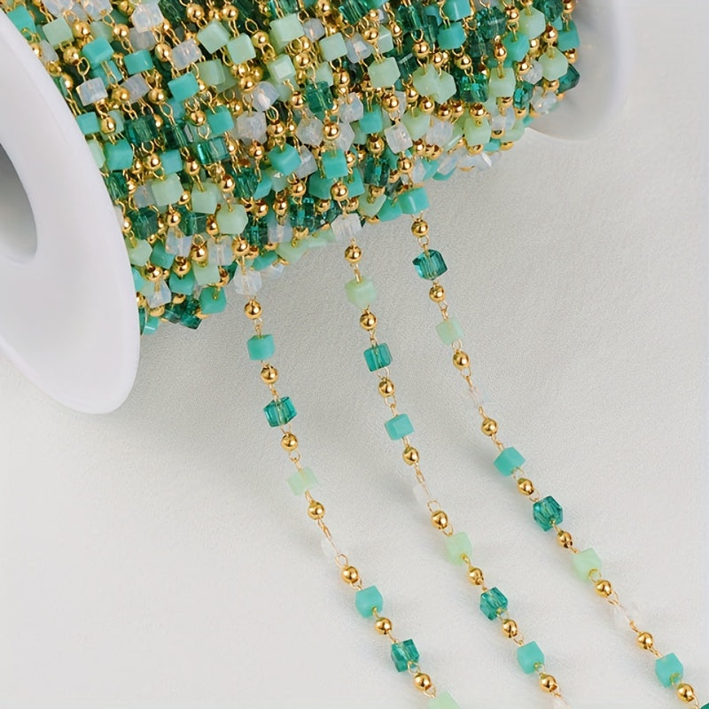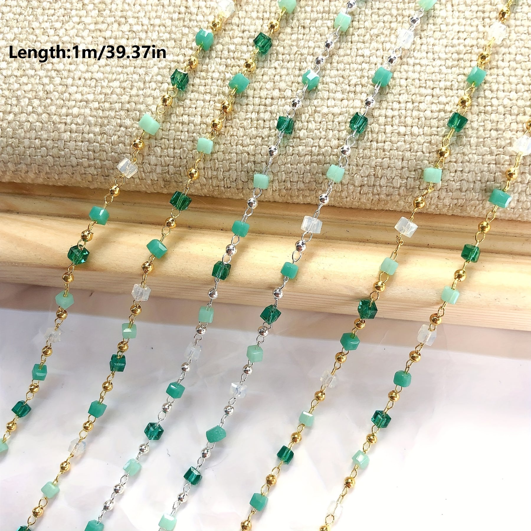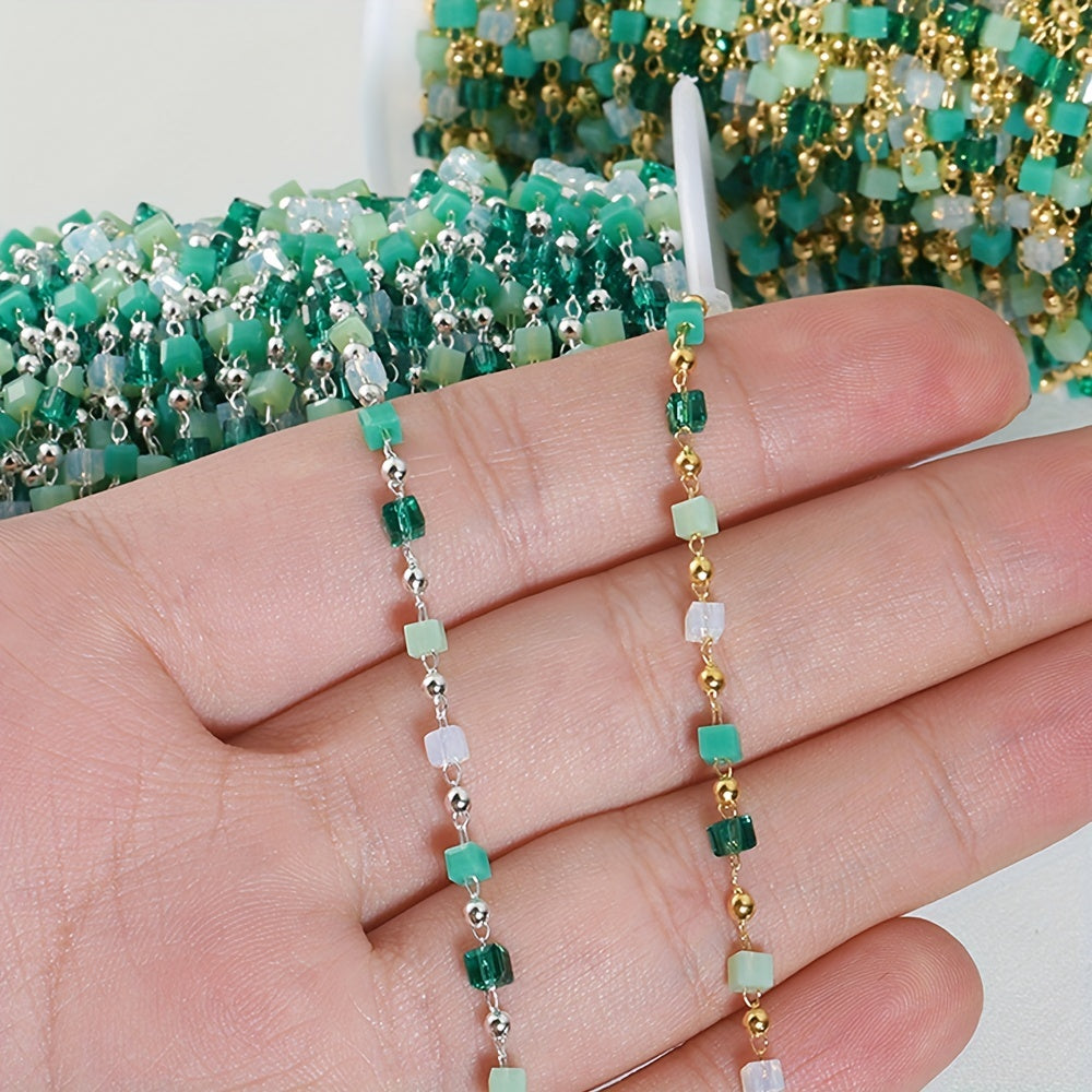 Create your own stylish choker with these 1 meter Bohemian bead chains featuring cubic green beads. Choose from silvery or golden chain for a personalized touch.