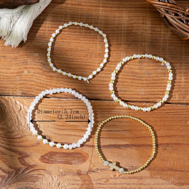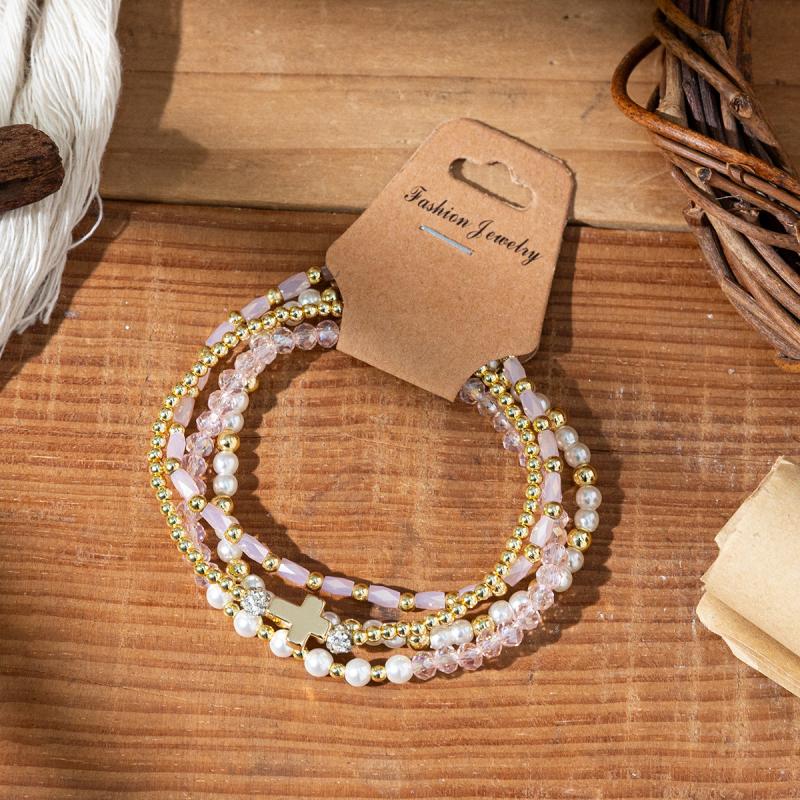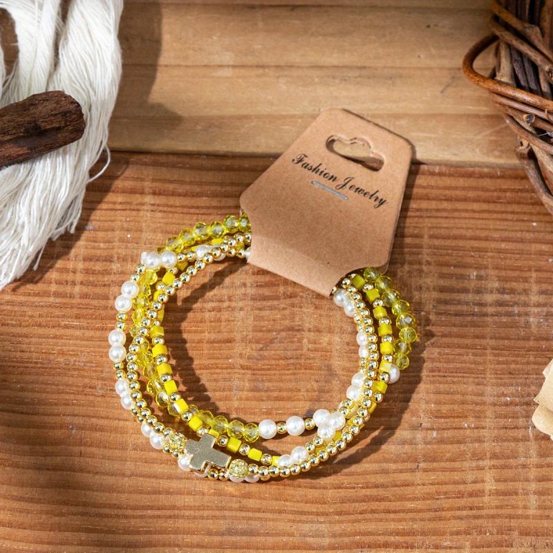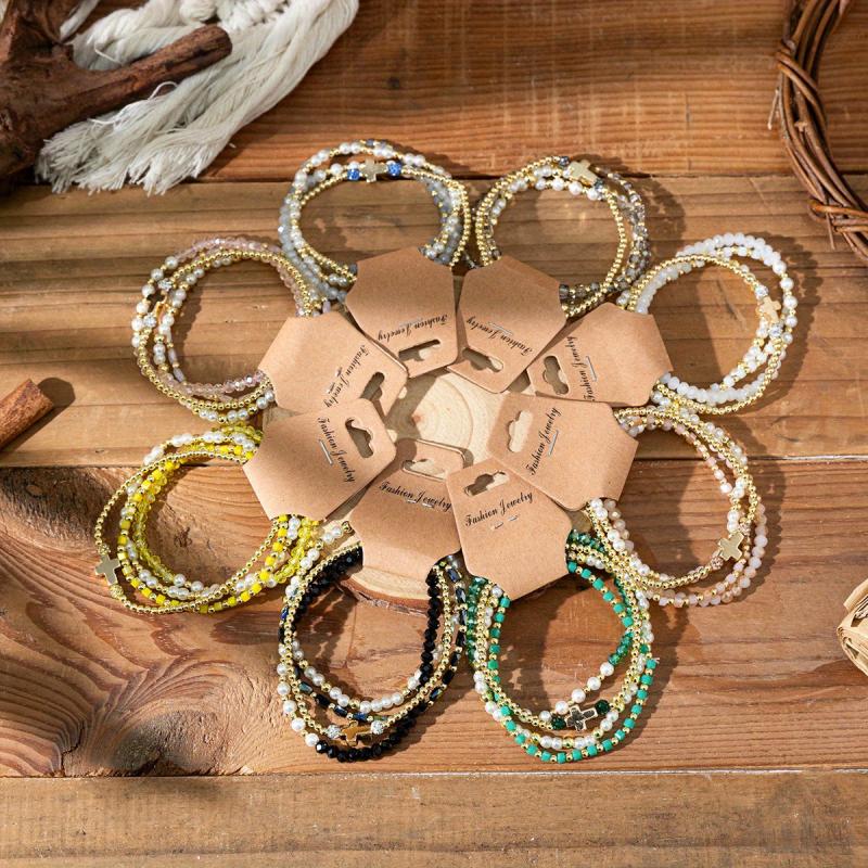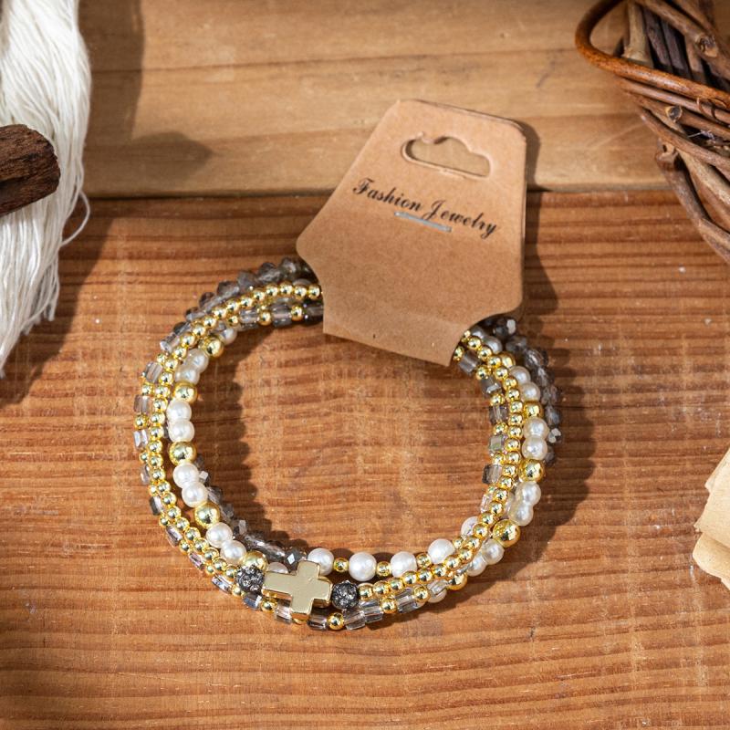 Add a touch of bohemian style to your outfit with this versatile bracelet set. It features a combination of beaded, cross, and rhinestone bracelets that are perfect for vacation or Holi celebrations.
