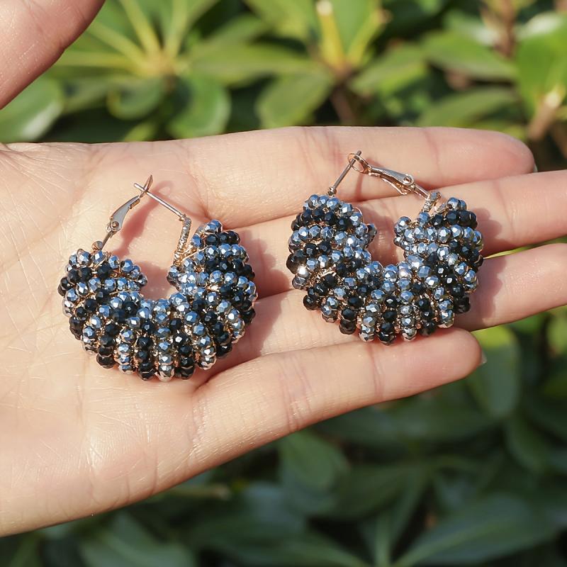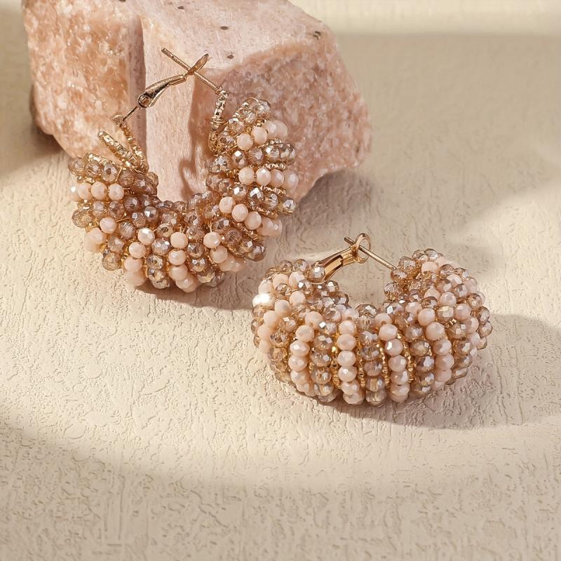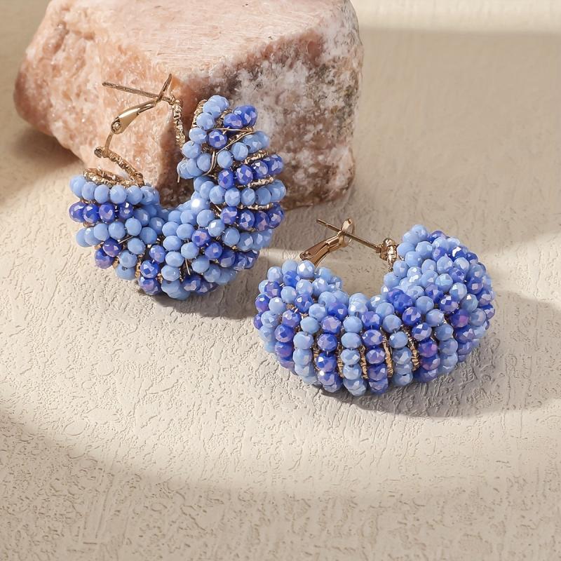 These boho-inspired drop earrings feature colorful beads handcrafted into a unique C shape design. Made with stainless steel ear needles, these earrings are versatile for daily wear and perfect for vacation outfits.