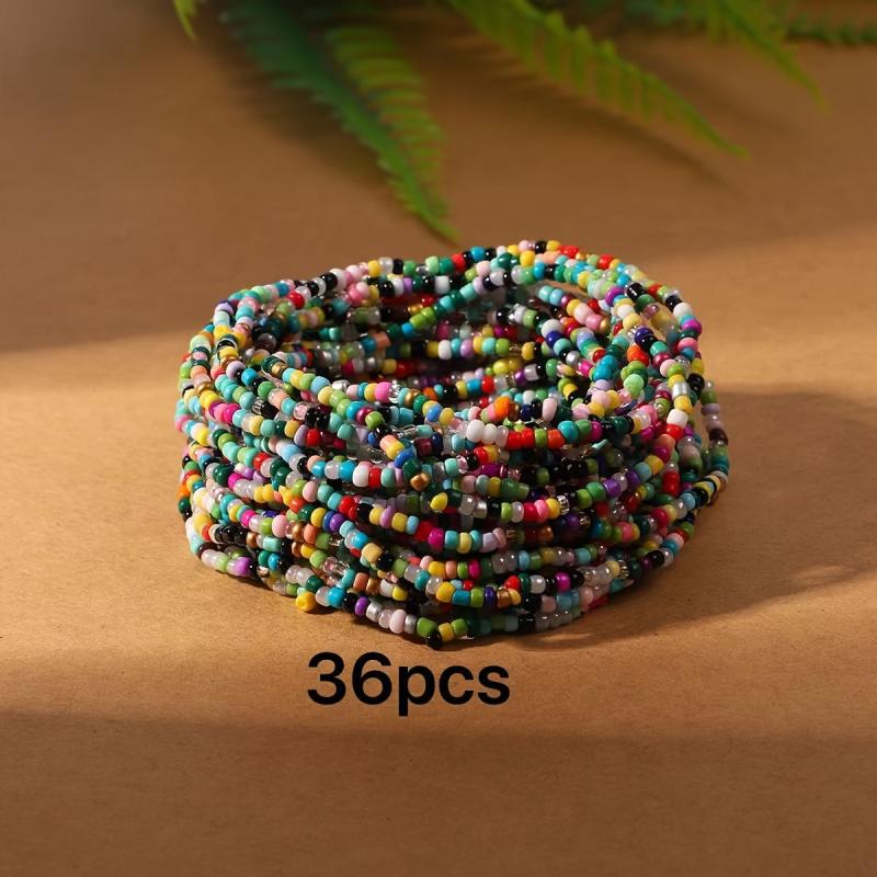 Elevate your style with this set of 36 handcrafted bohemian stretch bracelets. Featuring multicolor seed beads, these versatile bangles can be layered to create a unique boho look for daily wear and special occasions.