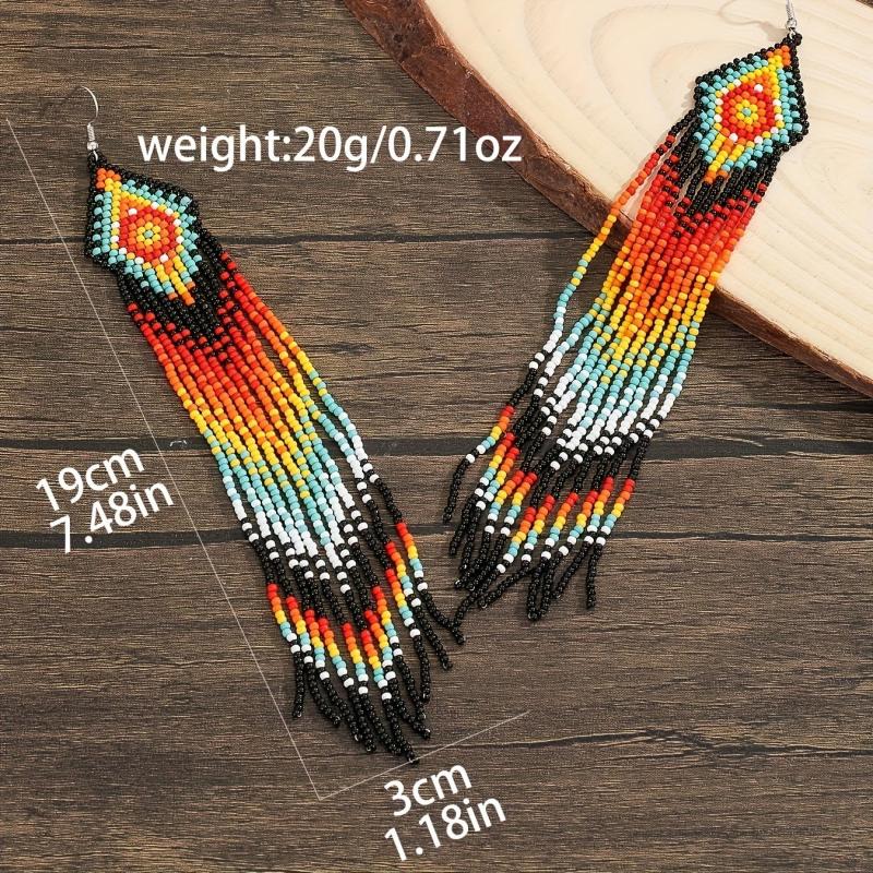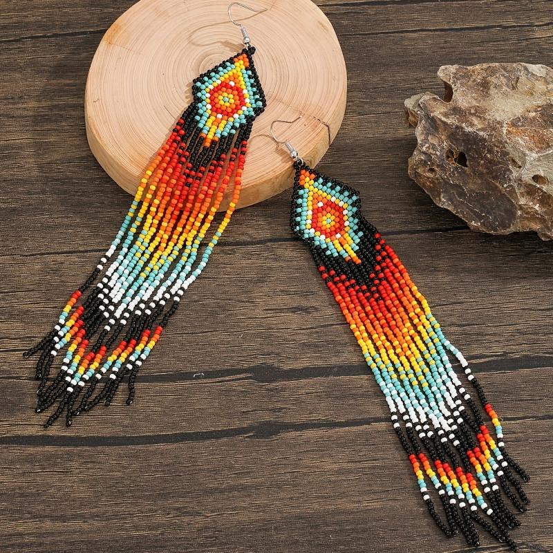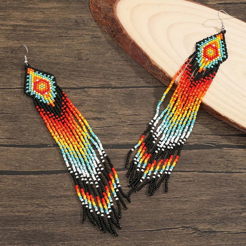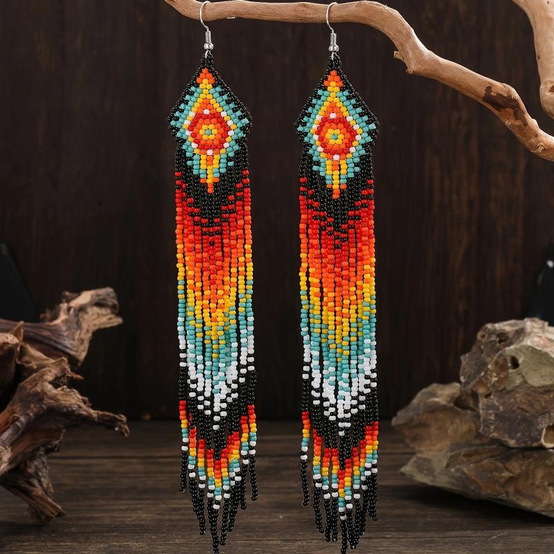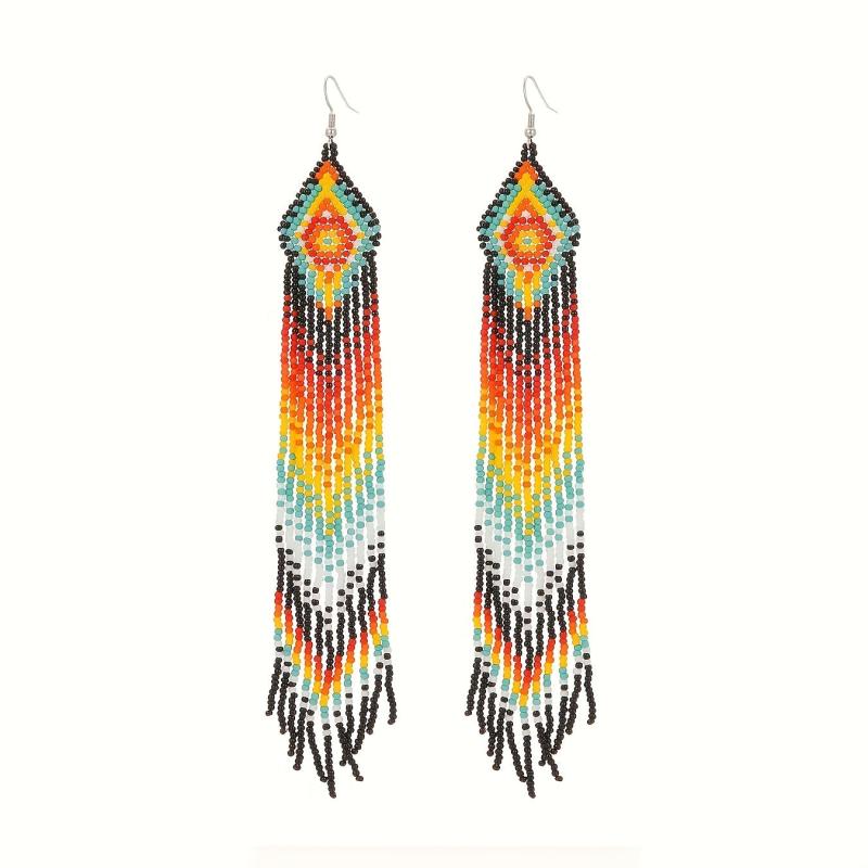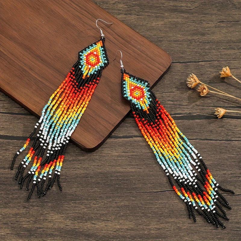 Add a pop of color to your look with these handcrafted boho beaded tassel earrings. Featuring a geometric pattern and made from glass material, these earrings are perfect for casual attire and make a great gift for a loved one.