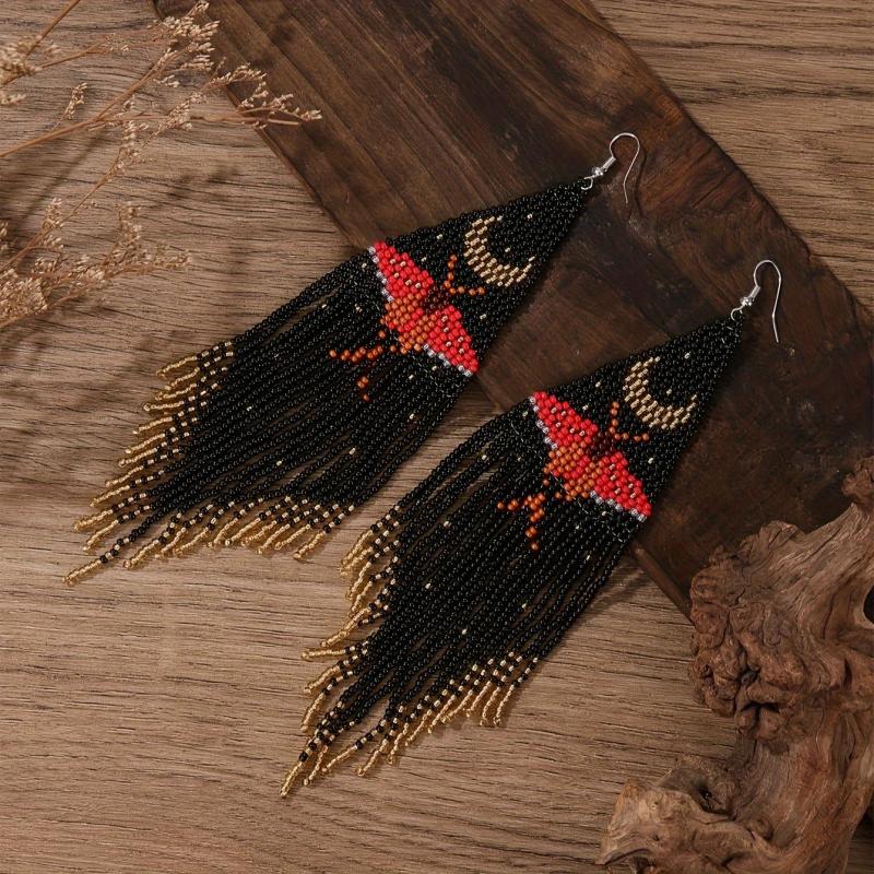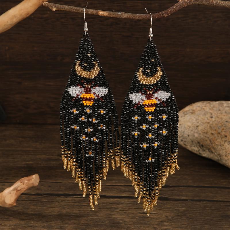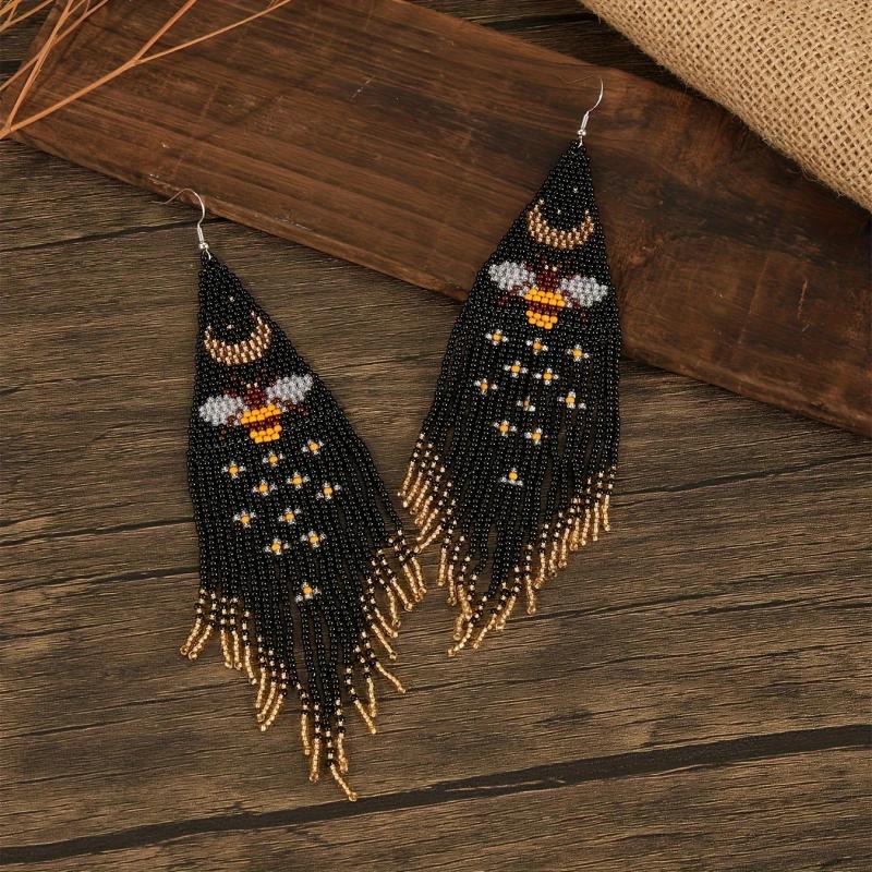 Add a touch of bohemian style to your outfit with these bead tassel earrings featuring bee and butterfly patterns. Made of glass seed beads, they dangle elegantly for a chic look.