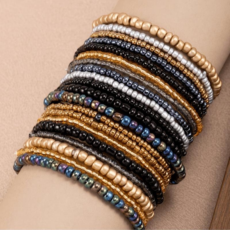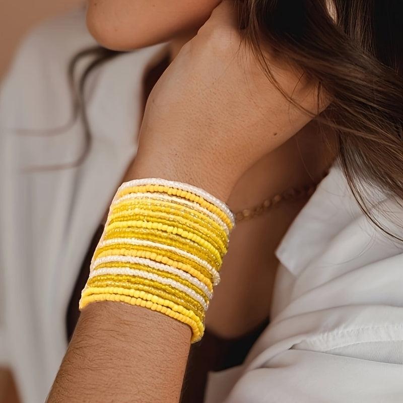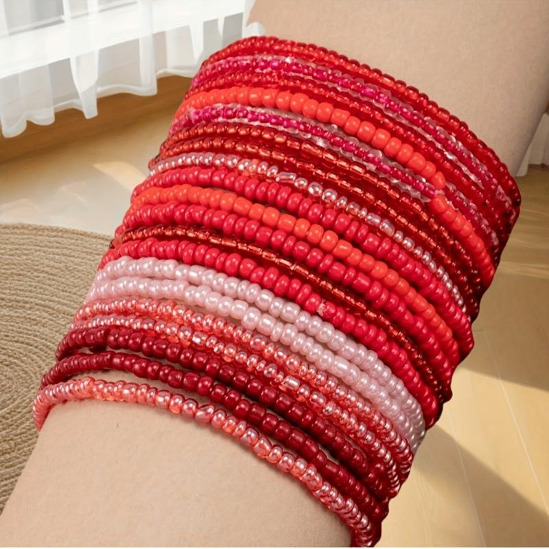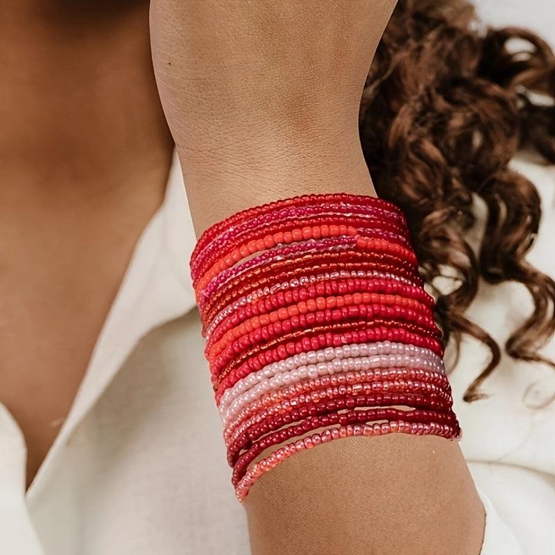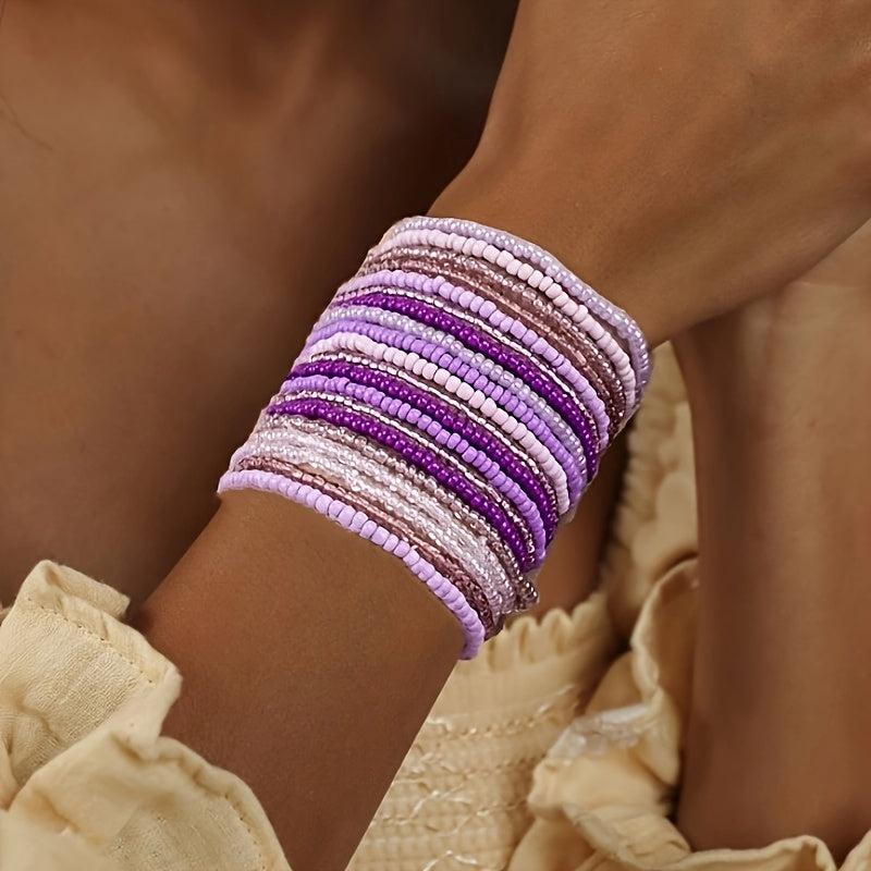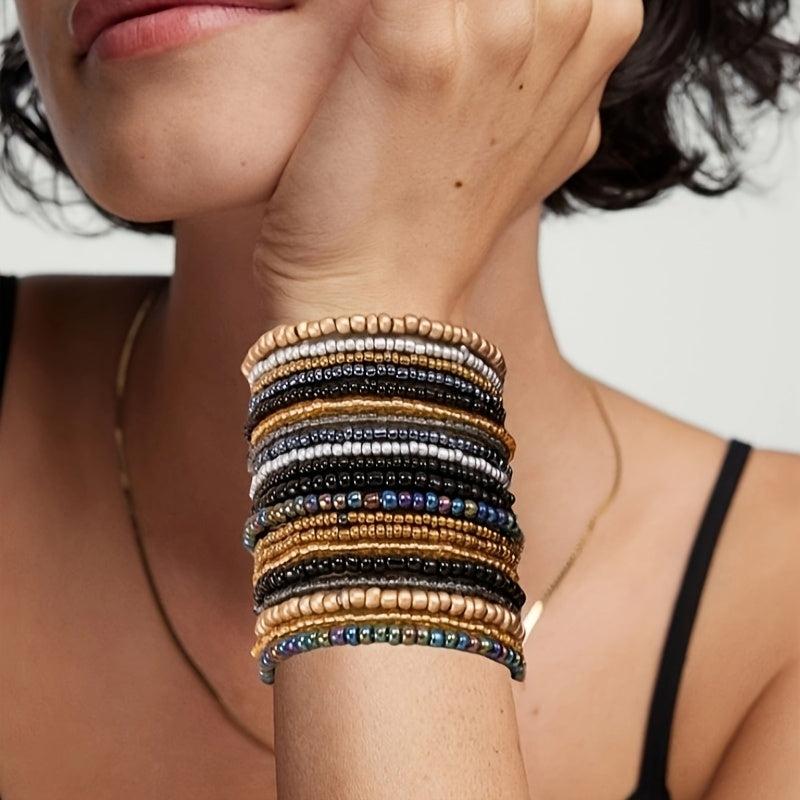Elevate your accessory game with this set of 20 bohemian minimalist stretch bracelets featuring colorful rice beads. Perfect for adding a touch of boho chic to any outfit.