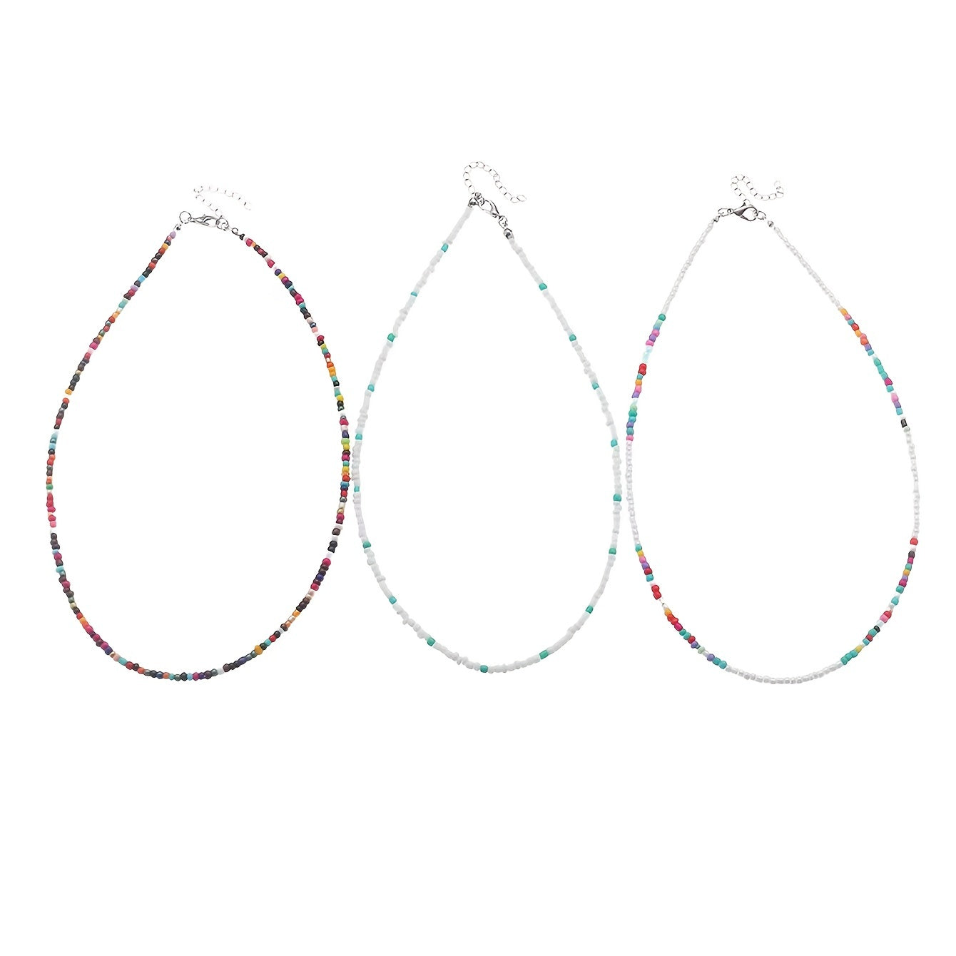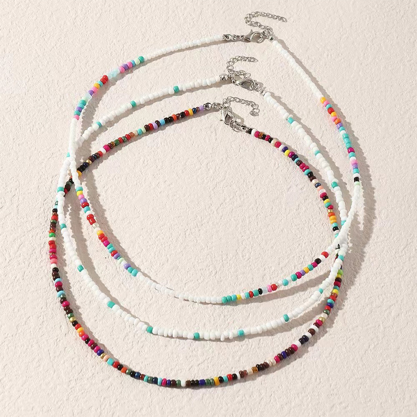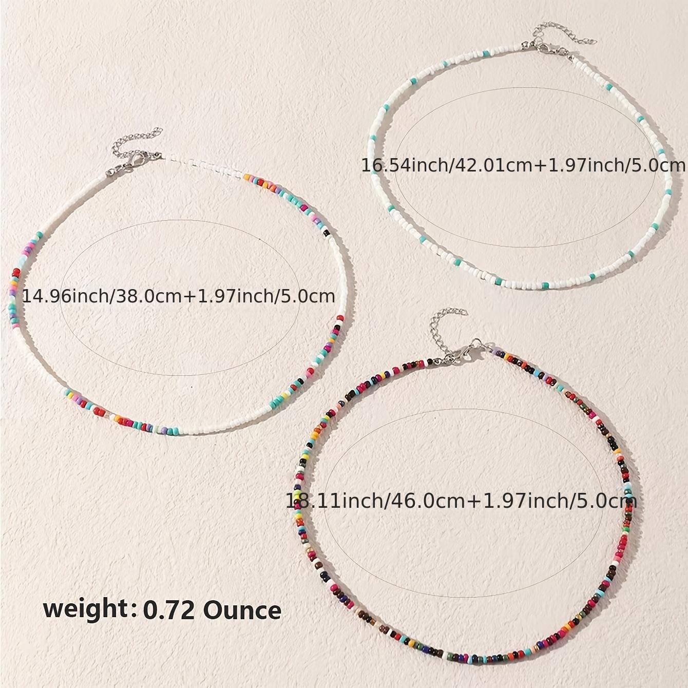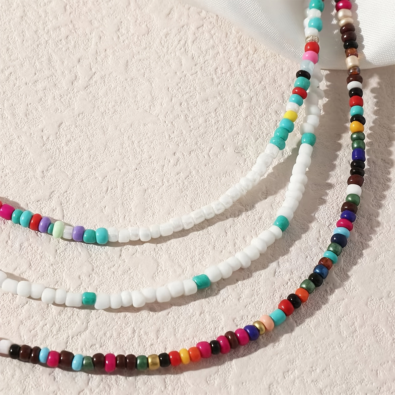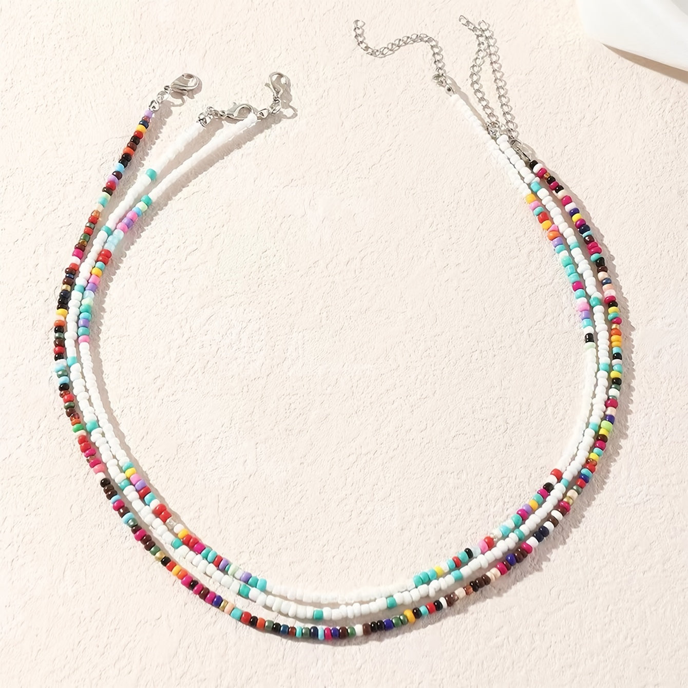 This vibrant stacking necklace set is a perfect gift for girls, women, girlfriends, or wives. It features colorful rice beads that add a boho-chic touch to any outfit.
