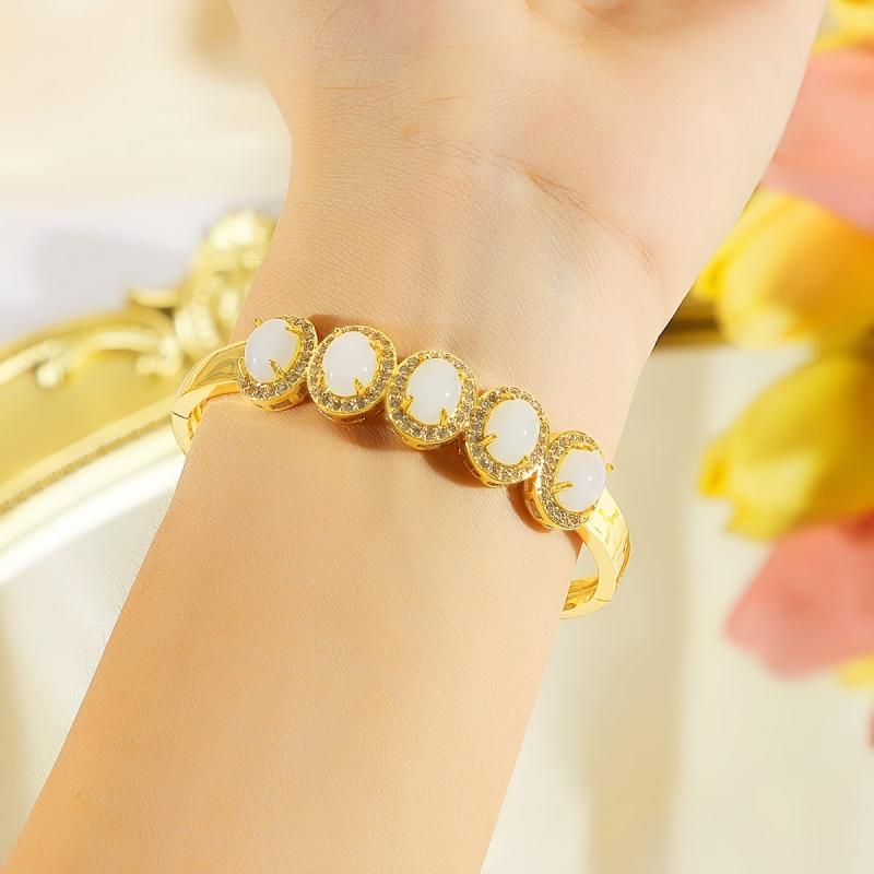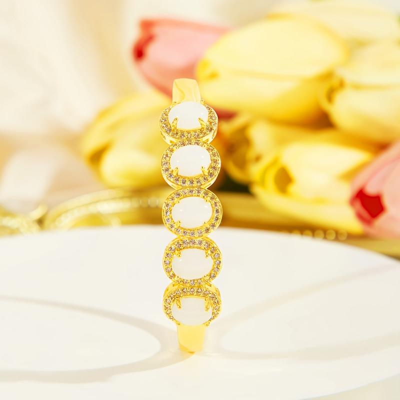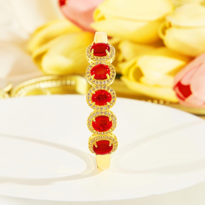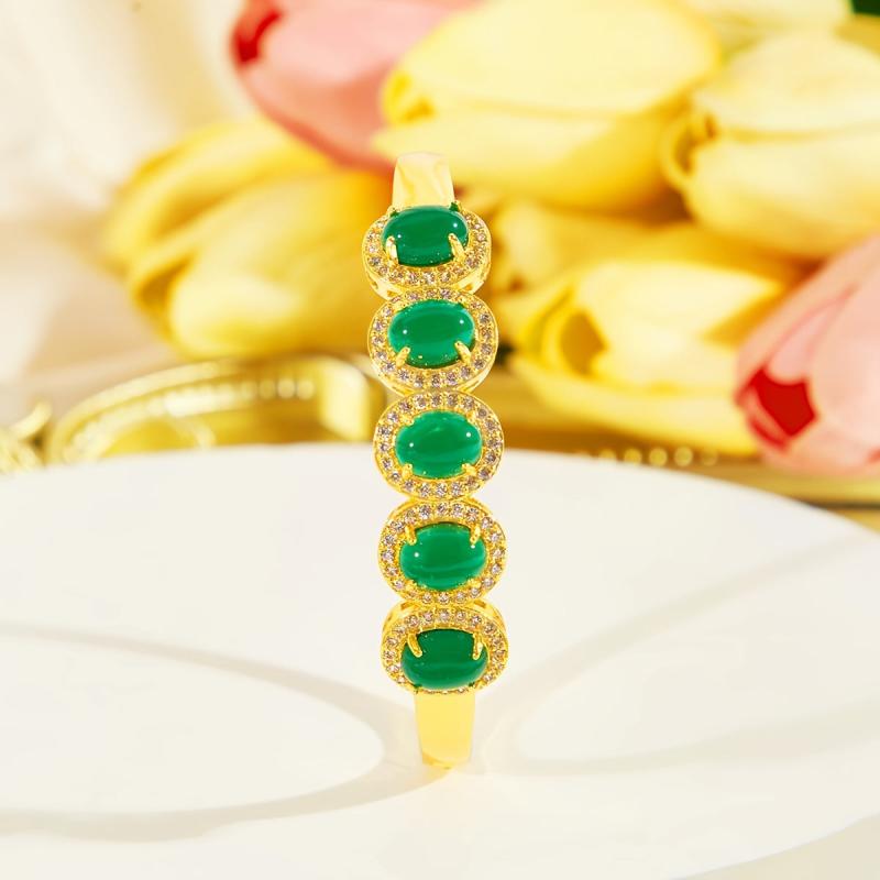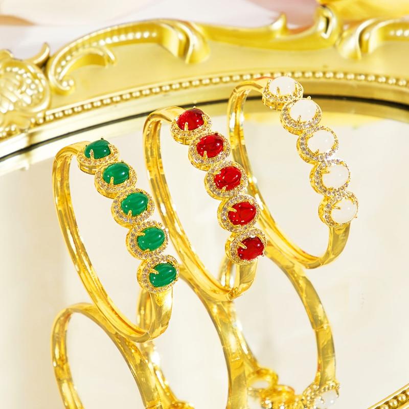 Elegant and stylish bangle featuring round & oval green and red zirconia stones. Perfect for weddings, banquets, and as a spring gift.