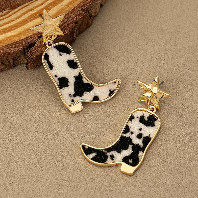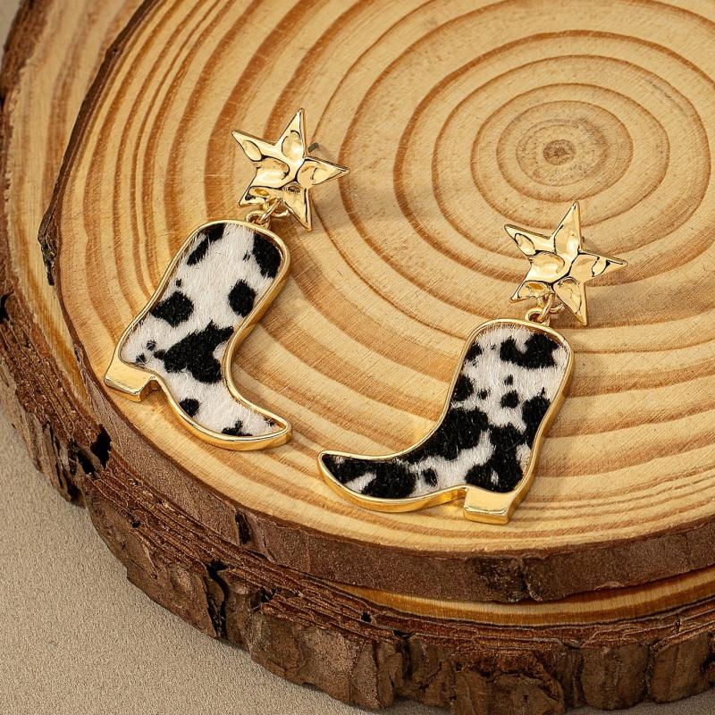 These Western Boho Cow Print Boot Dangle Earrings are made of 14K golden plated zinc alloy with stainless steel post, perfect for a retro style look. Versatile for women's outfits and occasions.