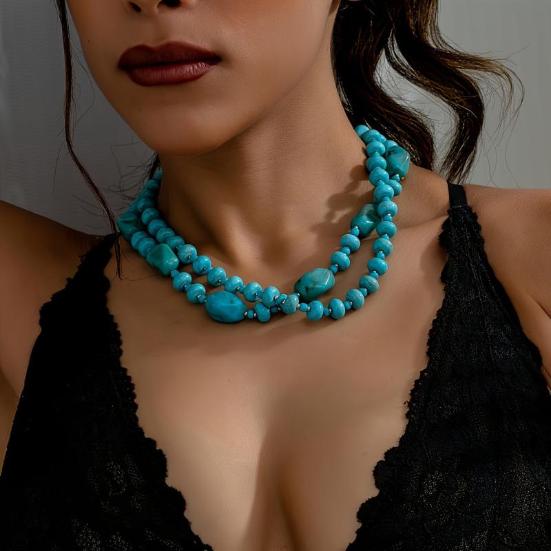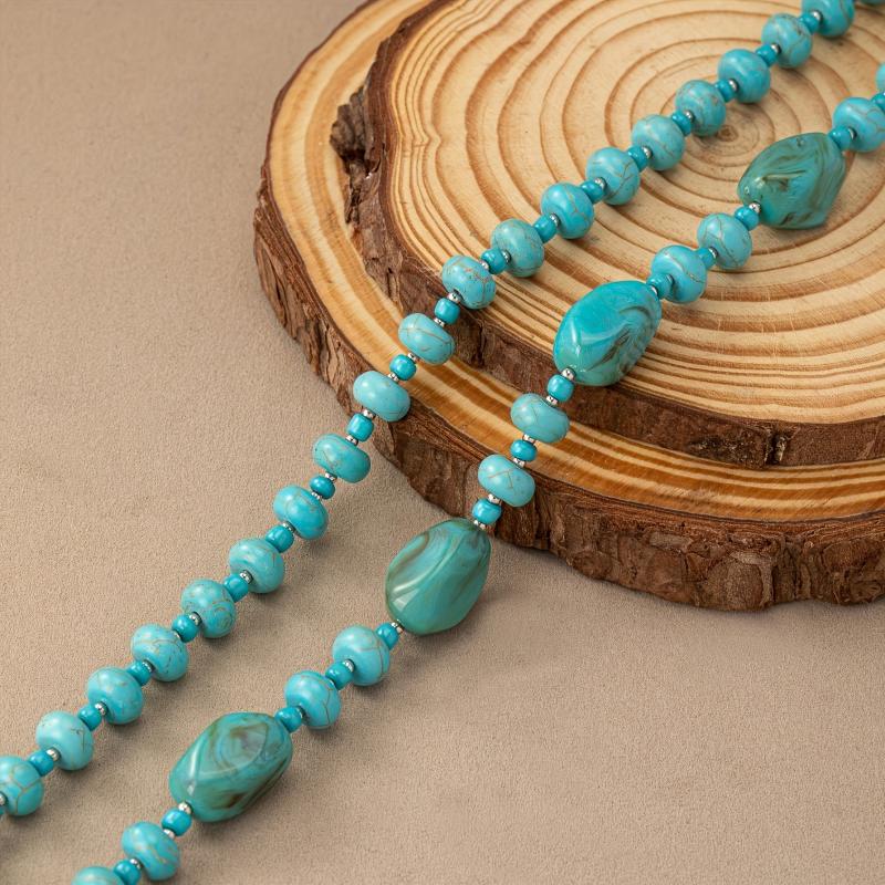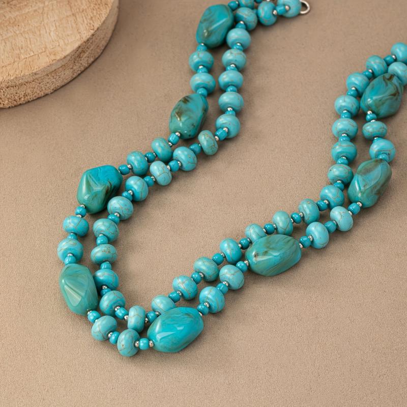 Add a bohemian touch to your outfit with this vintage-inspired double layer necklace featuring irregular turquoise stone beads on lace-inspired chain. Perfect for everyday wear or as a thoughtful gift for women.