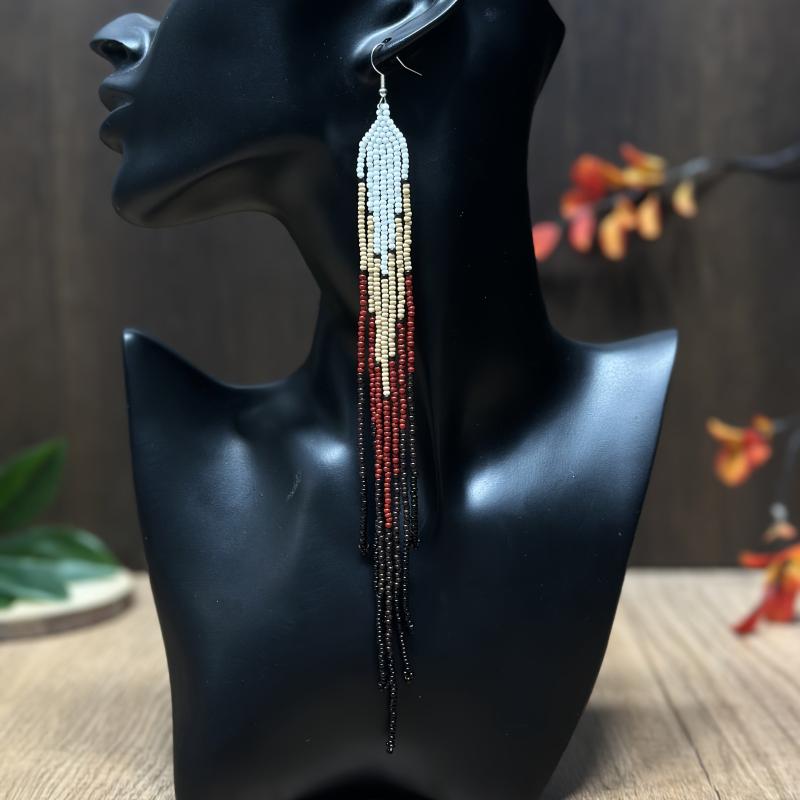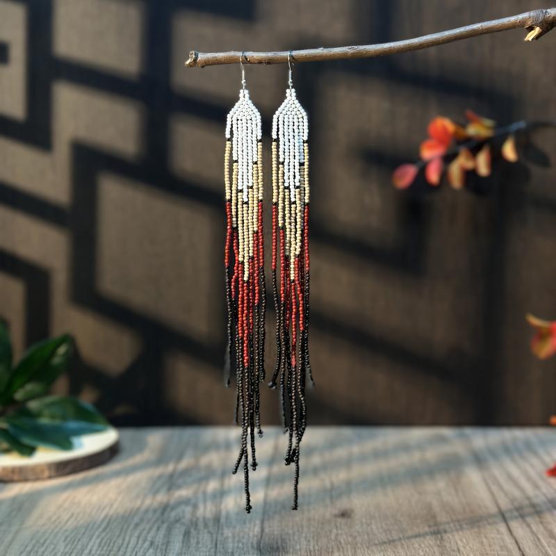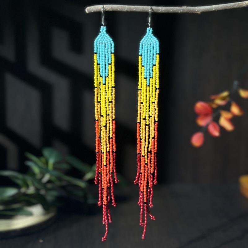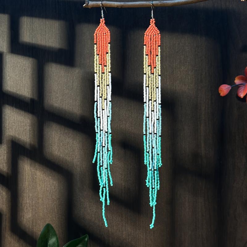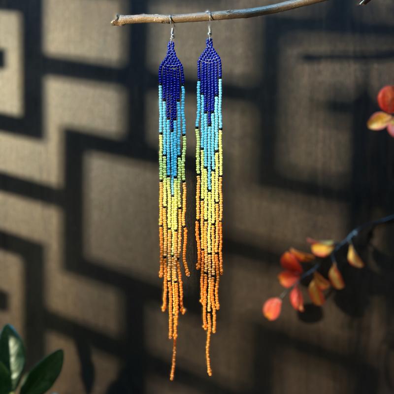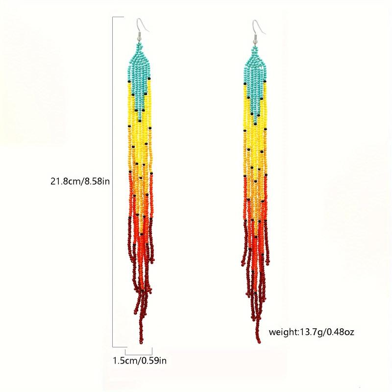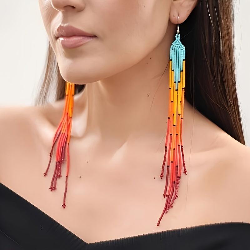 Handcrafted seed bead earrings in a vibrant rainbow gradient with accents. These extra long tassel earrings are perfect for a boho look.