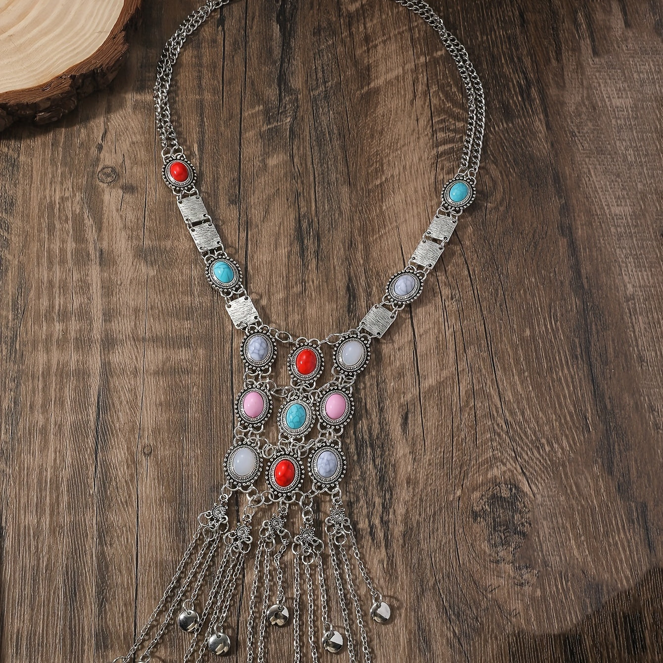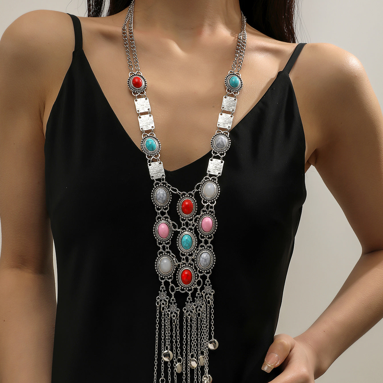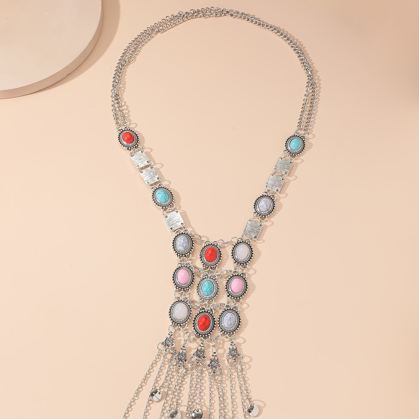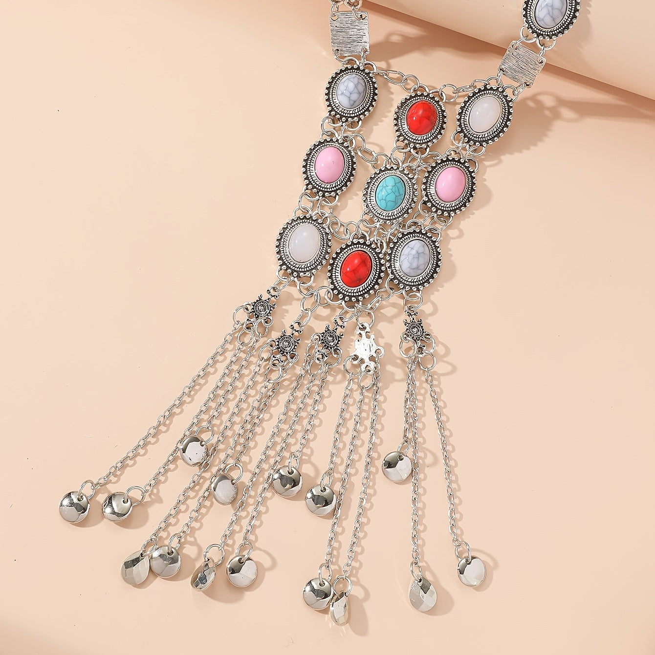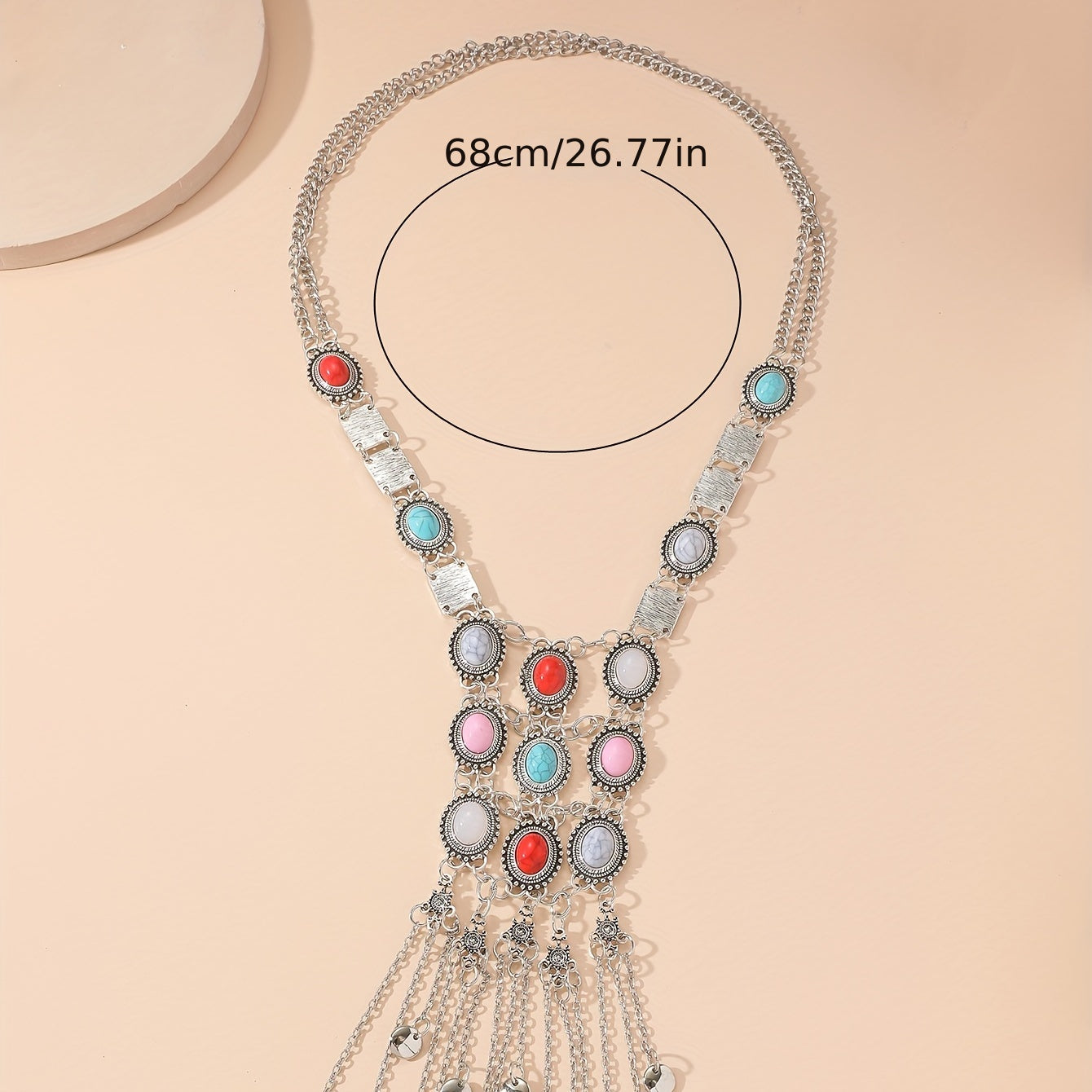 Elevate your style with this boho chic long necklace featuring faux gemstones. Makes a great gift for women.