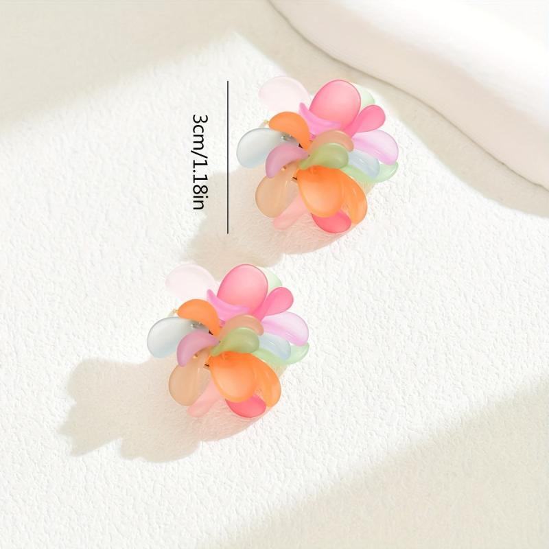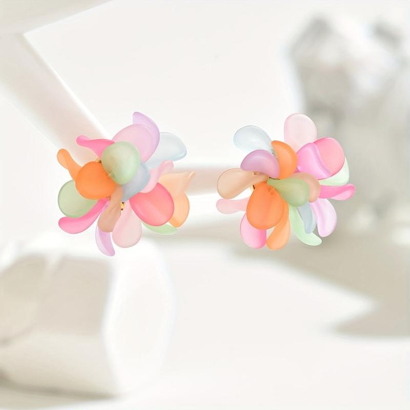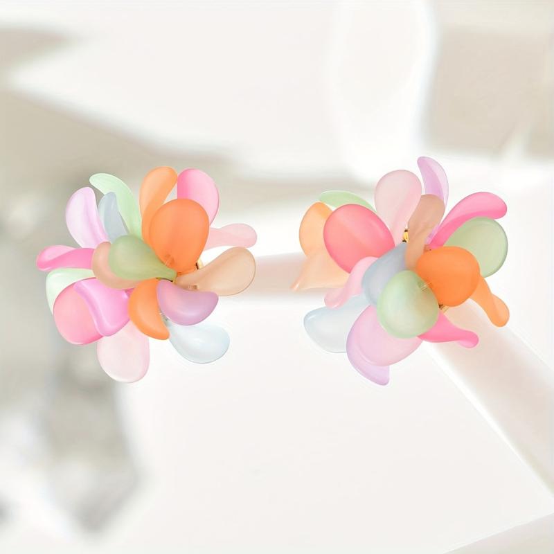 Add a touch of bohemian flair to your summer outfits with these vibrant floral heart dangle earrings. Made with colorful acrylic petals and stainless steel posts, these earrings are perfect for casual attire.