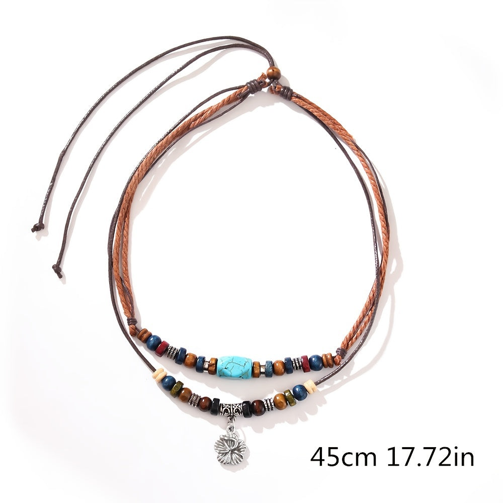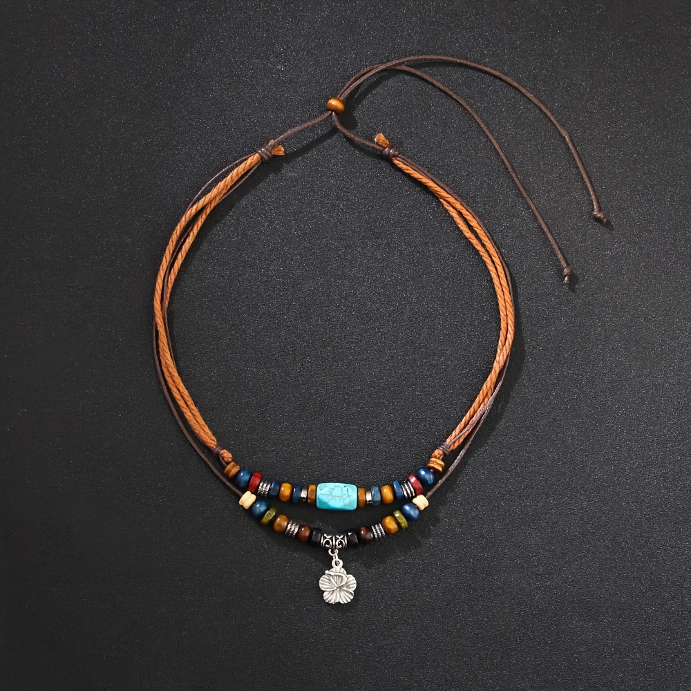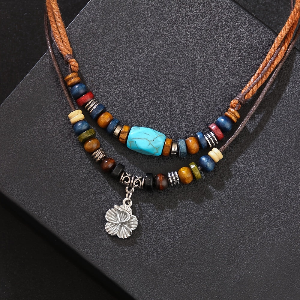 Add a touch of boho chic to your outfit with this charming flower charm necklace made of vintage wooden beads. Perfect for accessorizing any look.