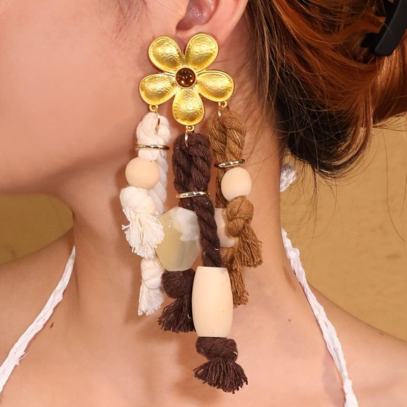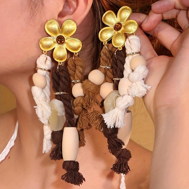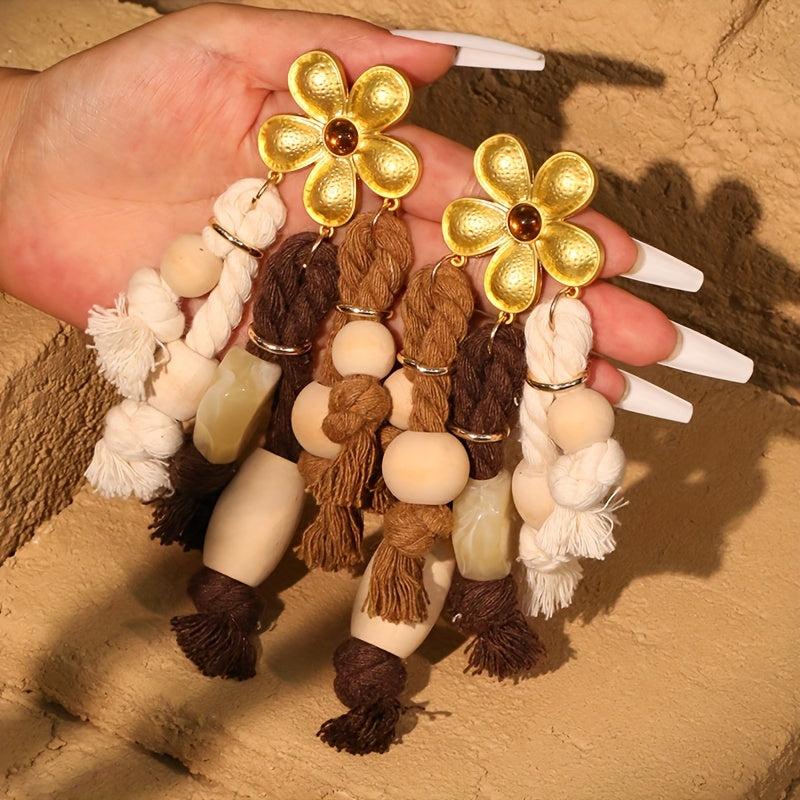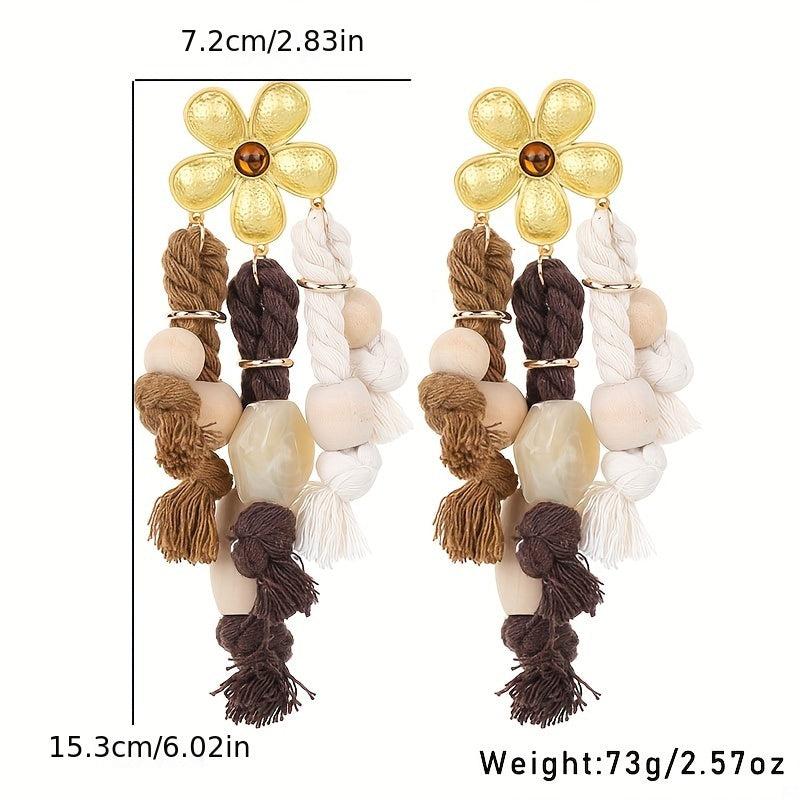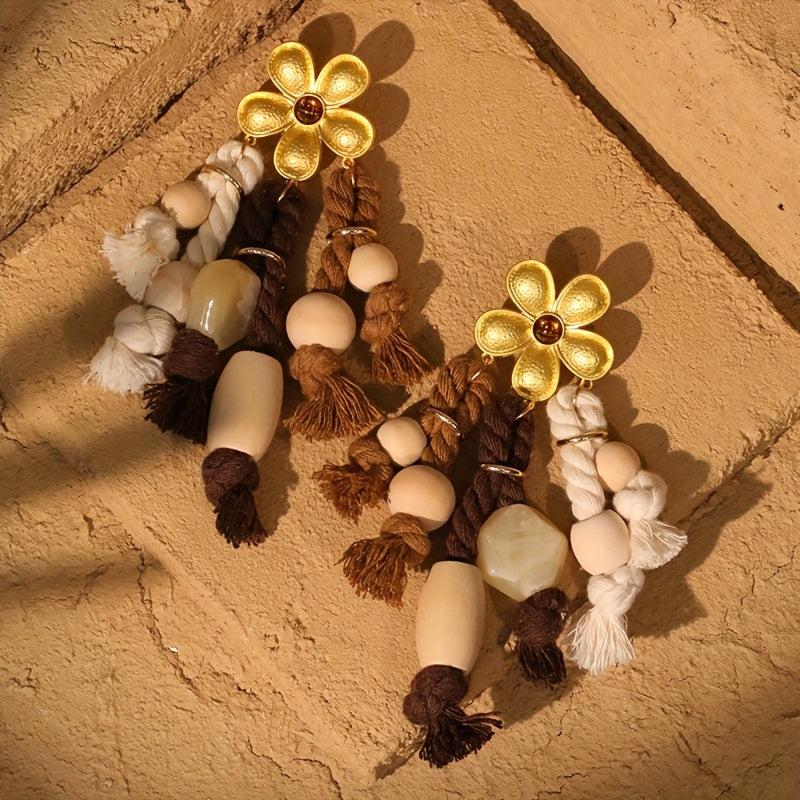 Elevate your style with these boho flower and tassel earrings featuring wooden beads. Vintage-inspired design made from quality stainless steel.