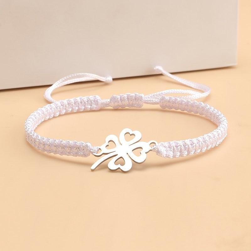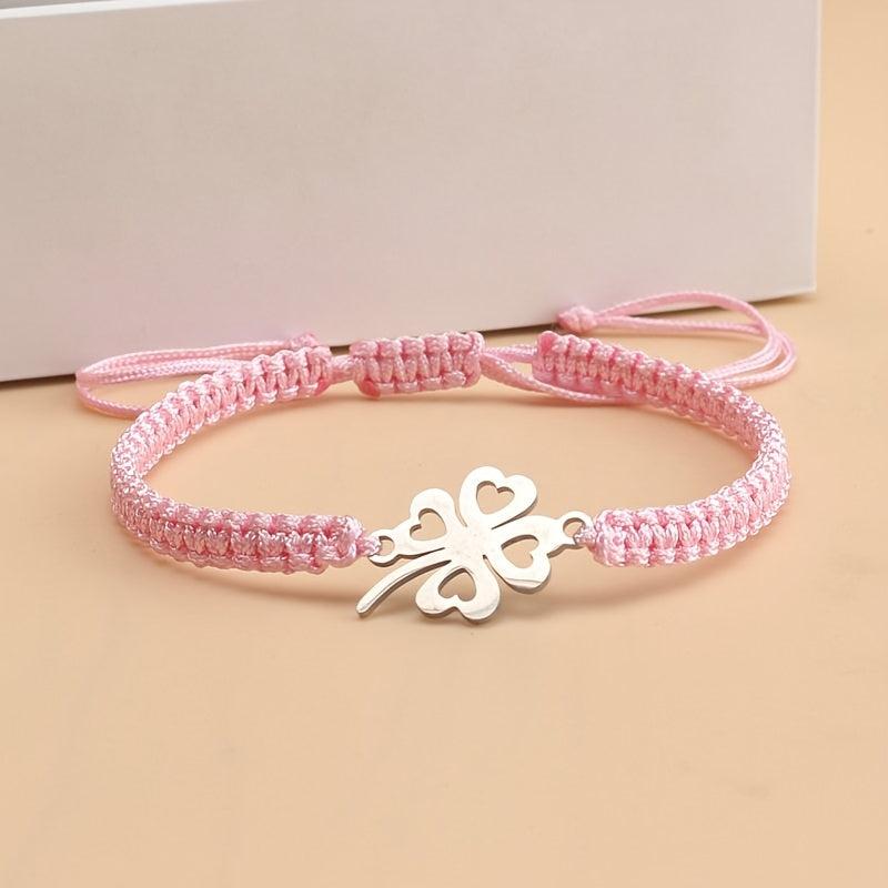 This boho stainless steel bracelet features a four leaf clover charm on handwoven nylon rope, making it a perfect inspirational gift for women, ideal for Valentine's or Mother's Day.