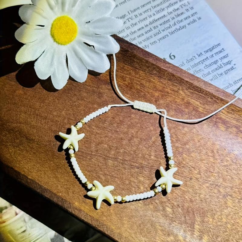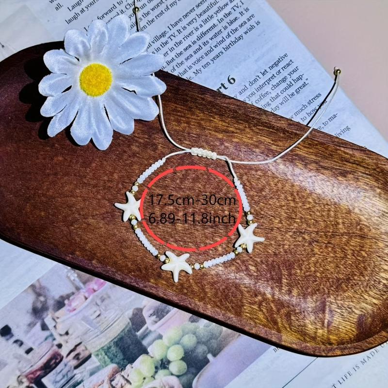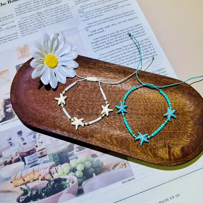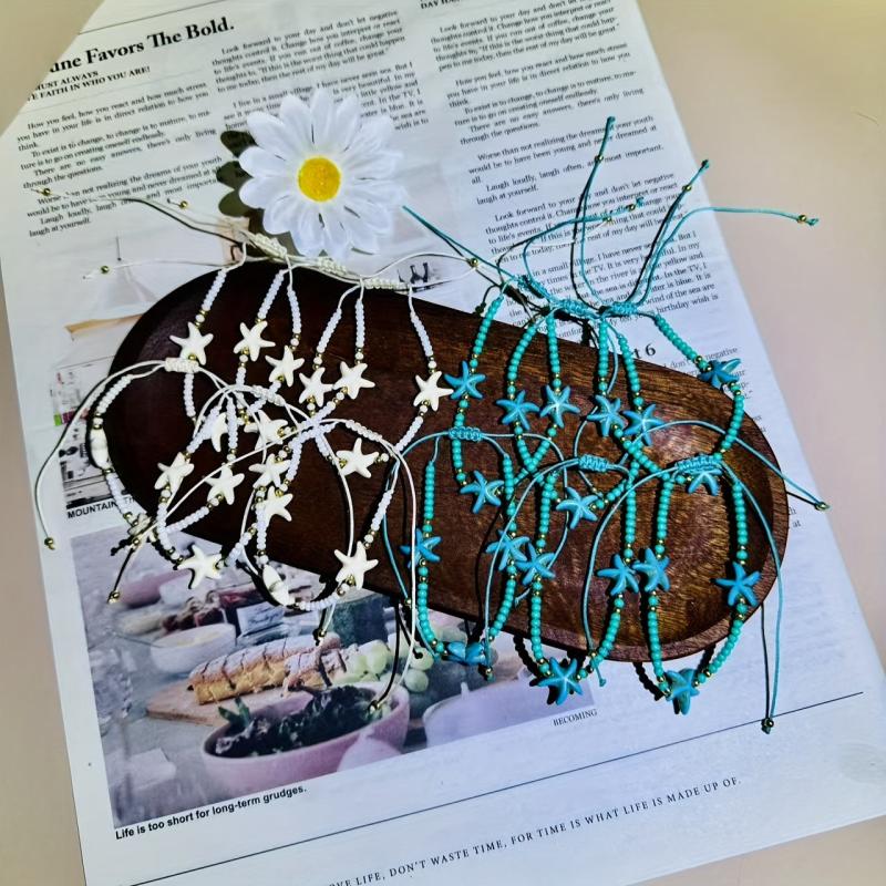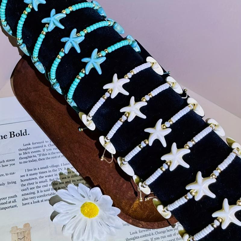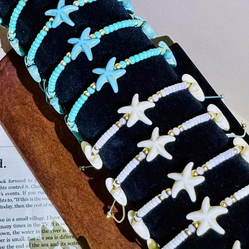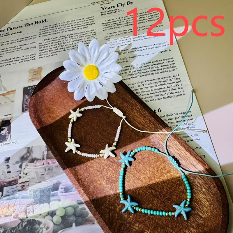 Complete your beach vacation look with this 12-piece boho jewelry set featuring synthetic turquoise, starfish charms, and beaded bracelets. Perfect for daily wear and adding a touch of luck to your outfit.