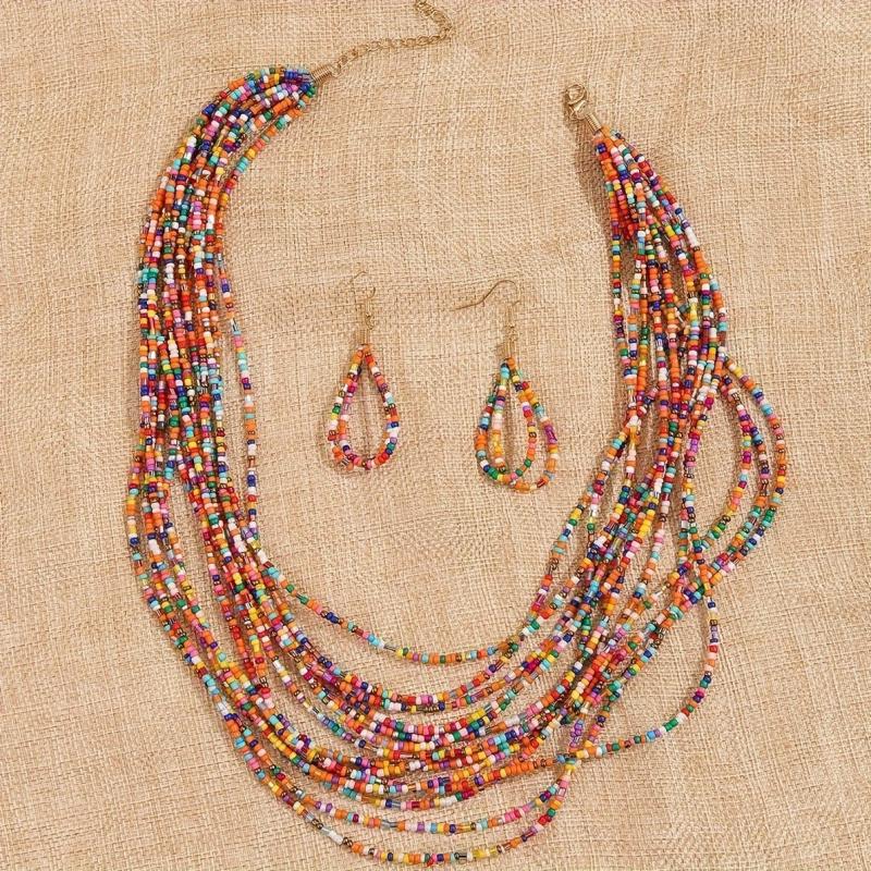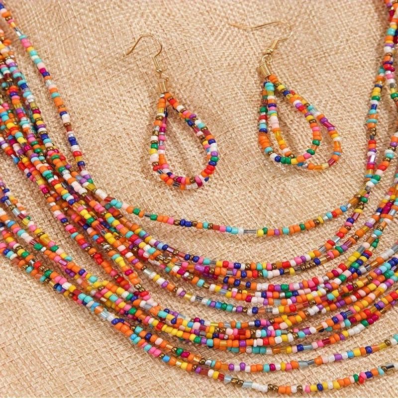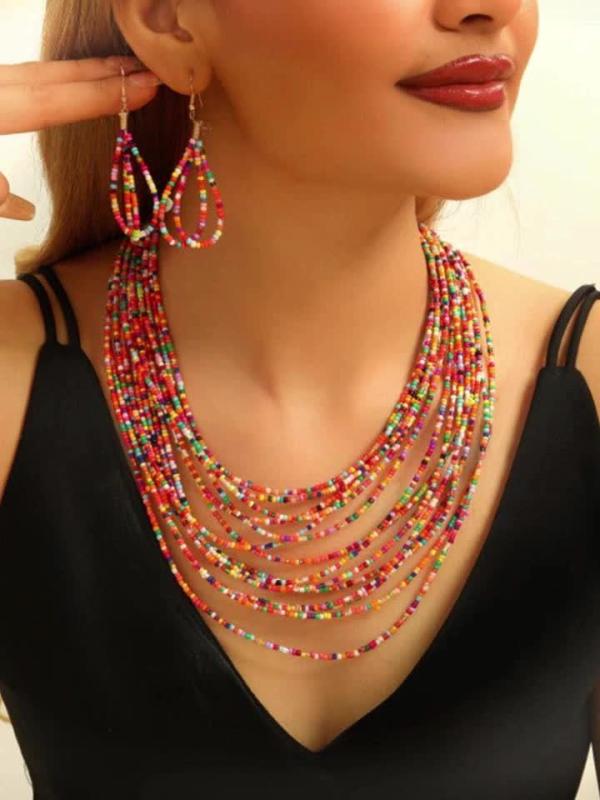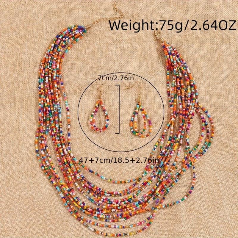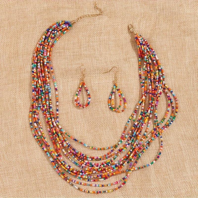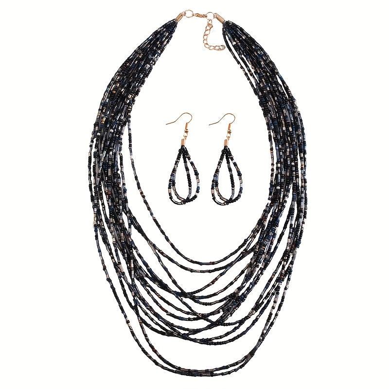 Elevate your style with this bohemian vintage bead necklace and earring set. The layered design adds a versatile accessory to your wardrobe.