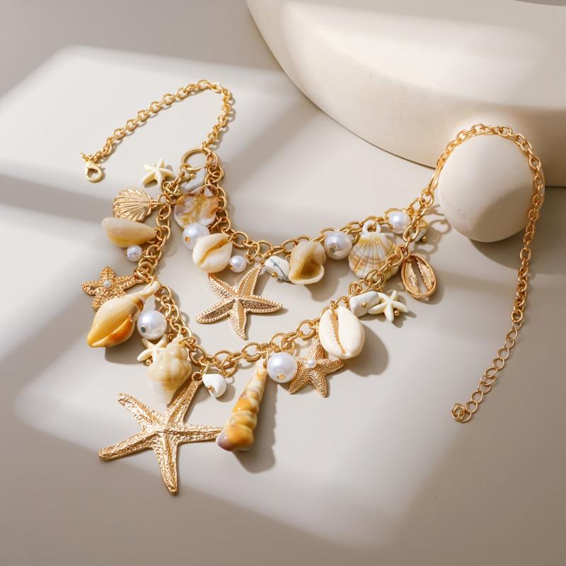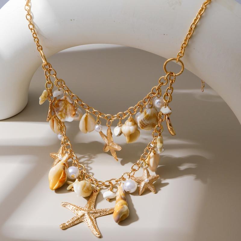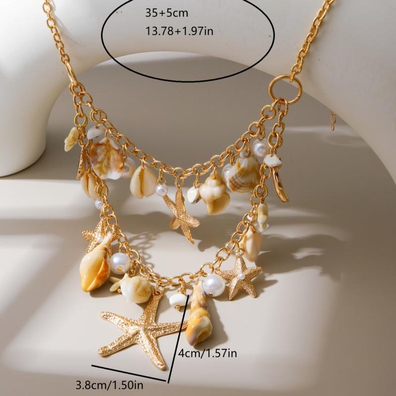 Enhance your beach vacation look with this stylish bohemian layered necklace featuring a golden ocean theme starfish and shell pendant. The acrylic double layer tassel chain adds a touch of elegance to your party ensemble.