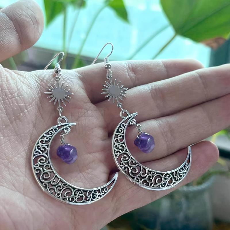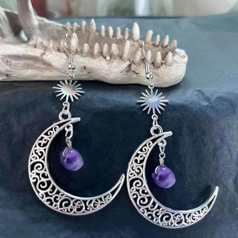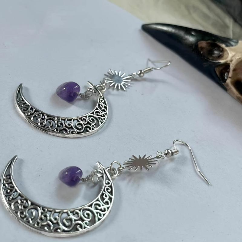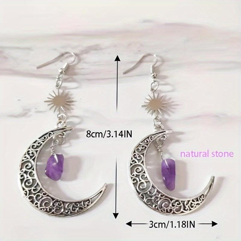 Vintage-inspired drop earrings featuring crescent moon and sun design with amethyst crystal accents. Zinc alloy construction with copper ear needle. Perfect for daily wear or as a gift.