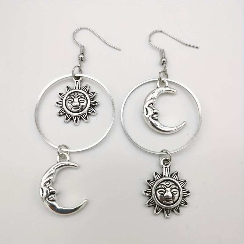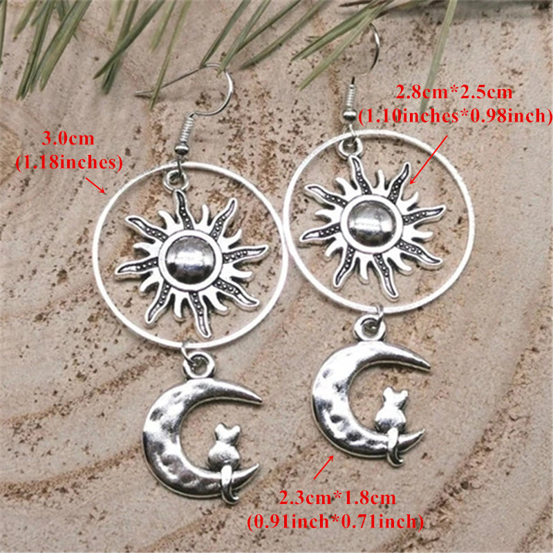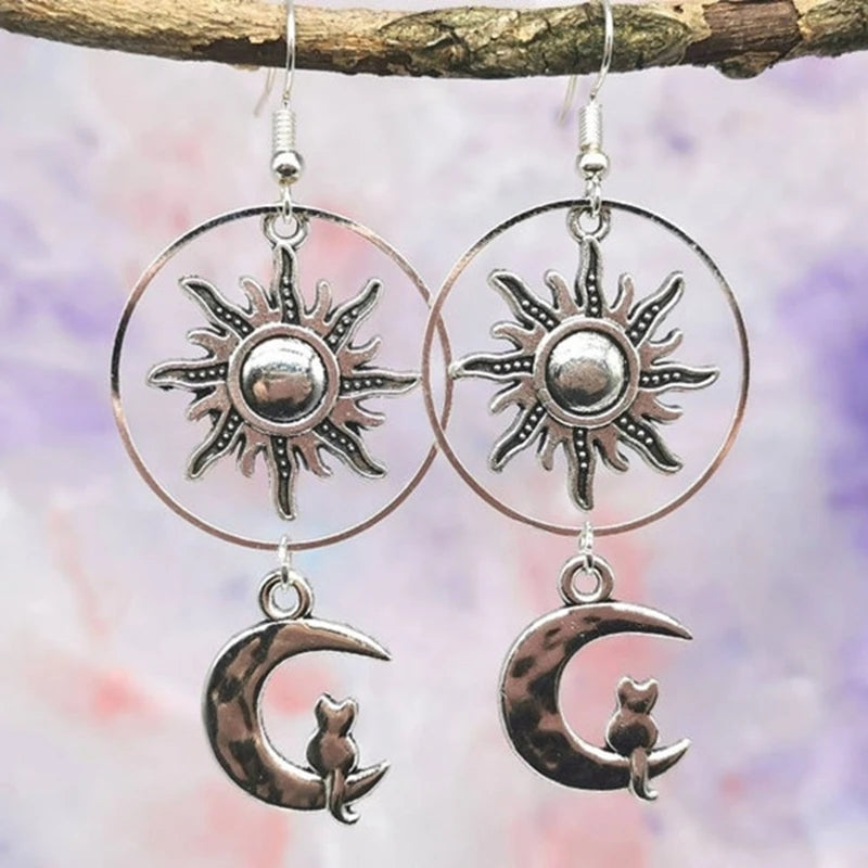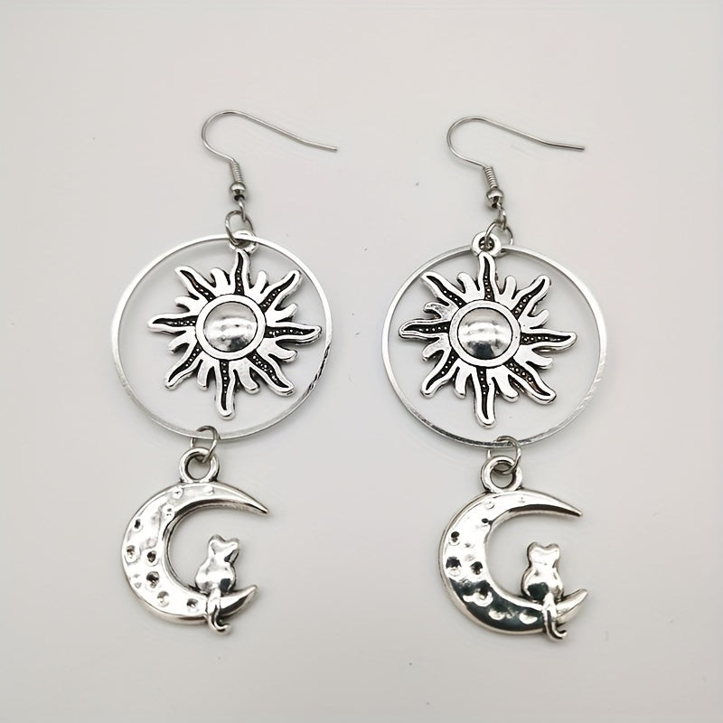 These unique dangle earrings feature a silvery sun, moon, and cat design, perfect for a boho style. Made of zinc alloy, they are a creative and eye-catching accessory. Ideal for female gift giving.