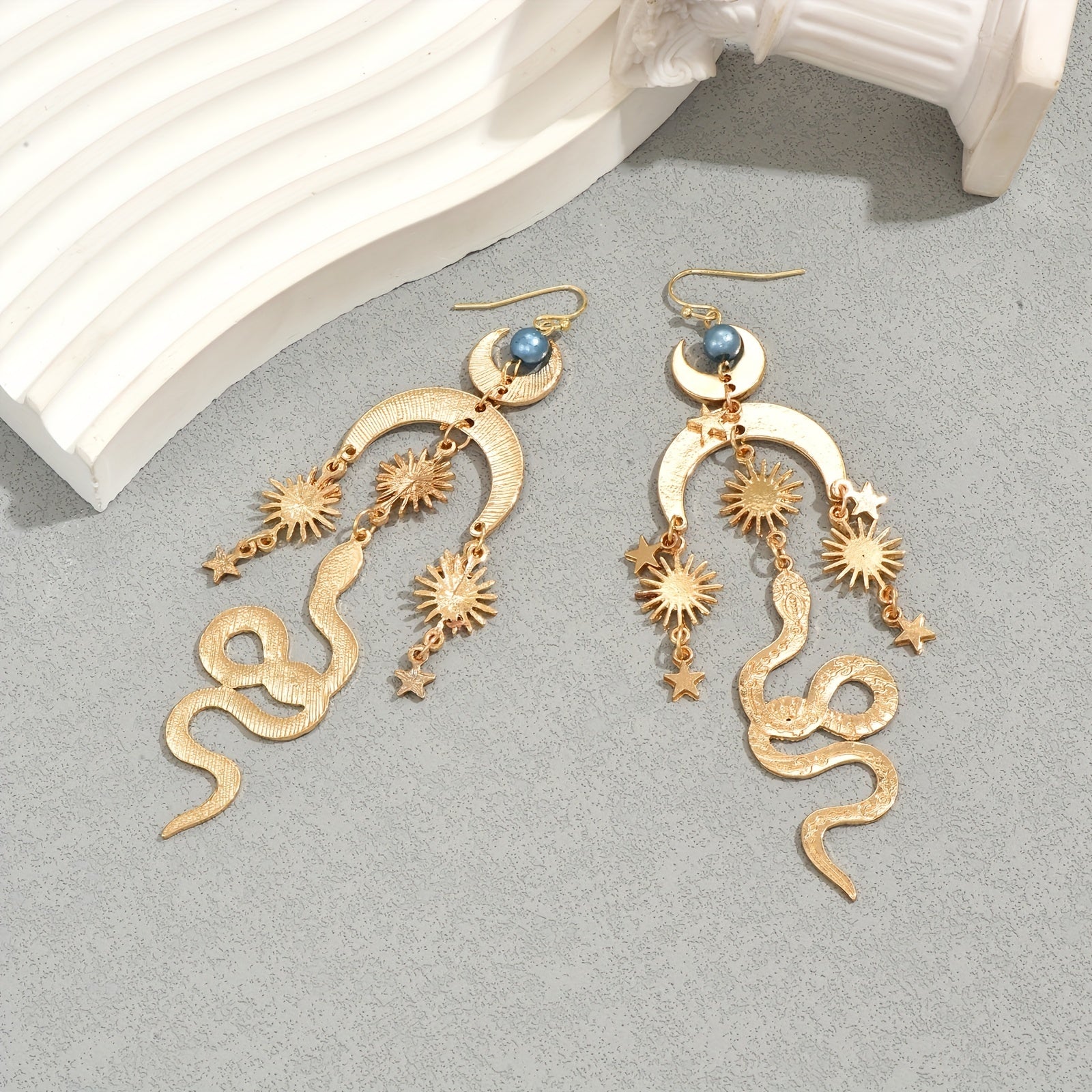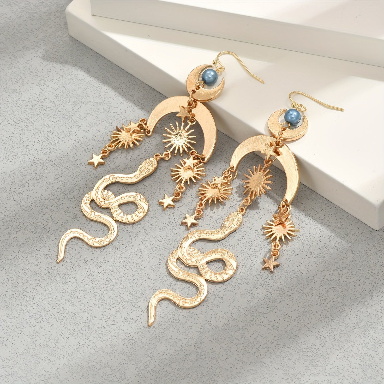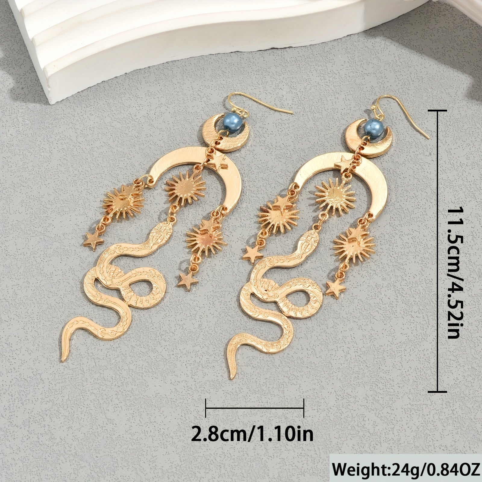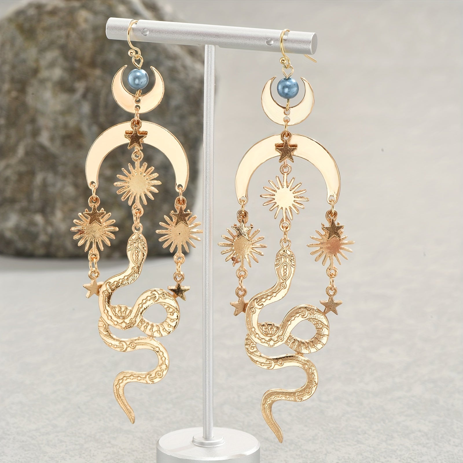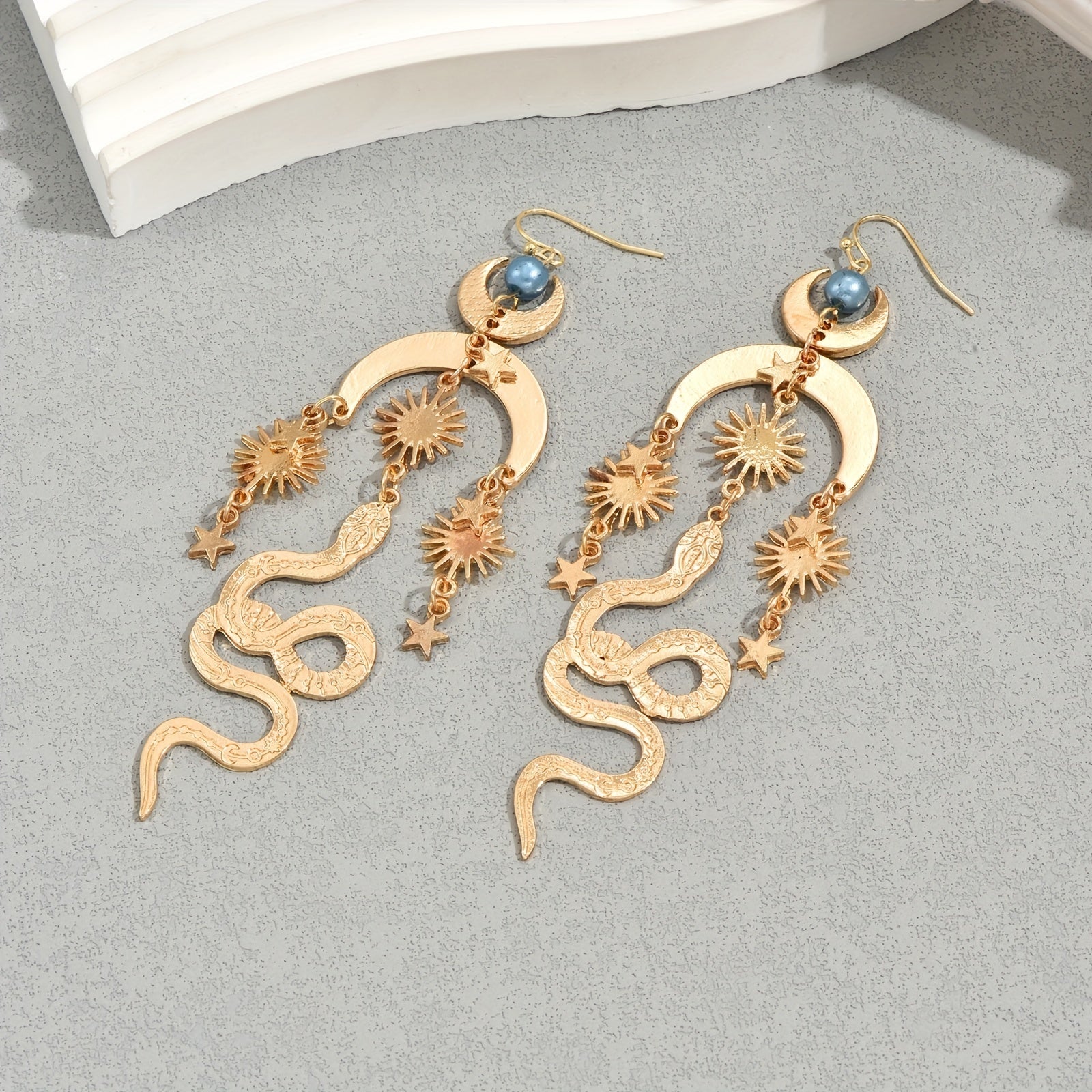 Elevate your ear game with these Zinc Alloy earrings featuring moon, sun, snake, and star charms in a boho hoop design.