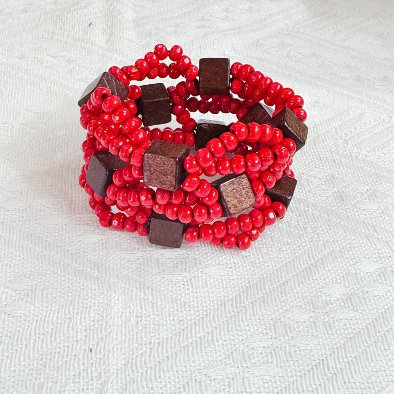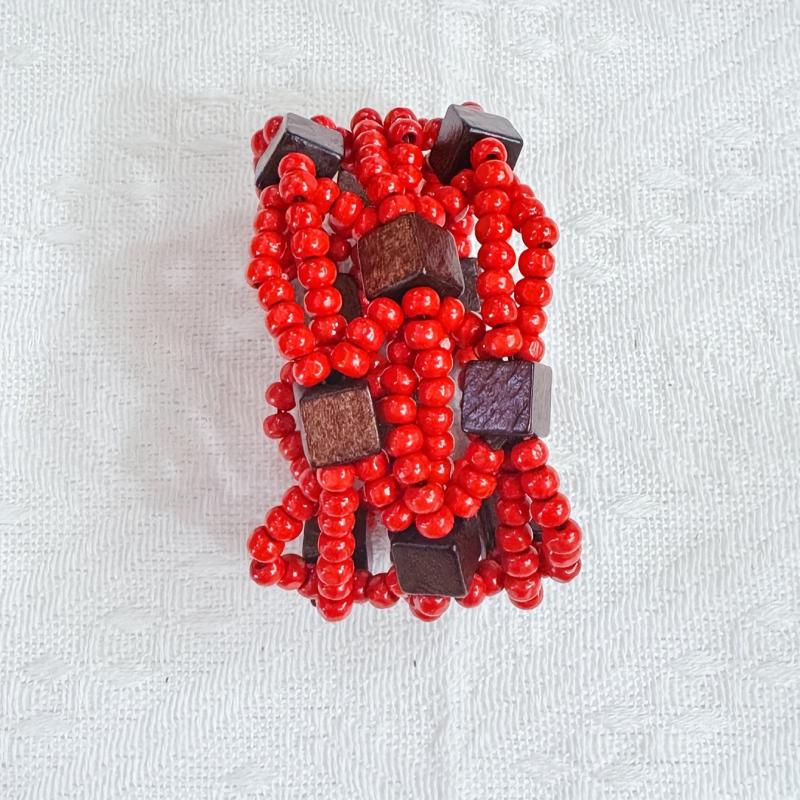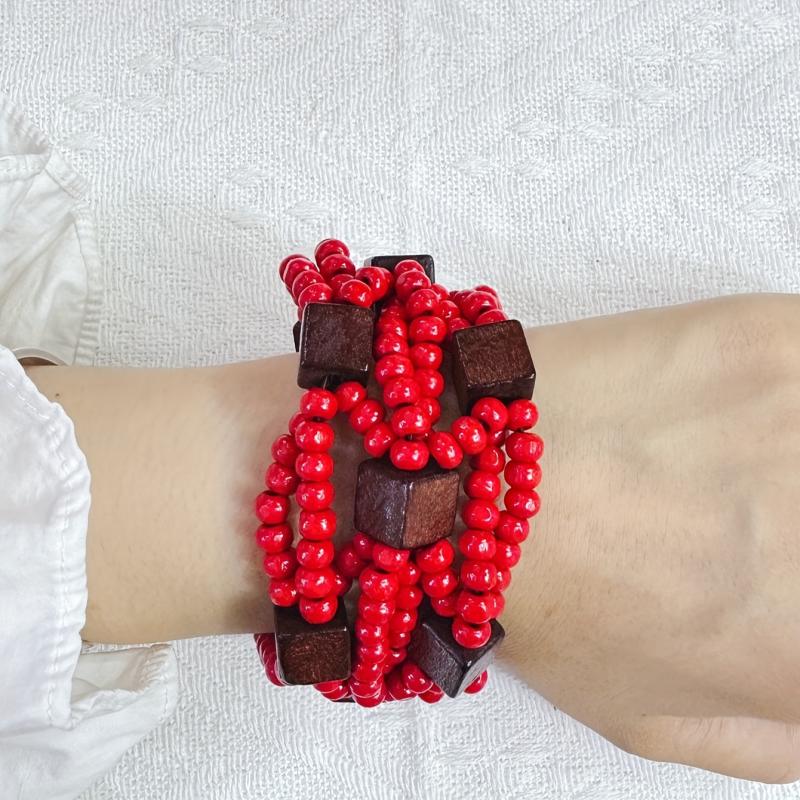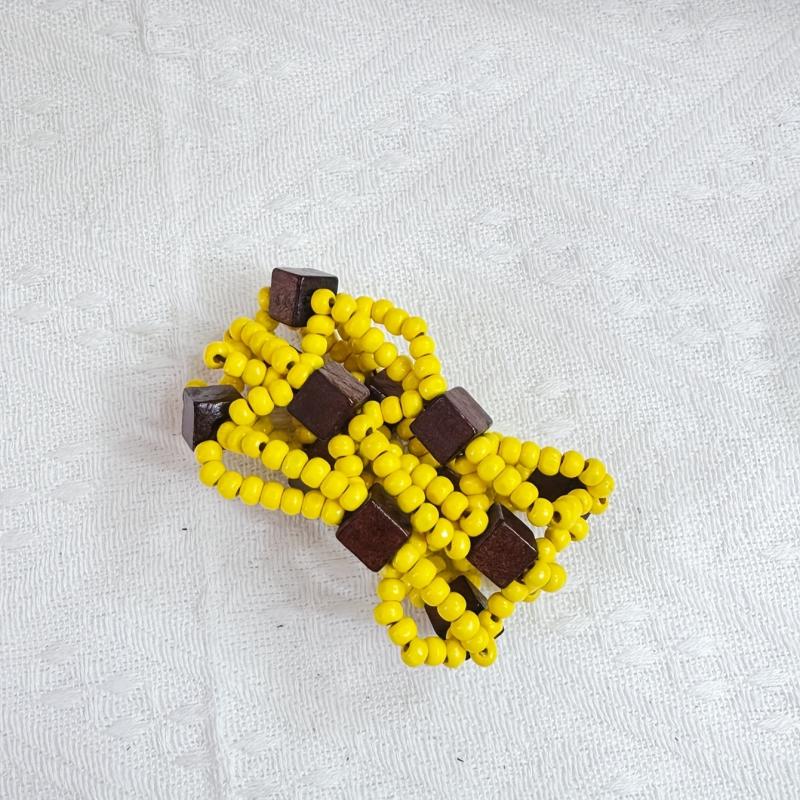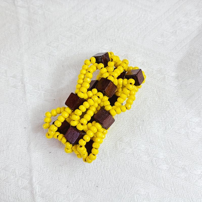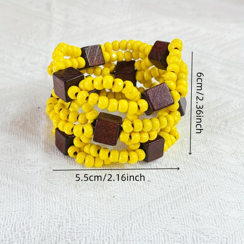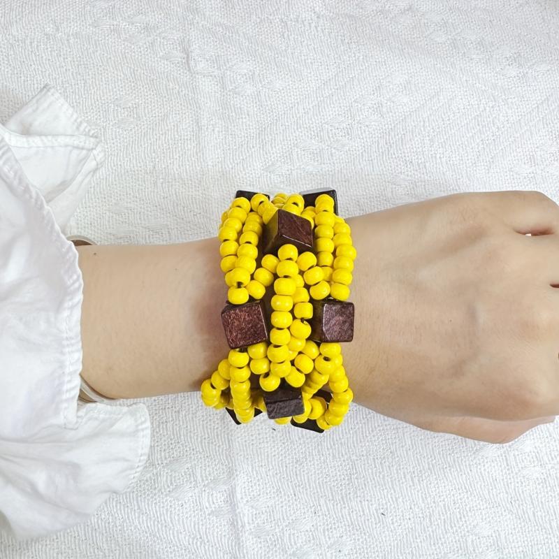 Handcrafted multilayer wooden beaded bracelet with vibrant yellow beads and accents in brown and red. This retro bohemian style accessory is perfect for casual attire or as a gift for women.