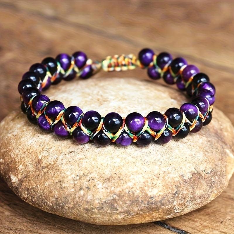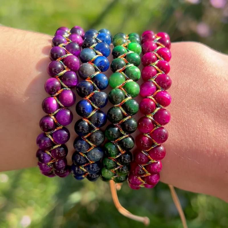 Elevate your style with this hand woven adjustable bracelet featuring natural stone beads like Cat's Eye and Tiger's Eye. Perfect for daily wear or holidays.