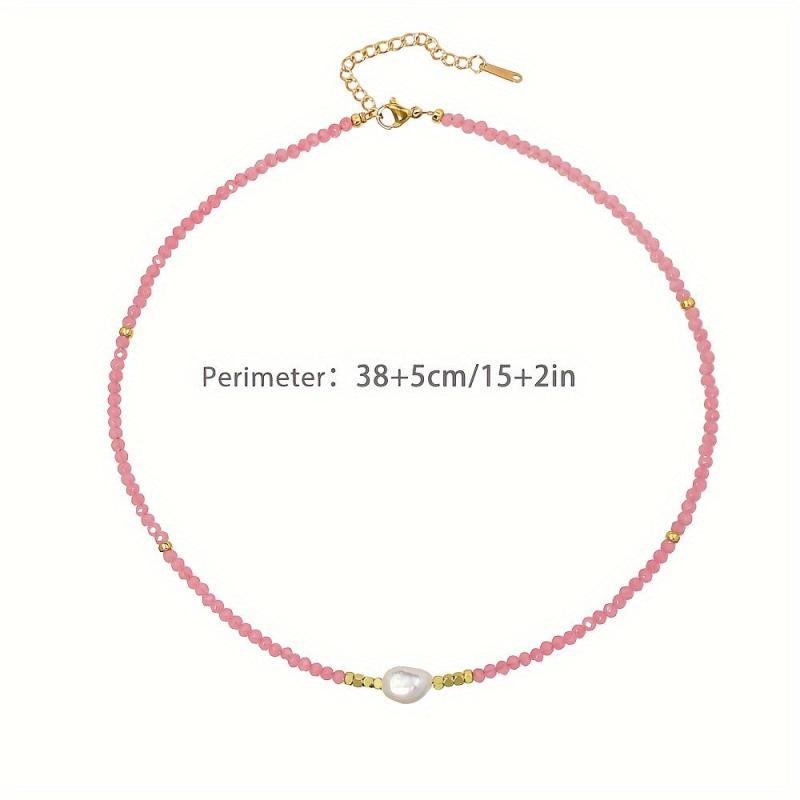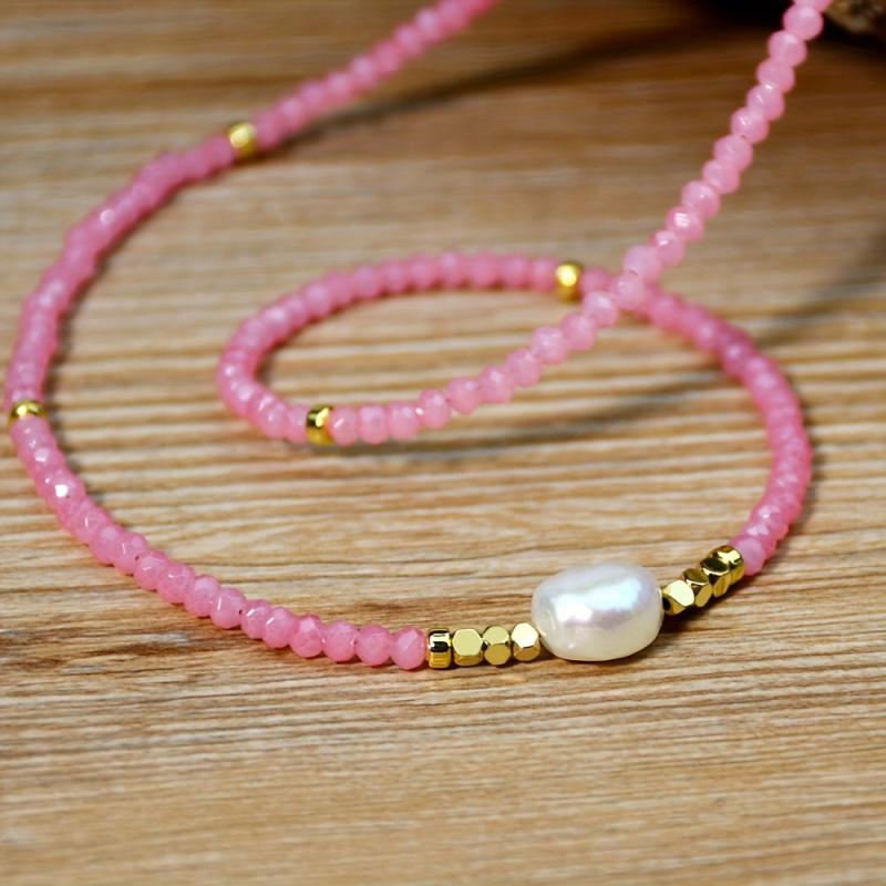 This exquisite necklace features a mix of synthetic pink pearls and genuine freshwater pearls with golden tone spacers. The elastic stretchy chain makes it easy to wear for all occasions.