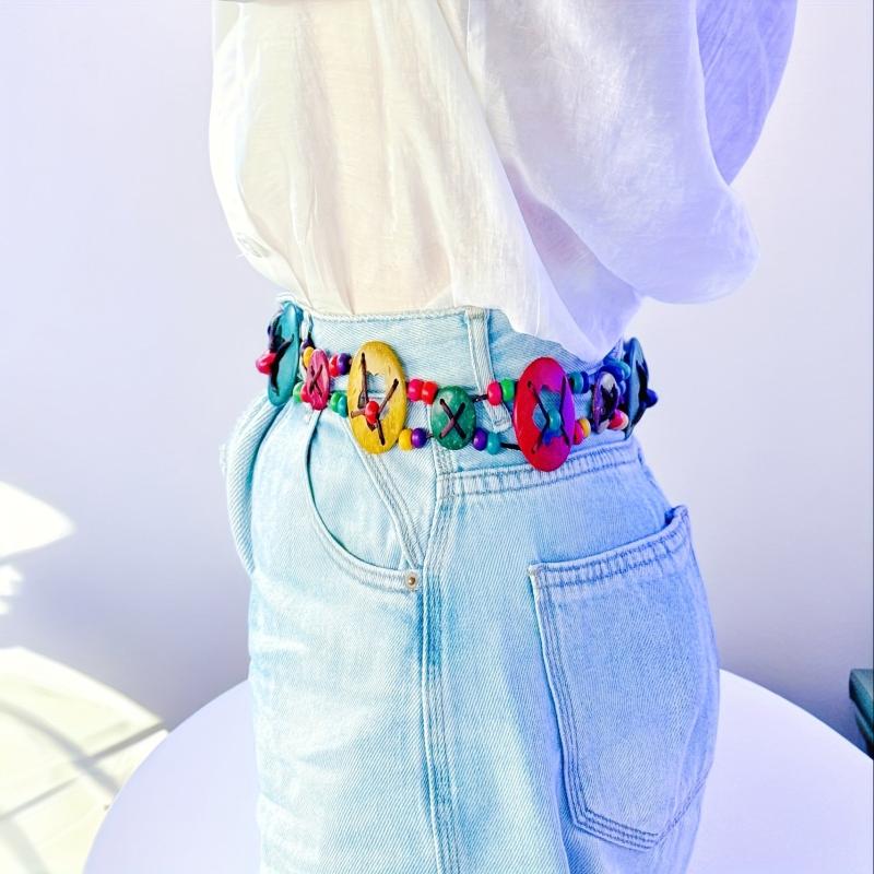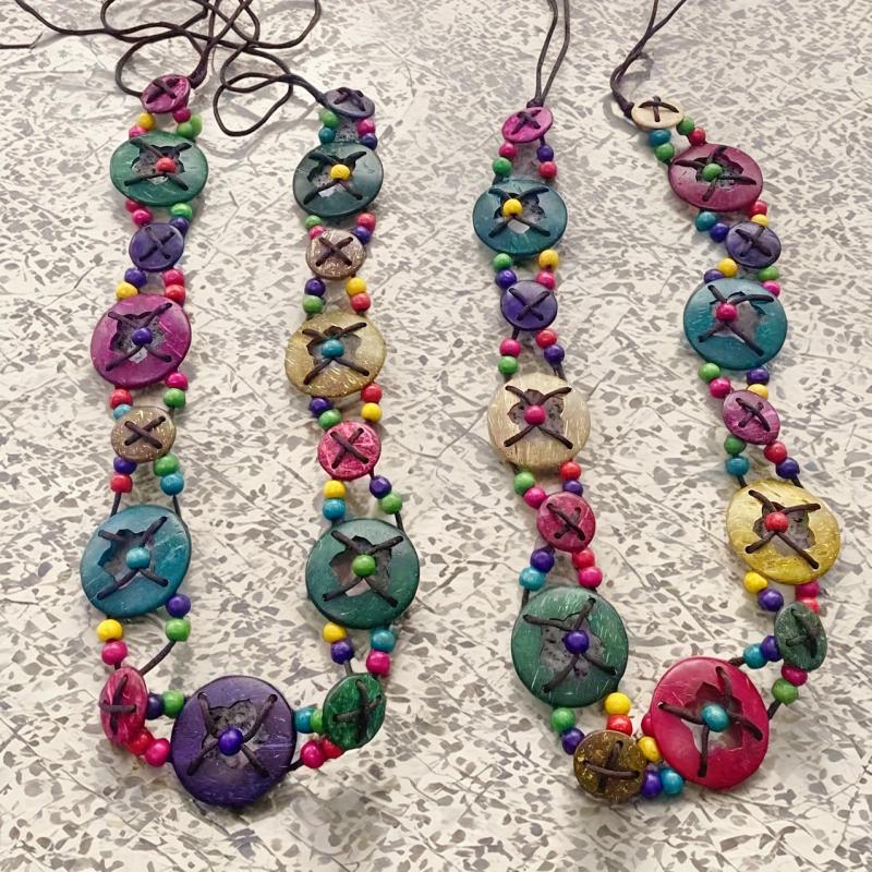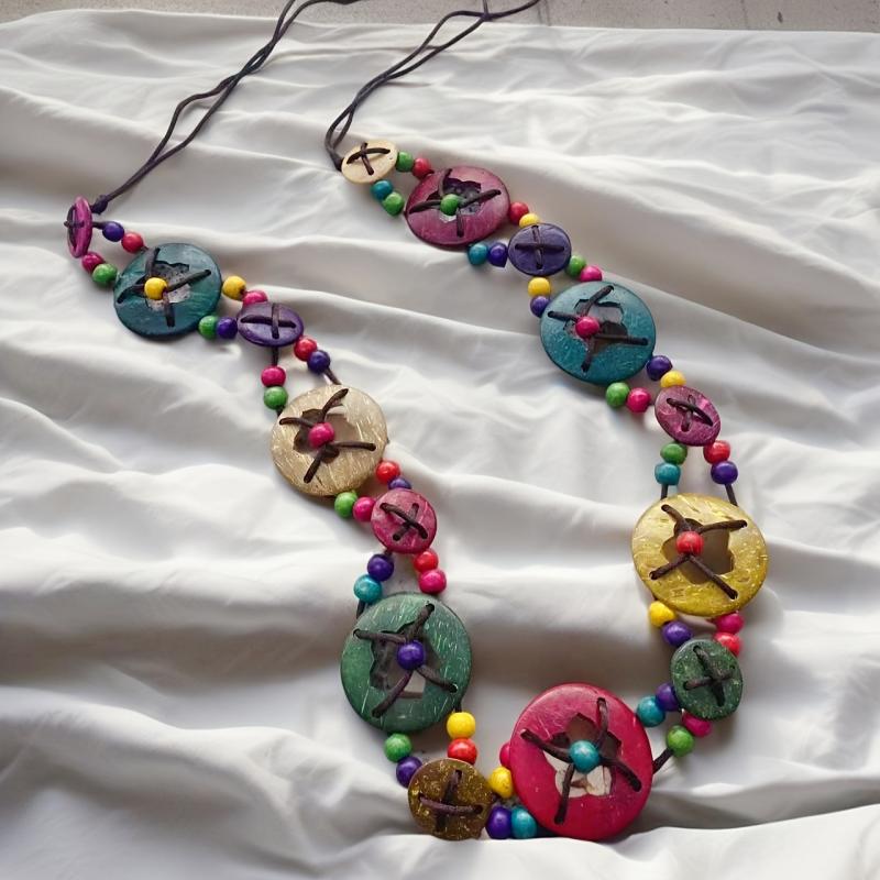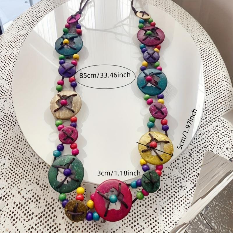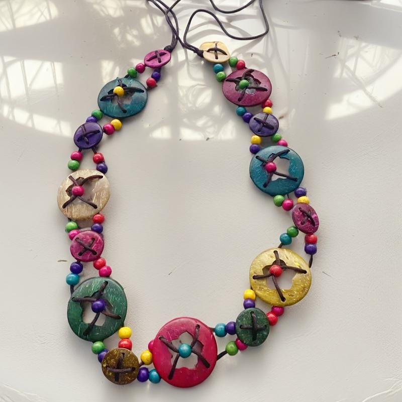 This bohemian rainbow necklace features natural recycled coconut wood beads and vibrant colorful bead accents. Perfect for casual attire or as a gift for women who love unique jewelry.