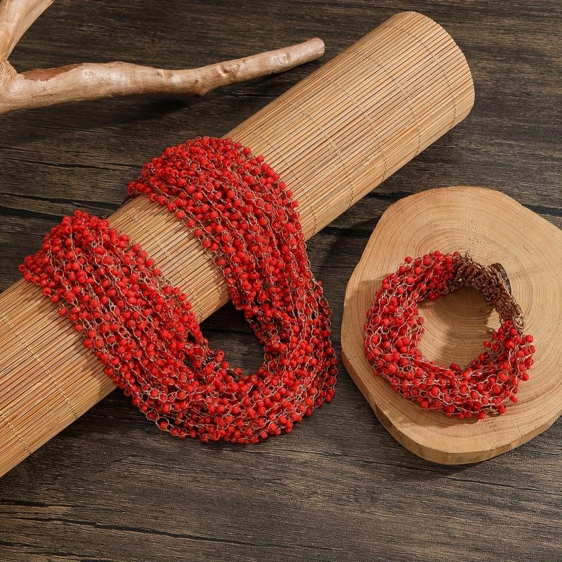 Boho Red Beaded Jewelry Set Necklace & Bracelet
