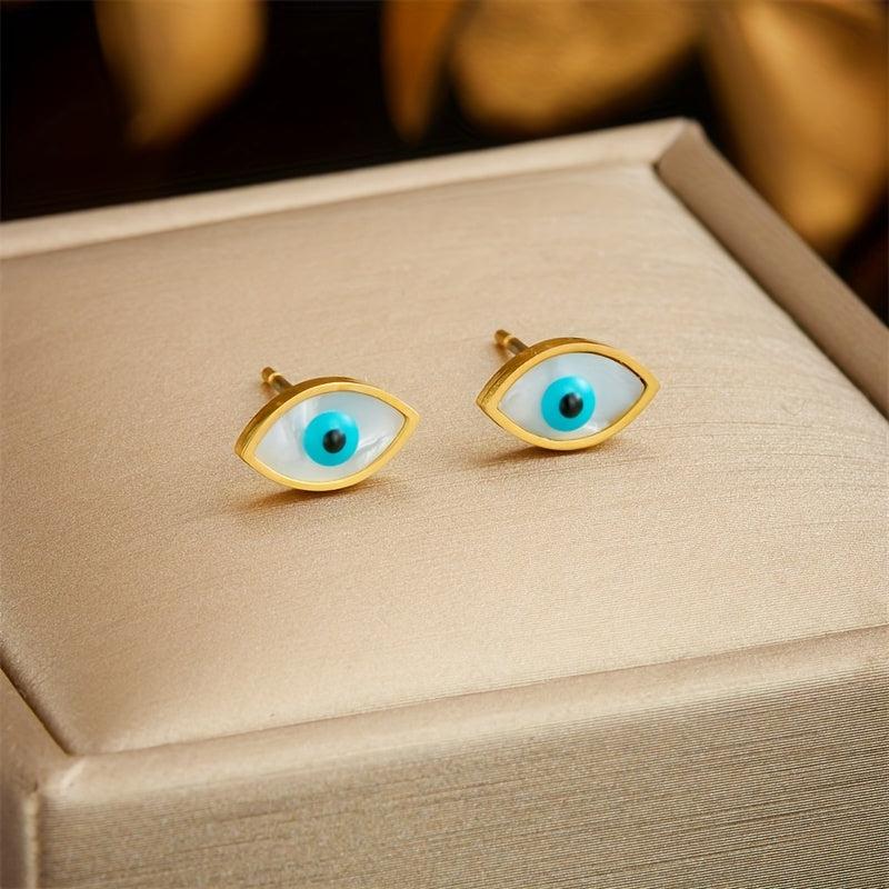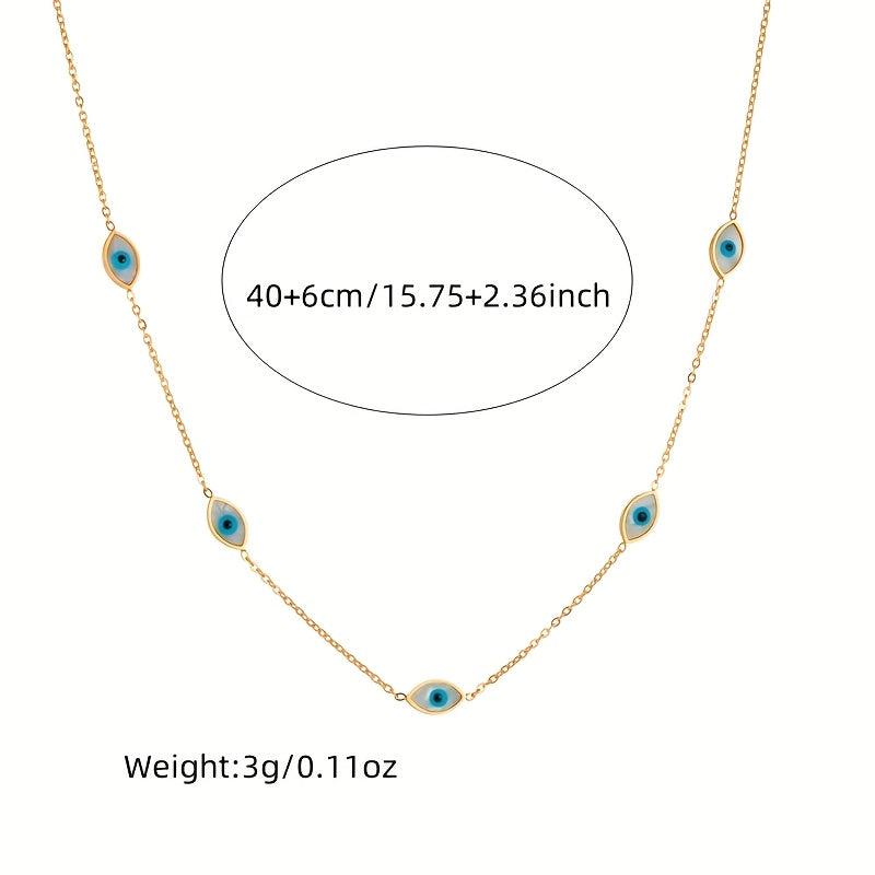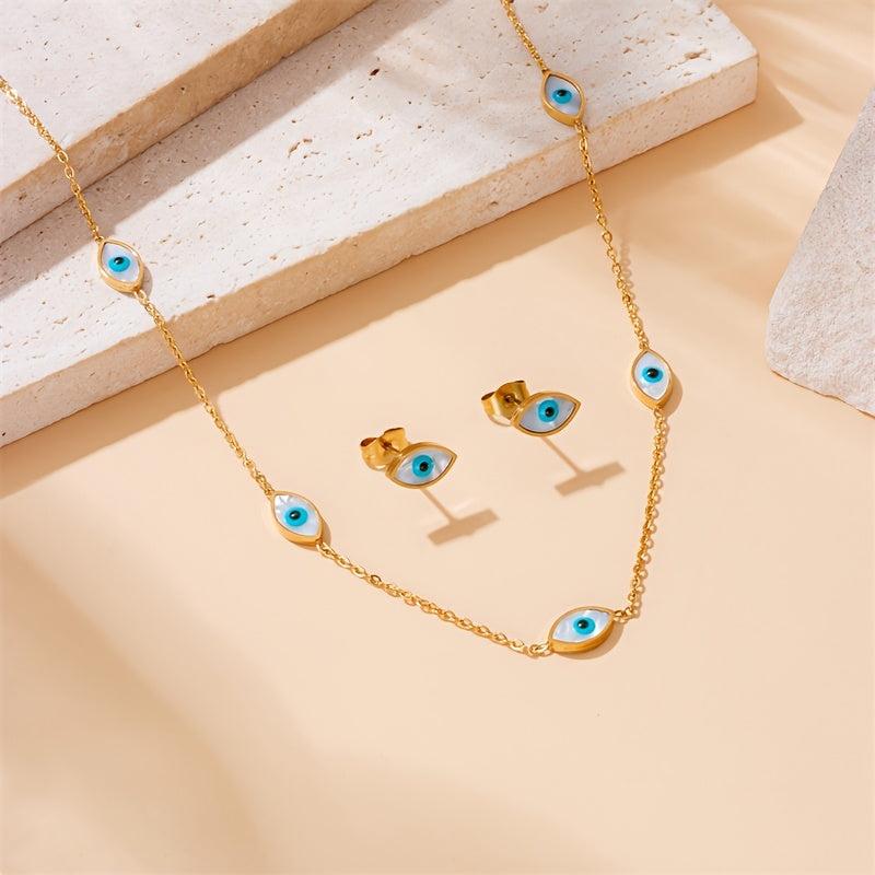 Make a statement with this Bohemian retro minimalist eye necklace and earring set featuring golden stainless steel.