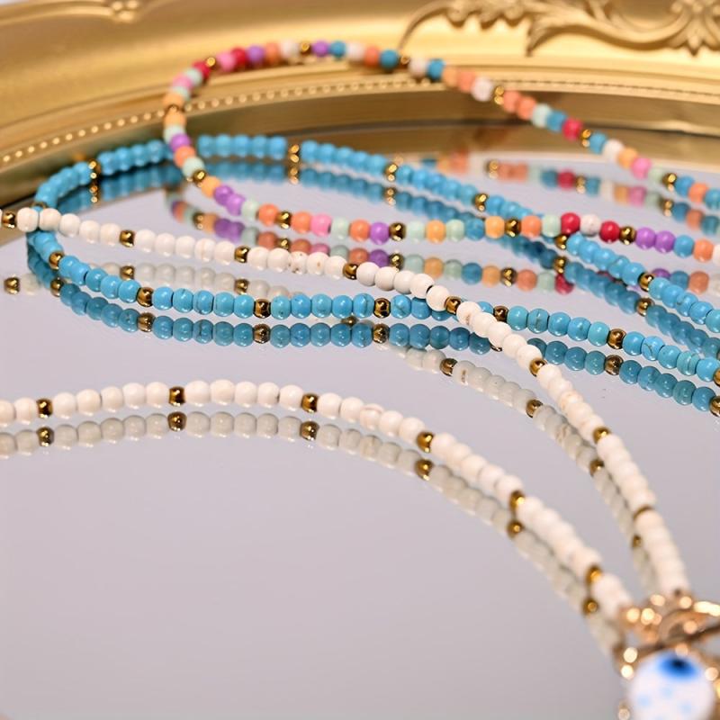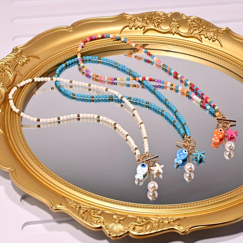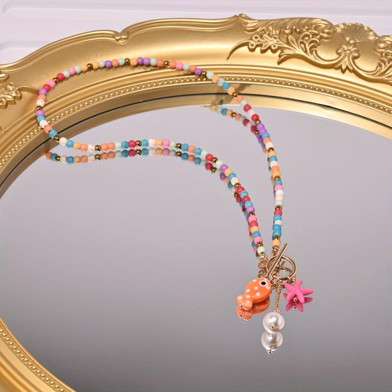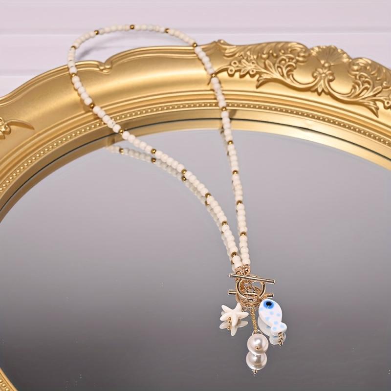 Embrace the beach vibe with this lightweight necklace featuring ceramic fish and starfish pendants, synthetic turquoise beads, faux accents, and golden tone spacers. Perfect for a bohemian sea-inspired look.