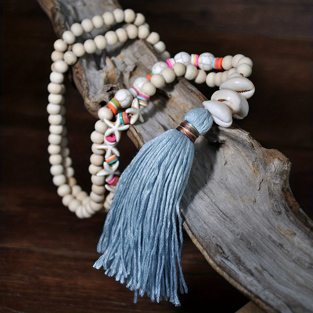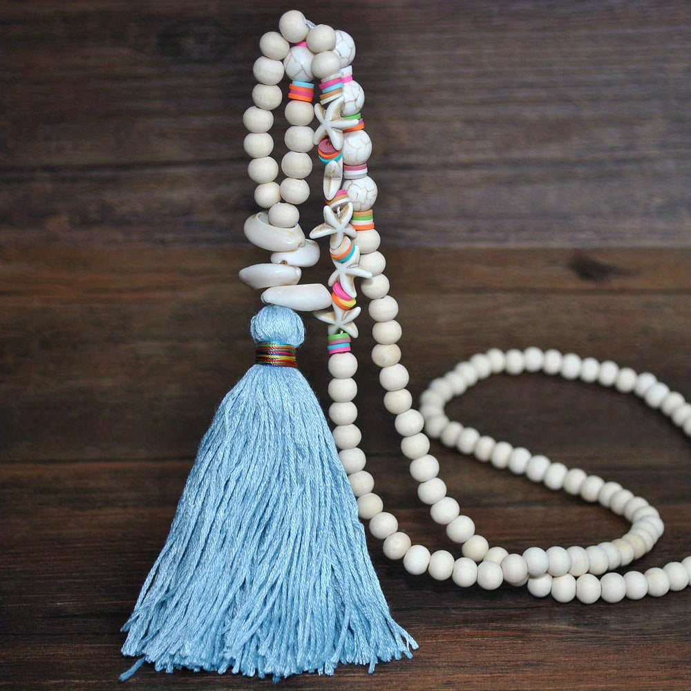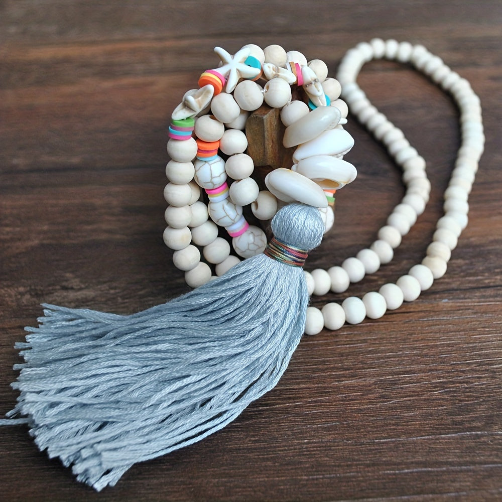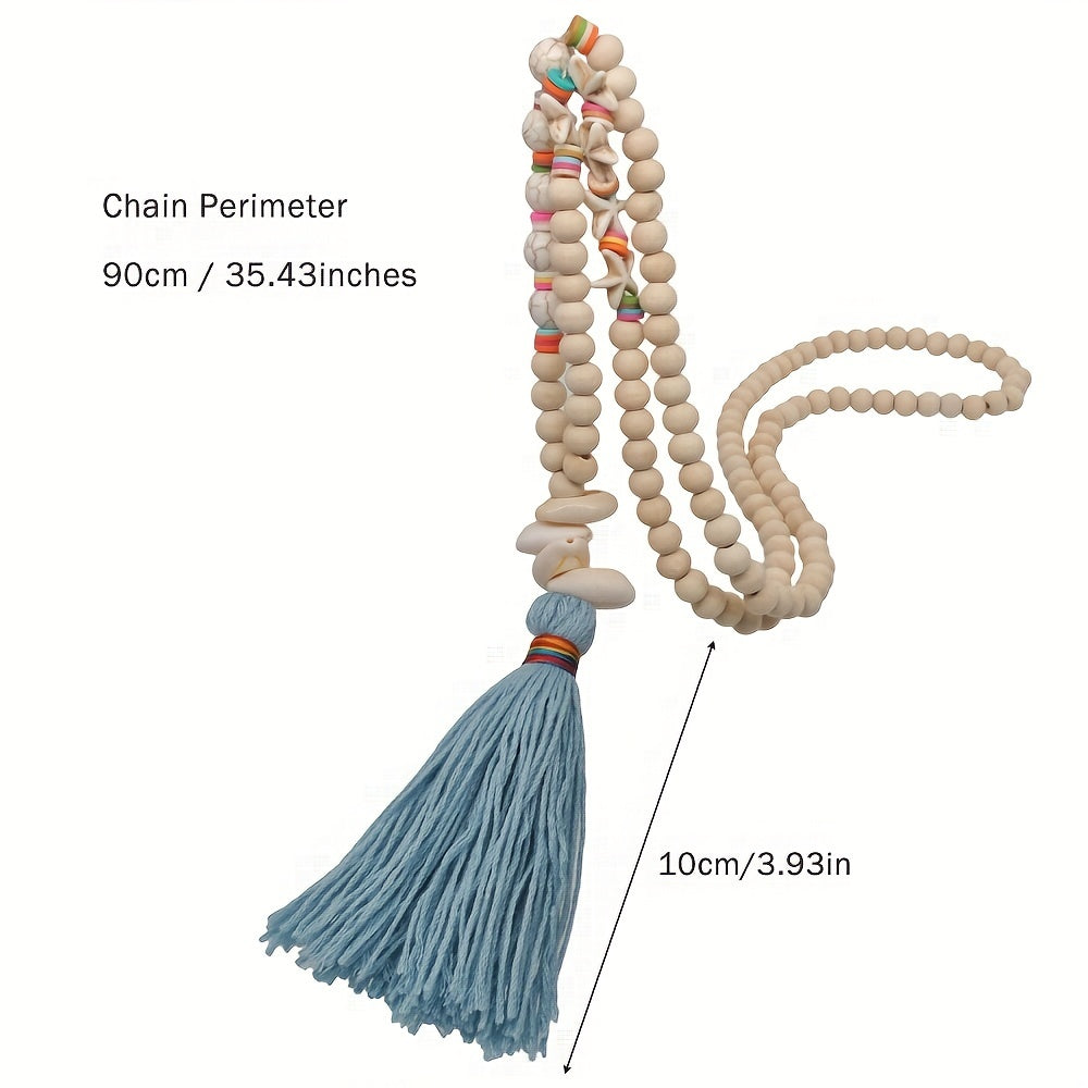 Elevate your style with this boho chic necklace featuring a soft clay stone pendant, shell accents, and tassel details. Perfect for adding a touch of beachy vibes to your outfit.