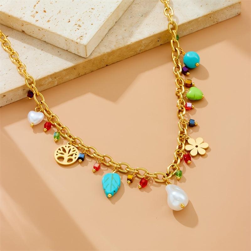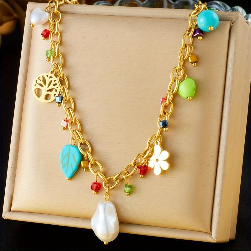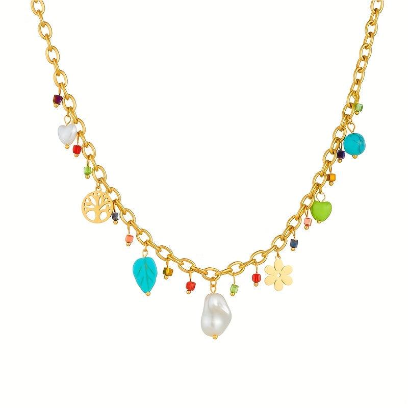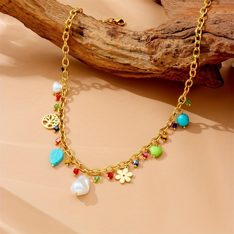 Stylish stainless steel necklace featuring a tree of life pendant with colorful beads and flower charm. Perfect for summer outings, parties, and casual wear.