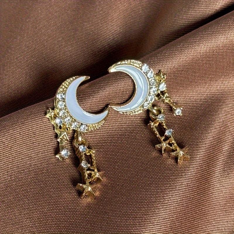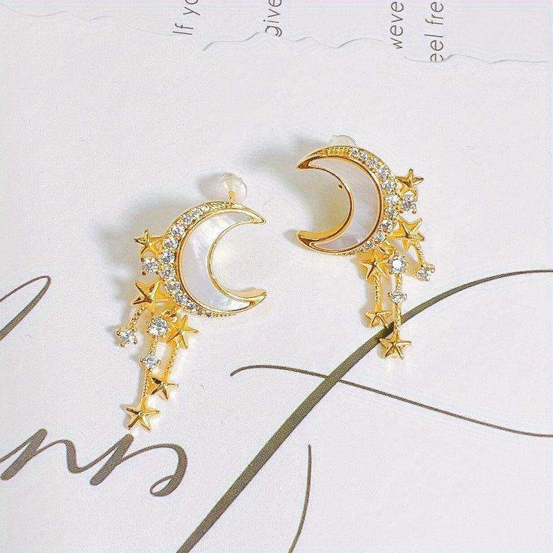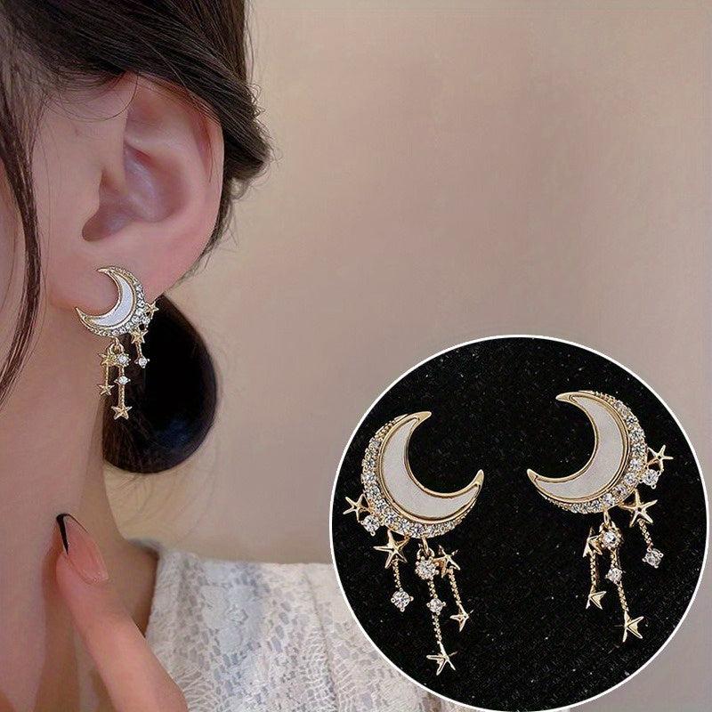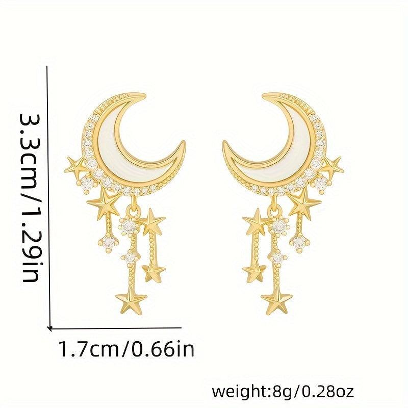 These elegant dangle earrings feature a boho design with star and moon charms, made of 925 silvery alloy with rhinestone accents. Perfect for daily wear or parties.
