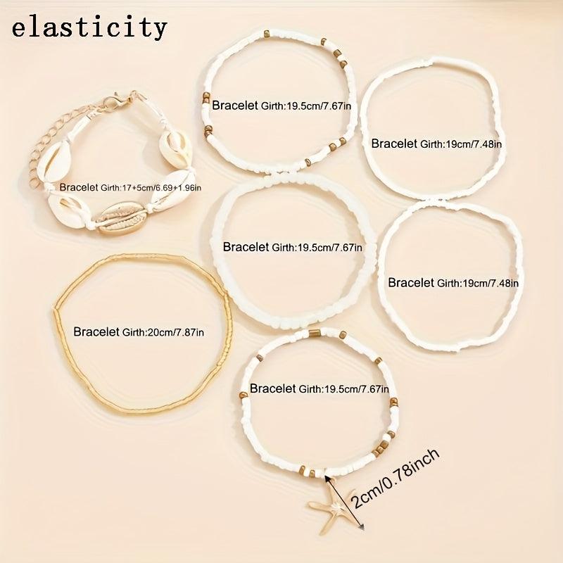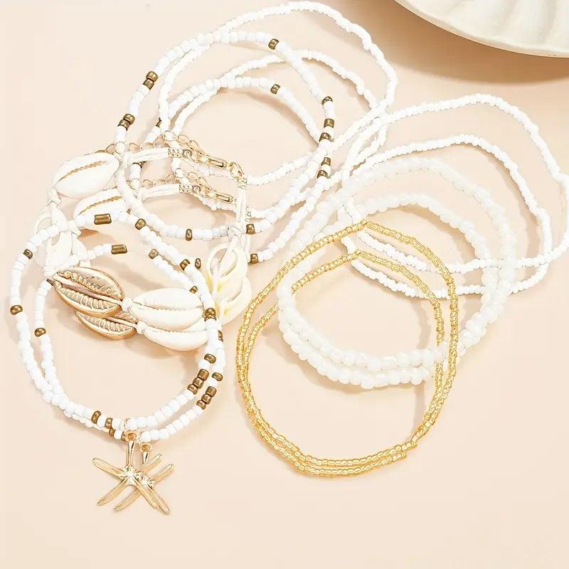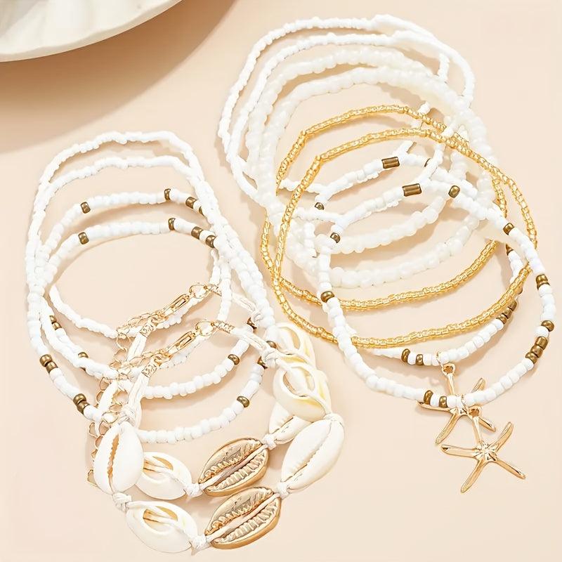 Elevate your daily wear and beach vacation look with this charming boho starfish beaded bracelet set featuring golden tone charms.