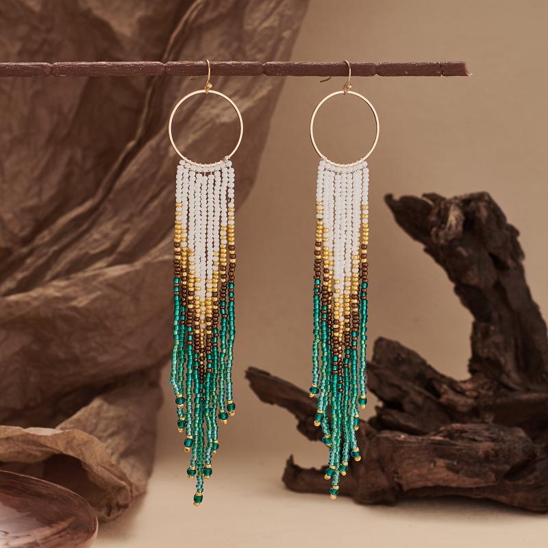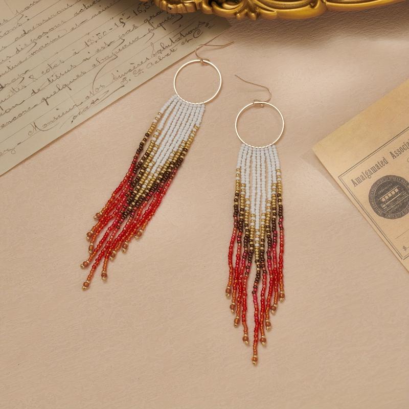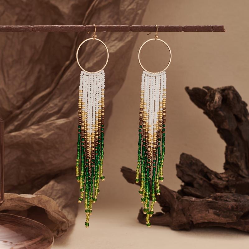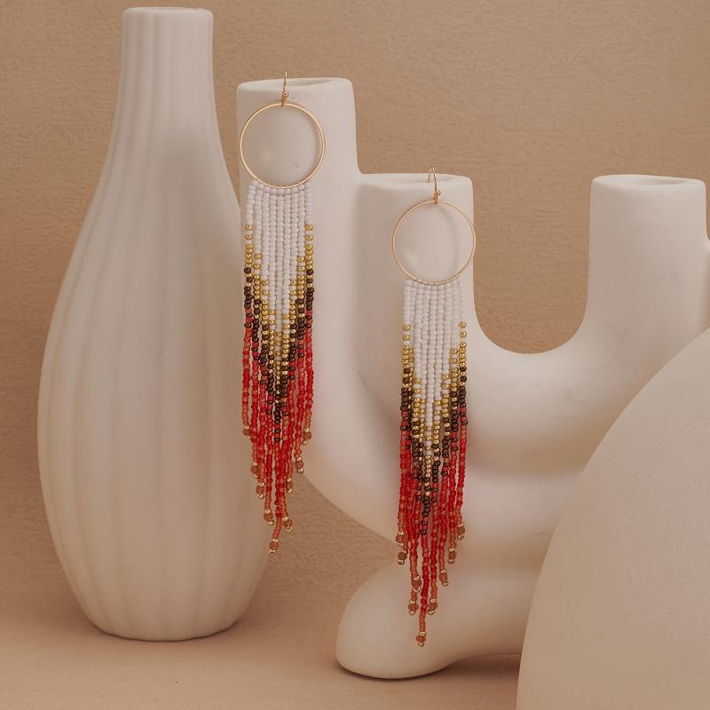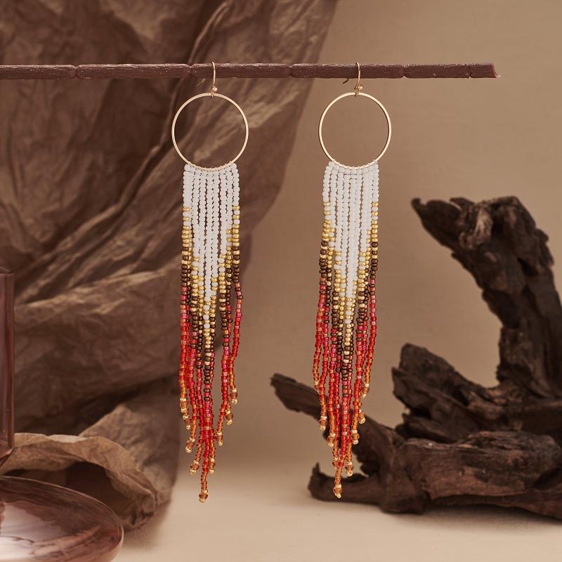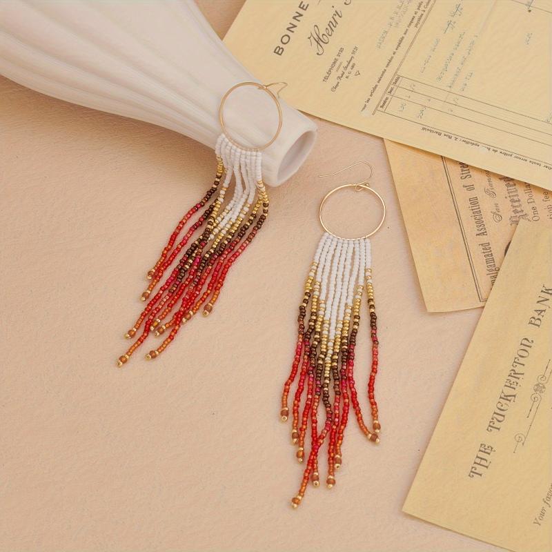 Elevate your vacation look with these handcrafted gradient beaded earrings featuring a metal tassel dangle. Perfect for adding a touch of bohemian flair to your outfit.