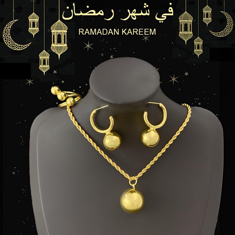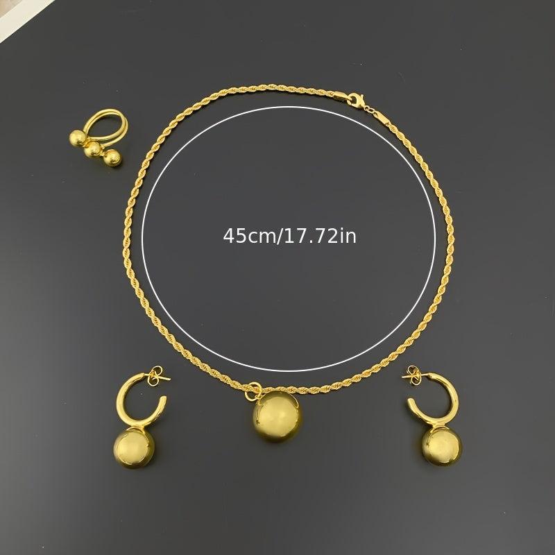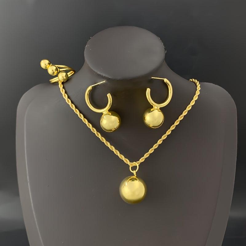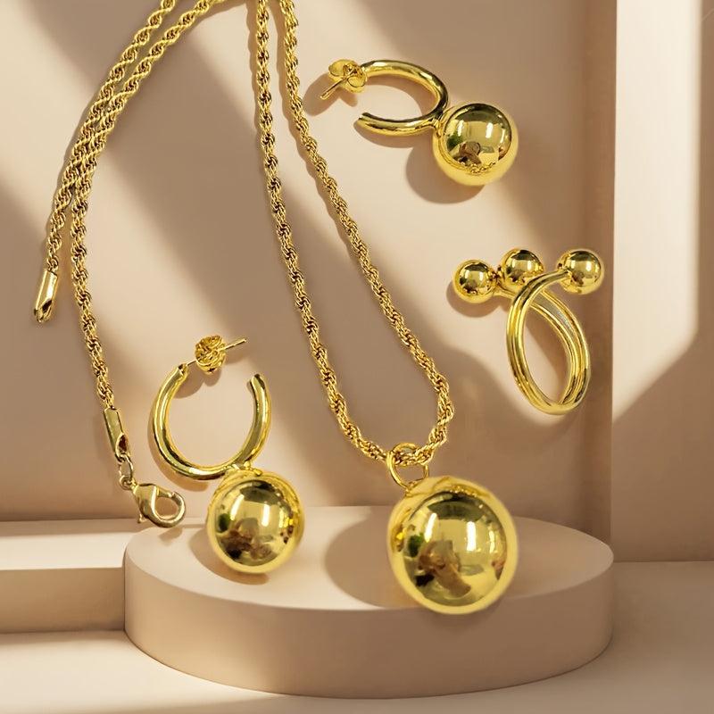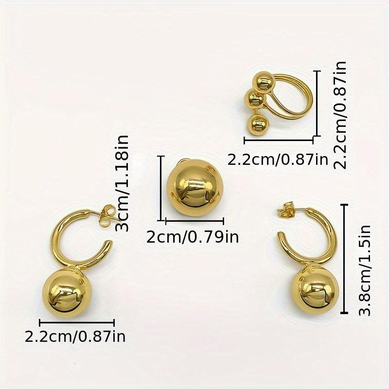 This boho style jewelry set includes three pieces of 18K golden plated accessories: an adjustable ring and earings. Perfect for adding a touch of charm to your outfit.