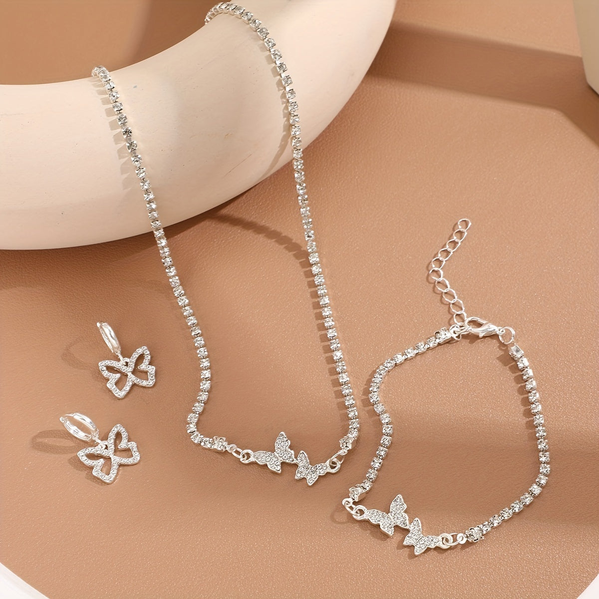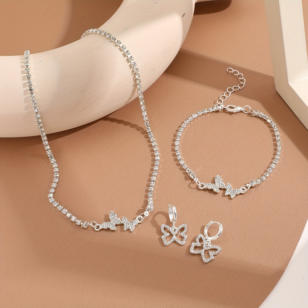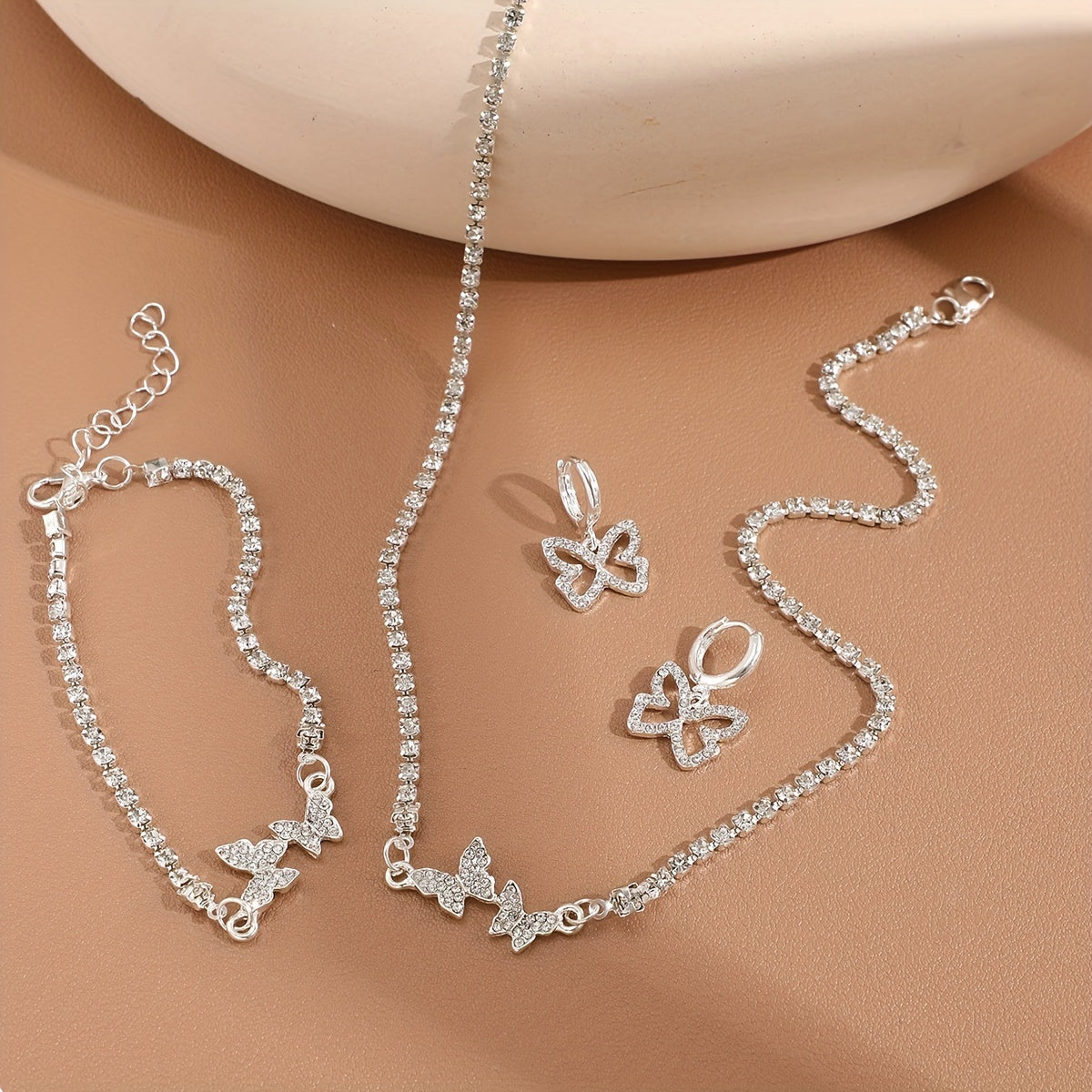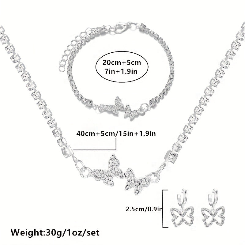 This jewelry set includes 4pcs earrings, bracelet, and necklace with inlaid rhinestone butterfly design, perfect for daily wear. It is a dainty and stylish birthday gift for anyone who loves bohemian fashion.