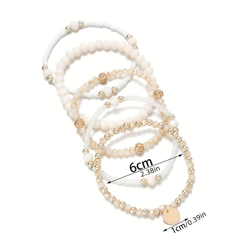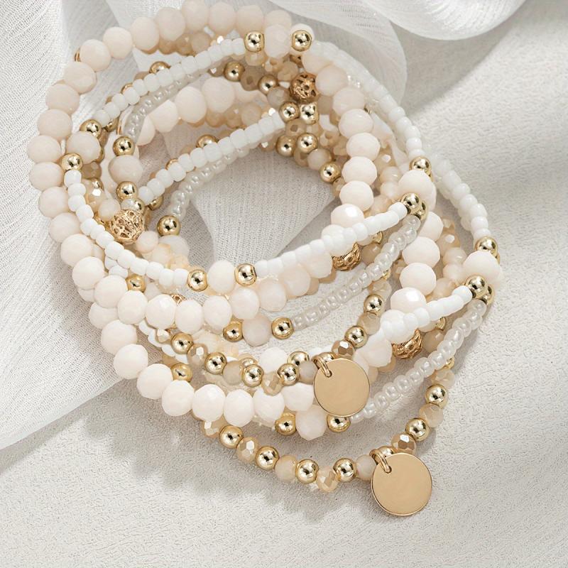 Get this 10-piece stackable bracelet set featuring multilayer pink beads with round pendant charms, perfect for daily wear and versatile styling. No stone included.