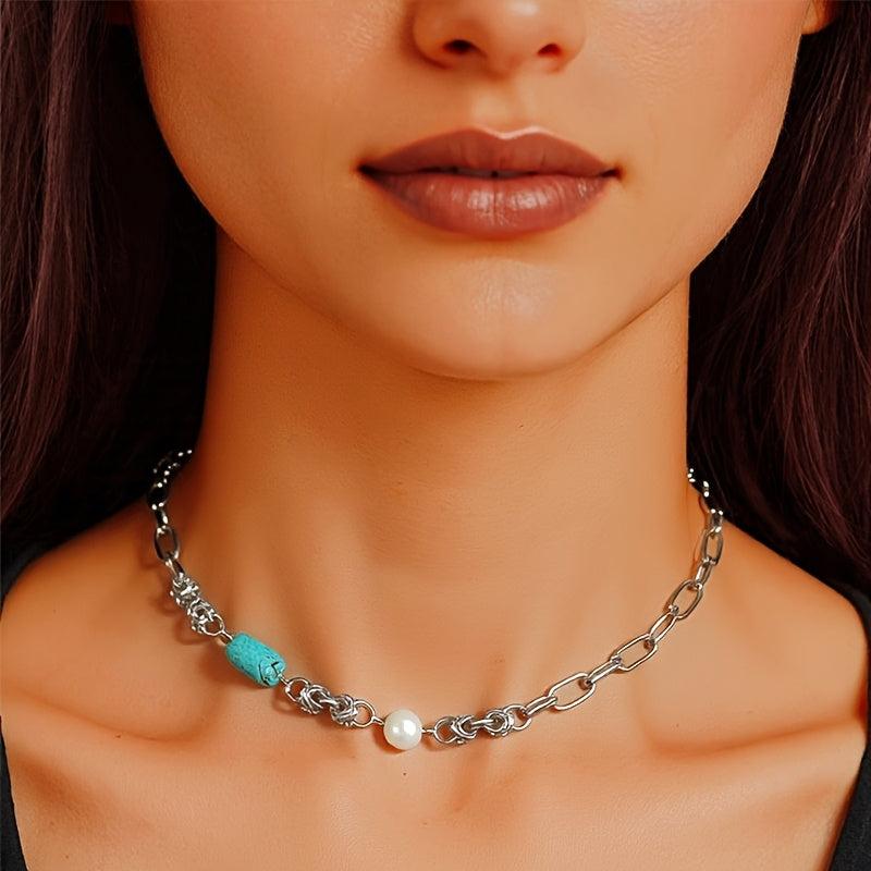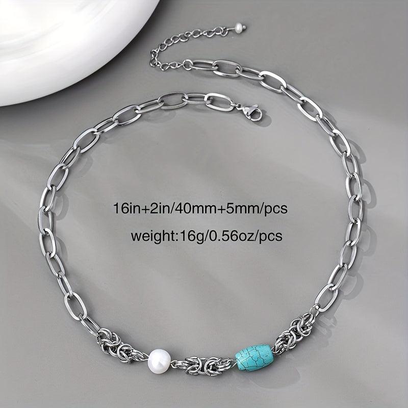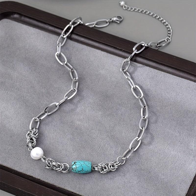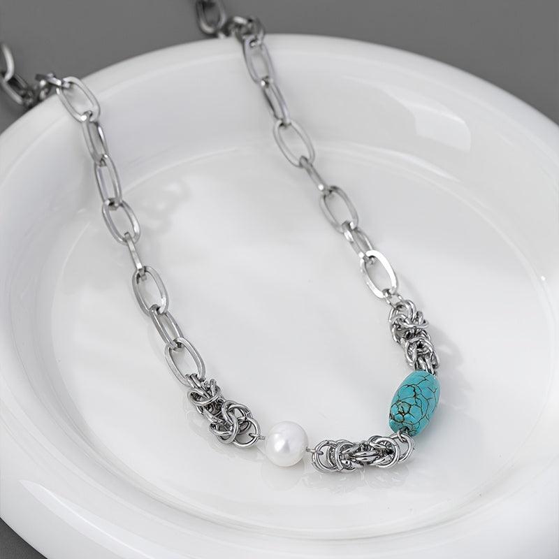 Add a touch of vintage boho charm with this stainless steel chain necklace featuring baroque freshwater pearls and turquoise accents.