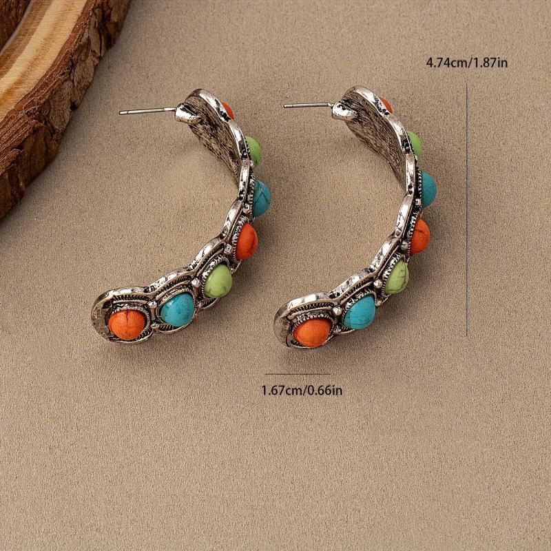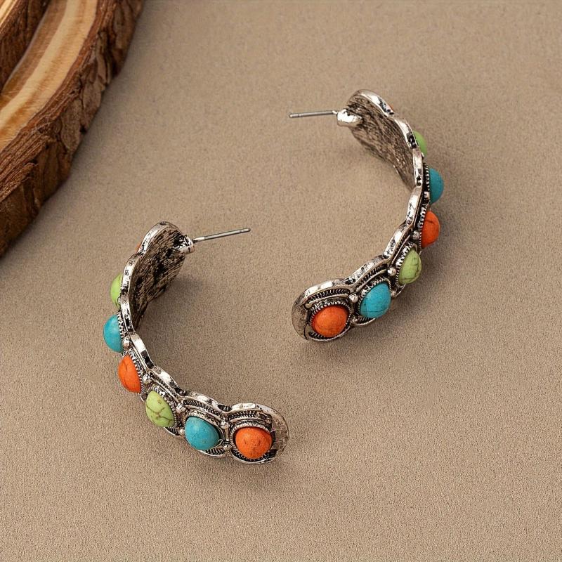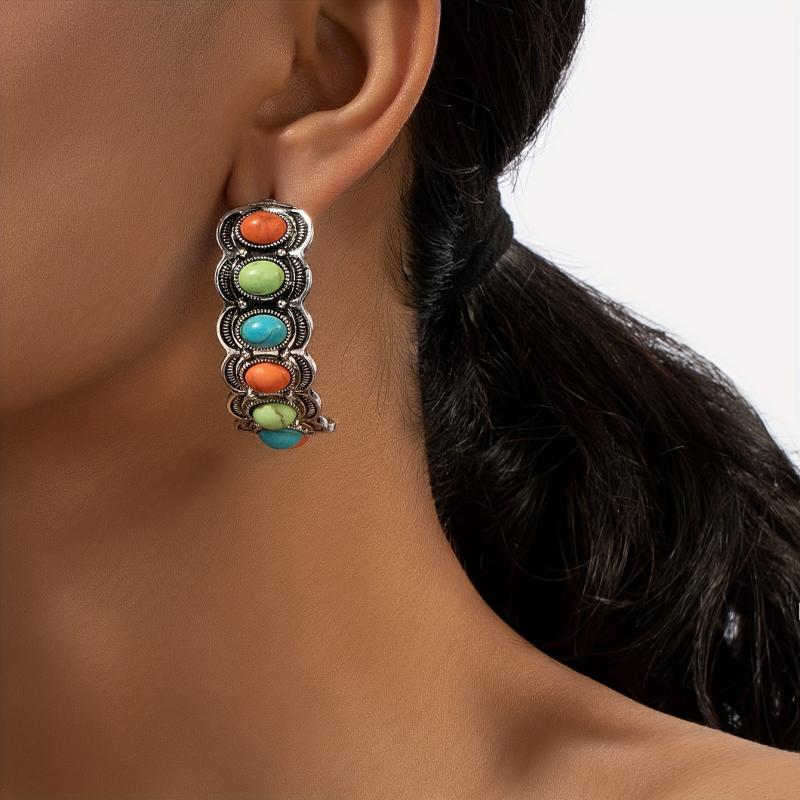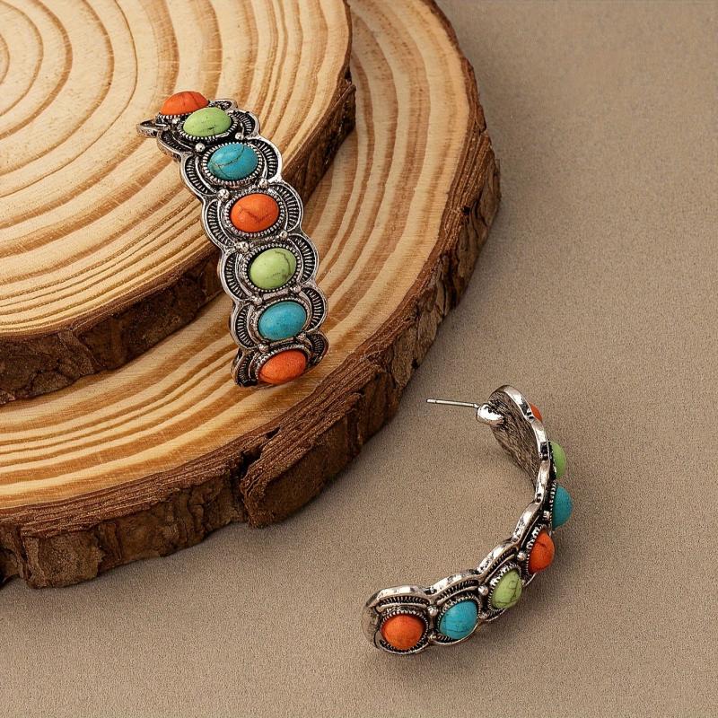 These vintage-inspired stud earrings feature a colorful turquoise stone pattern in a random design. Add a touch of Bohemian flair to your look!