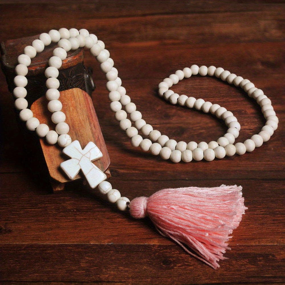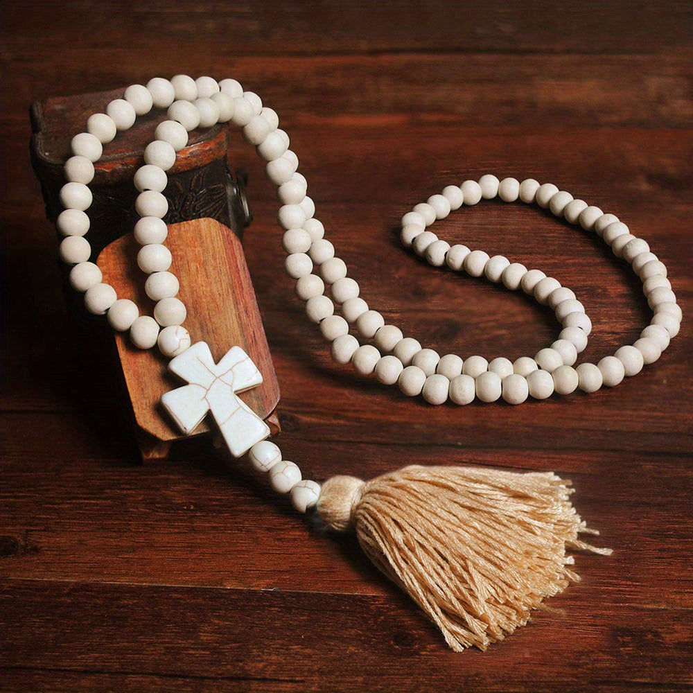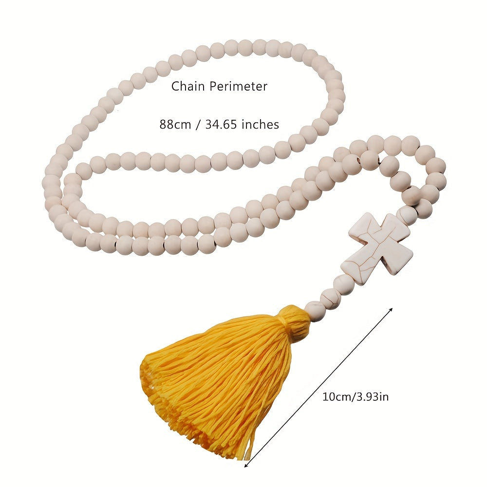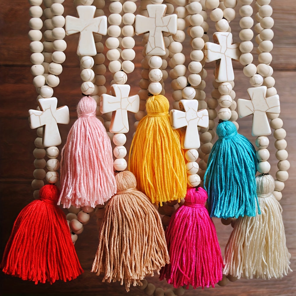 Make a statement with this boho-inspired long tassel cross pendant necklace. Perfect accessory for a chic and trendy look.