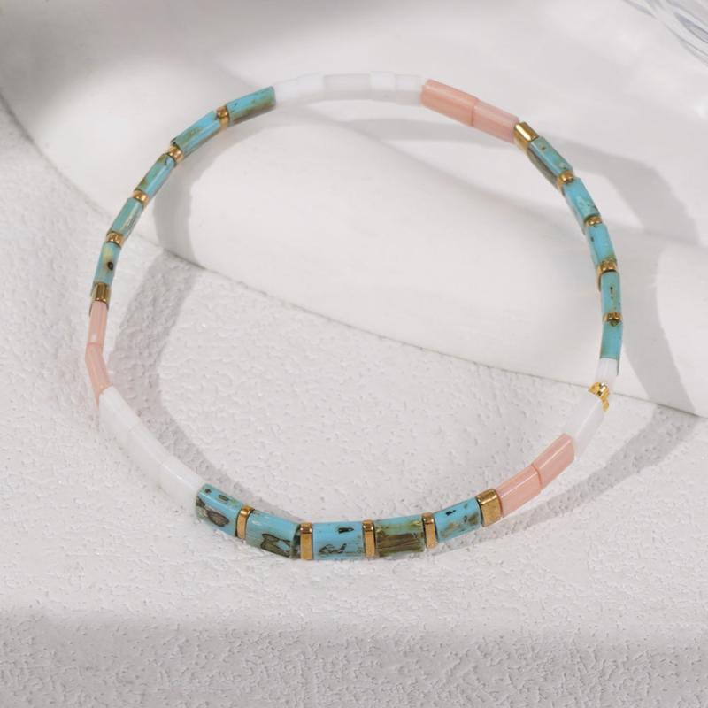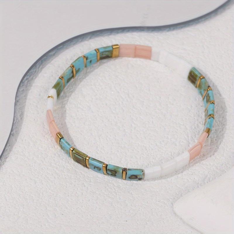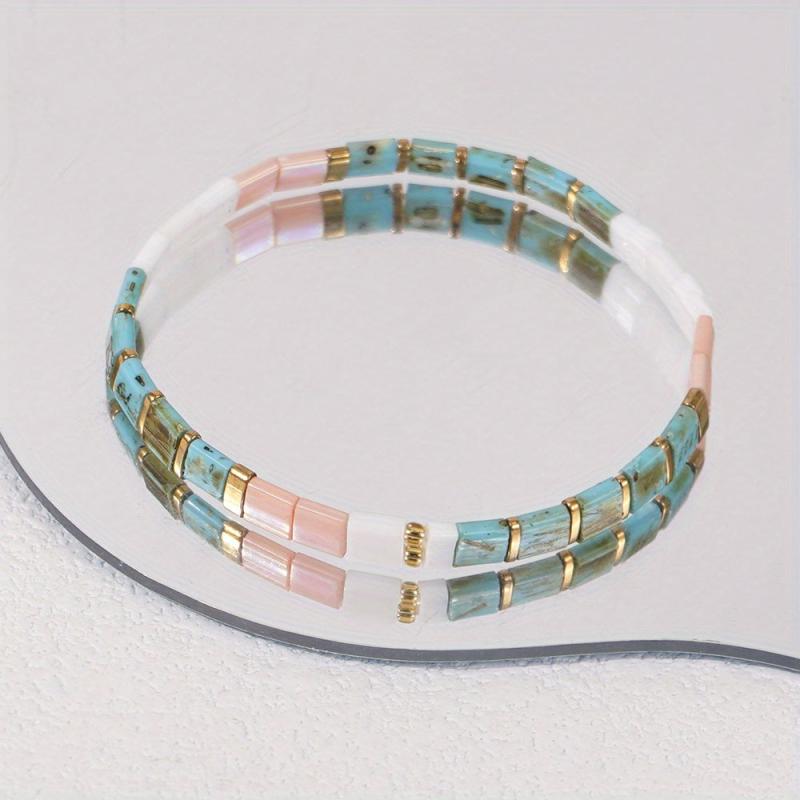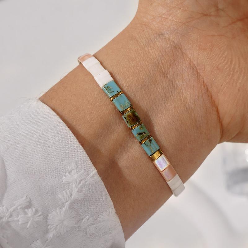 Elevate your beach parties and casual attire with this boho TILA beaded bracelet featuring glass jewelry and golden accents.