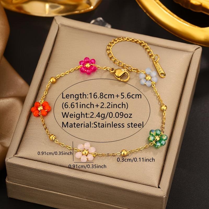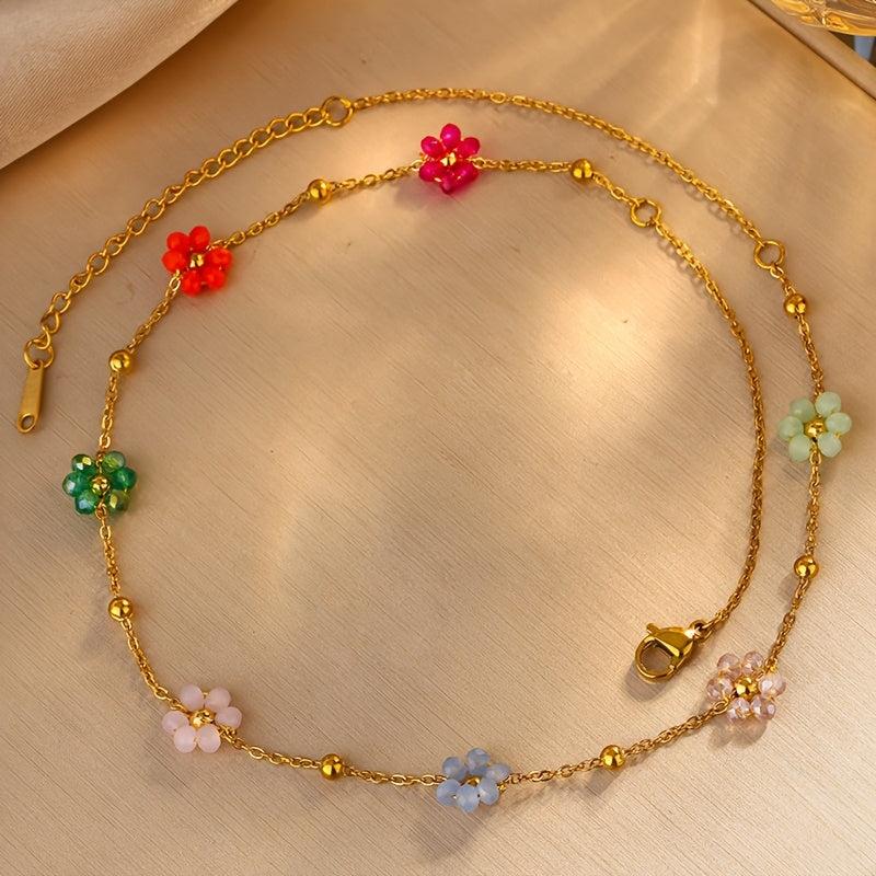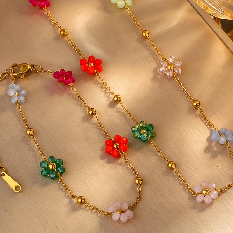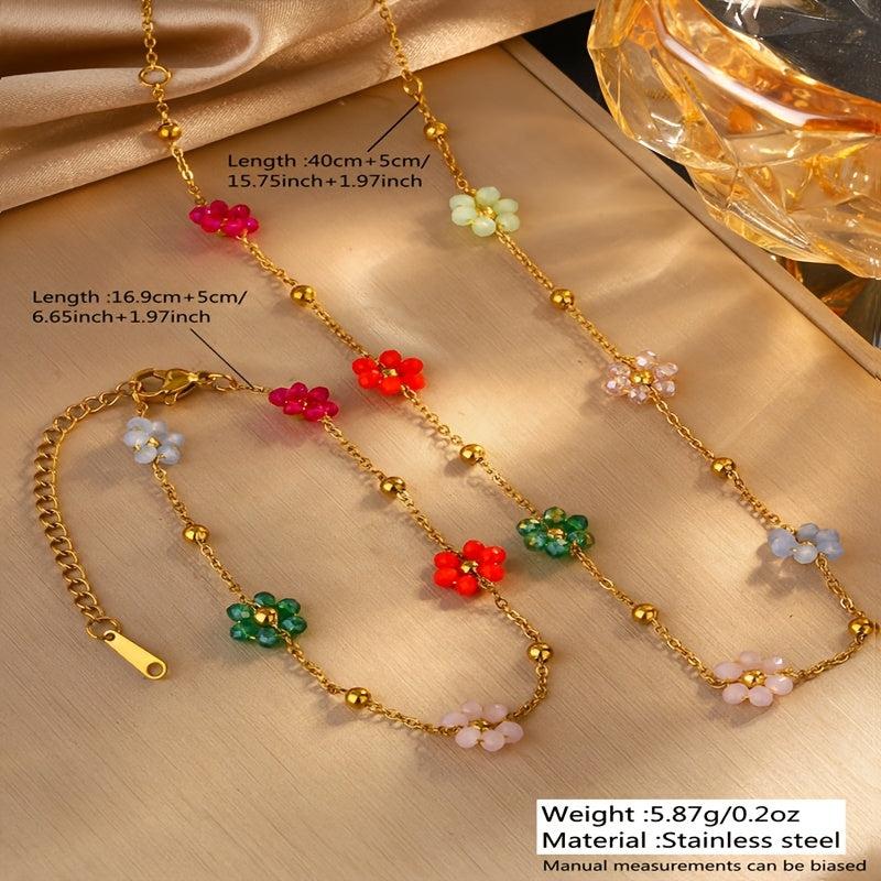 Elevate your style with this boho-inspired jewelry set featuring colorful flower beads. Made of 18K golden plated stainless steel, this set includes a necklace and bracelet, perfect for daily wear.