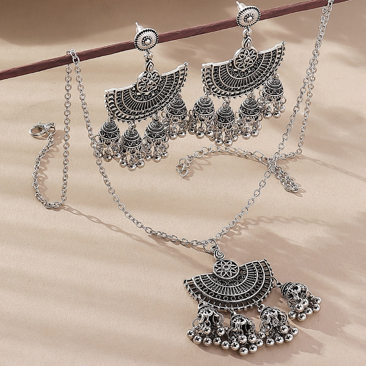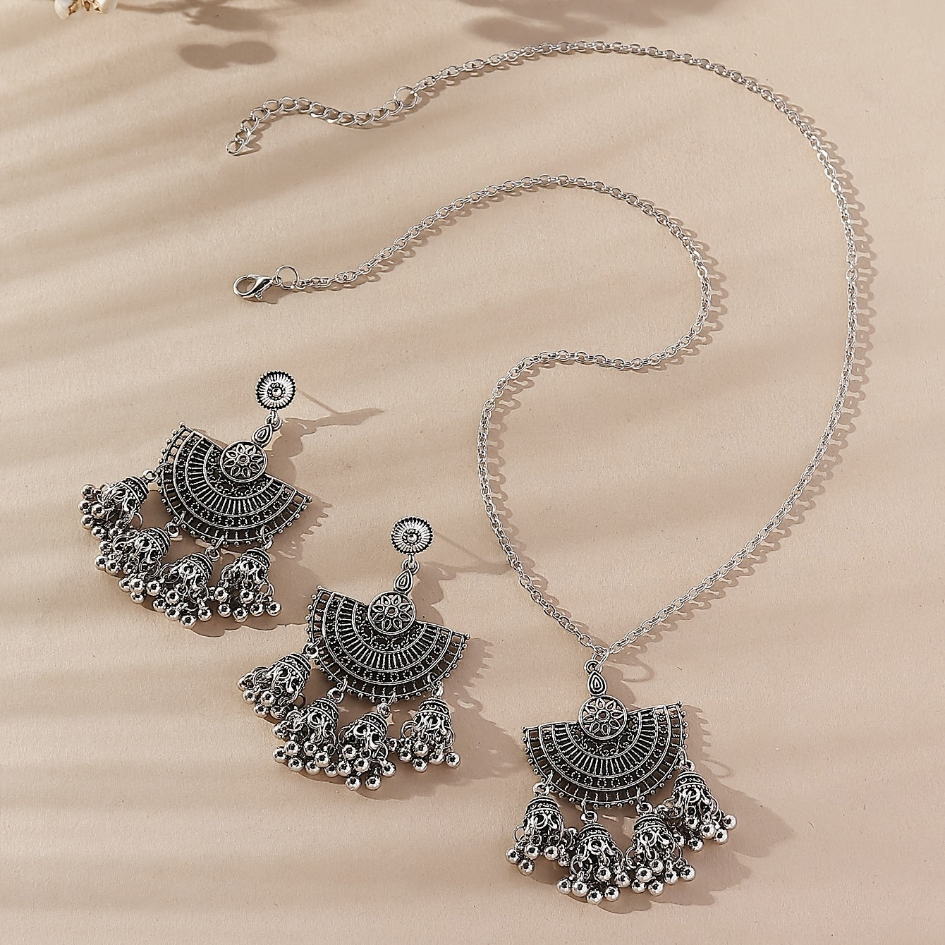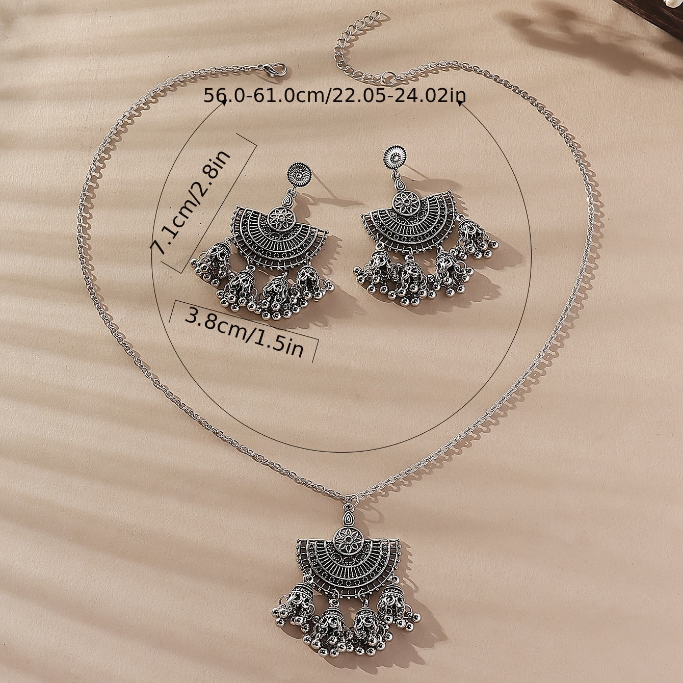 Add a touch of bohemian flair to your outfit with this vintage bell tassel jewelry set. The set includes a pendant necklace and drop hook earrings, perfect for women and girls.