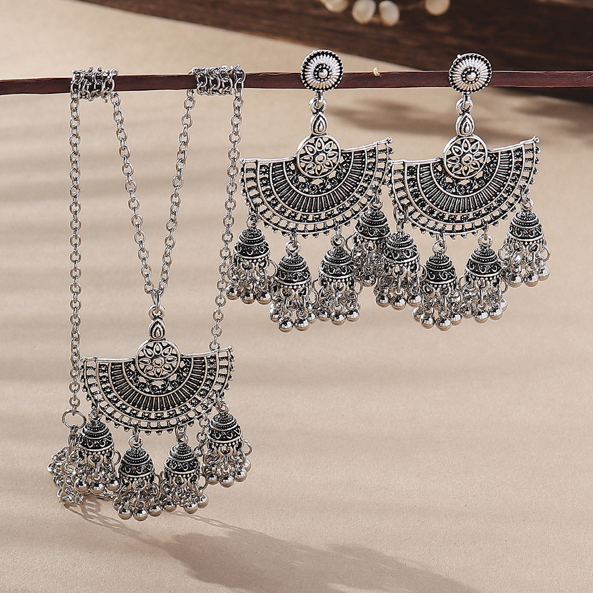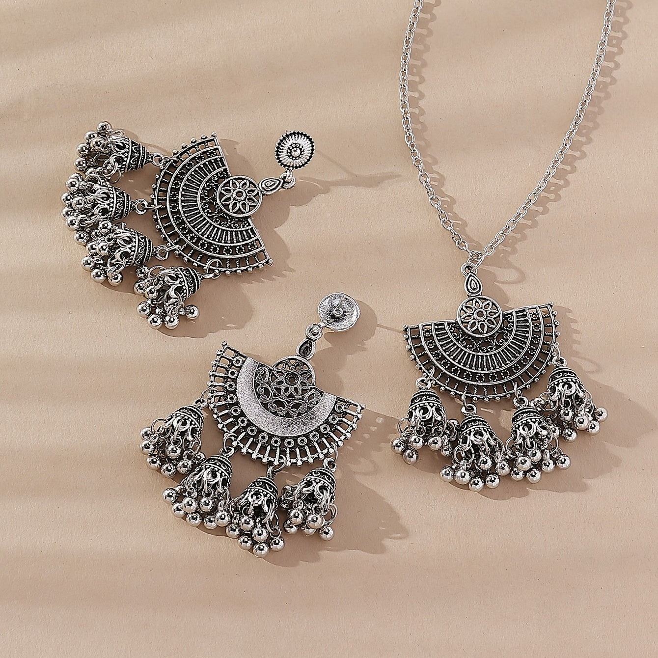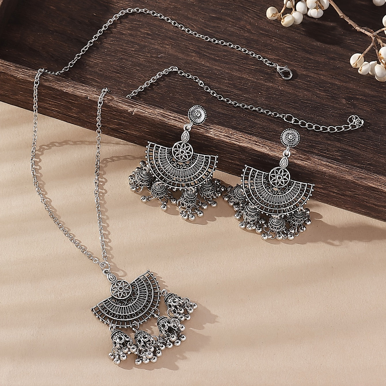 Add a touch of bohemian flair to your outfit with this vintage bell tassel jewelry set. The set includes a pendant necklace and drop hook earrings, perfect for women and girls.