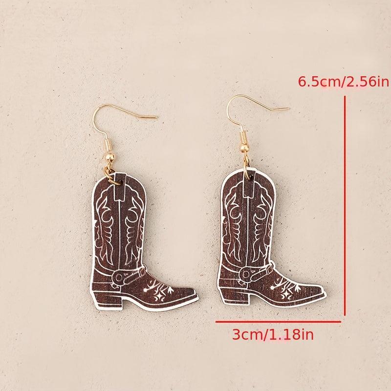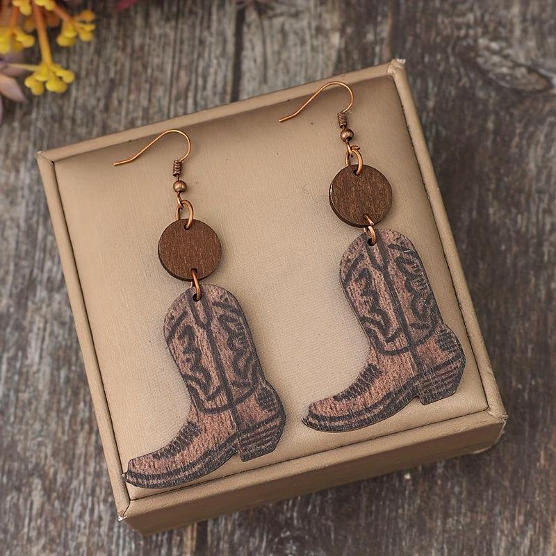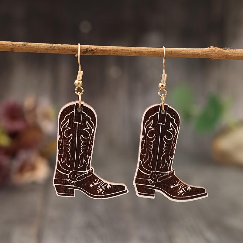 Add a touch of vintage bohemian style to your look with these wooden earrings featuring a western boot pattern.
