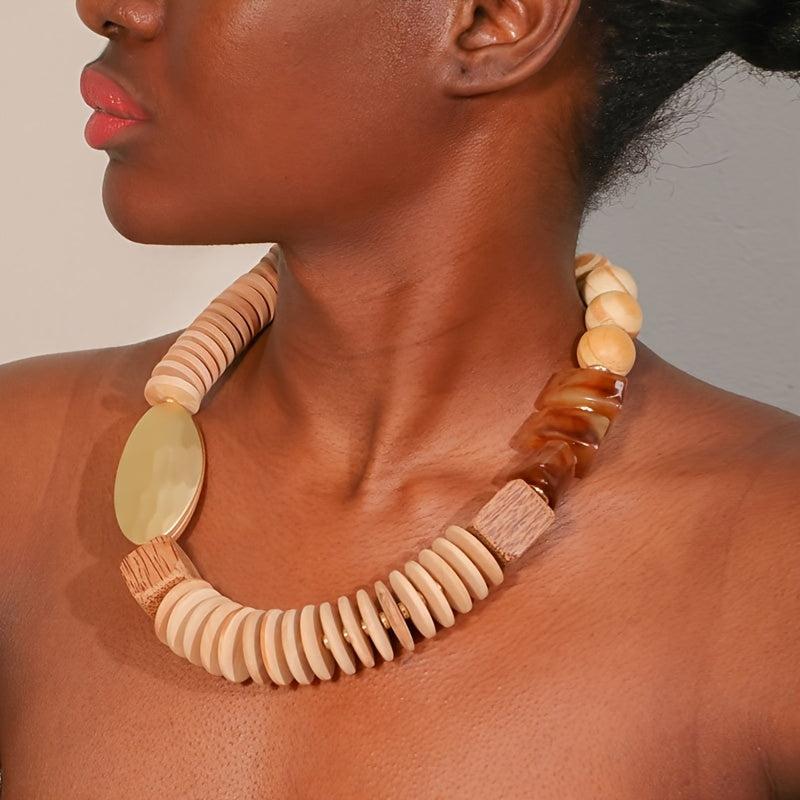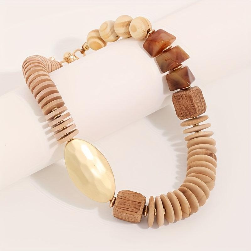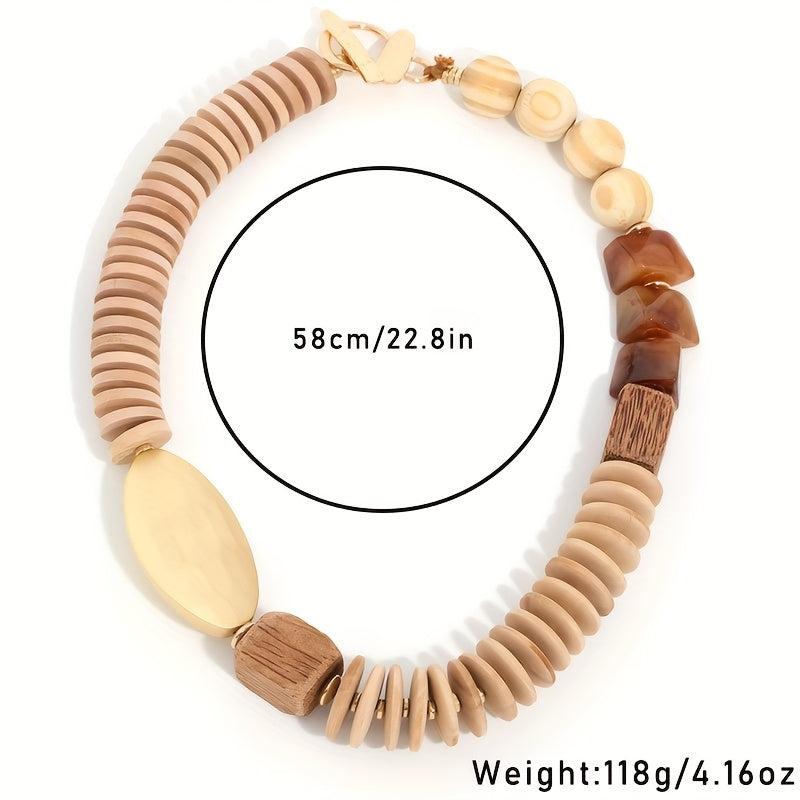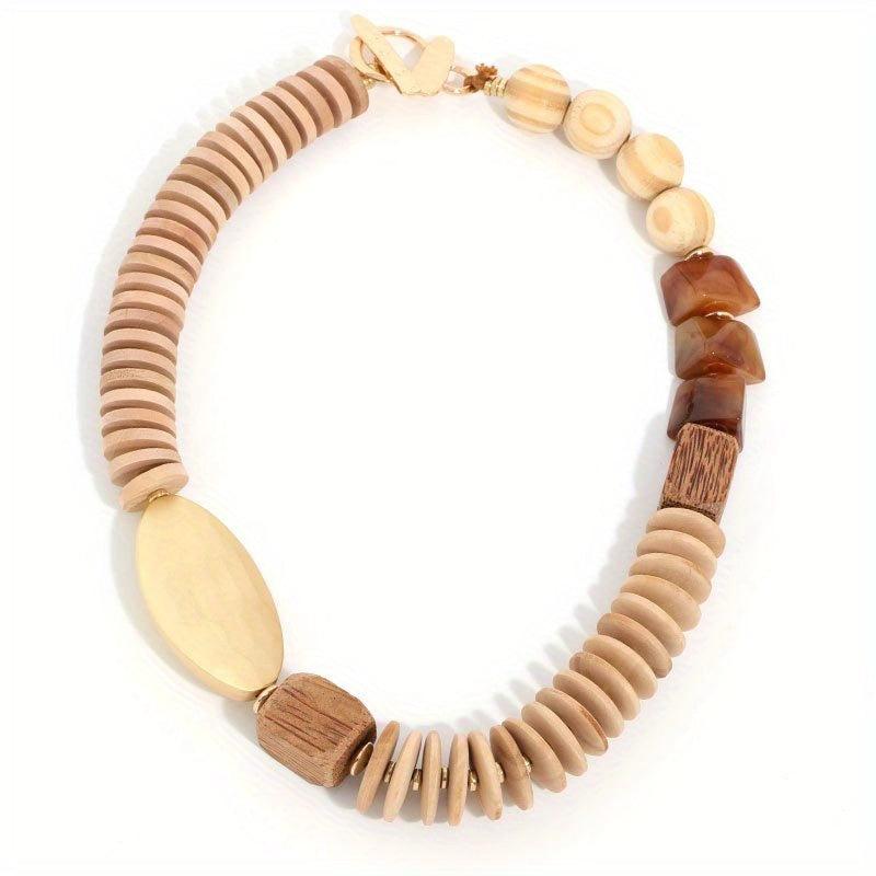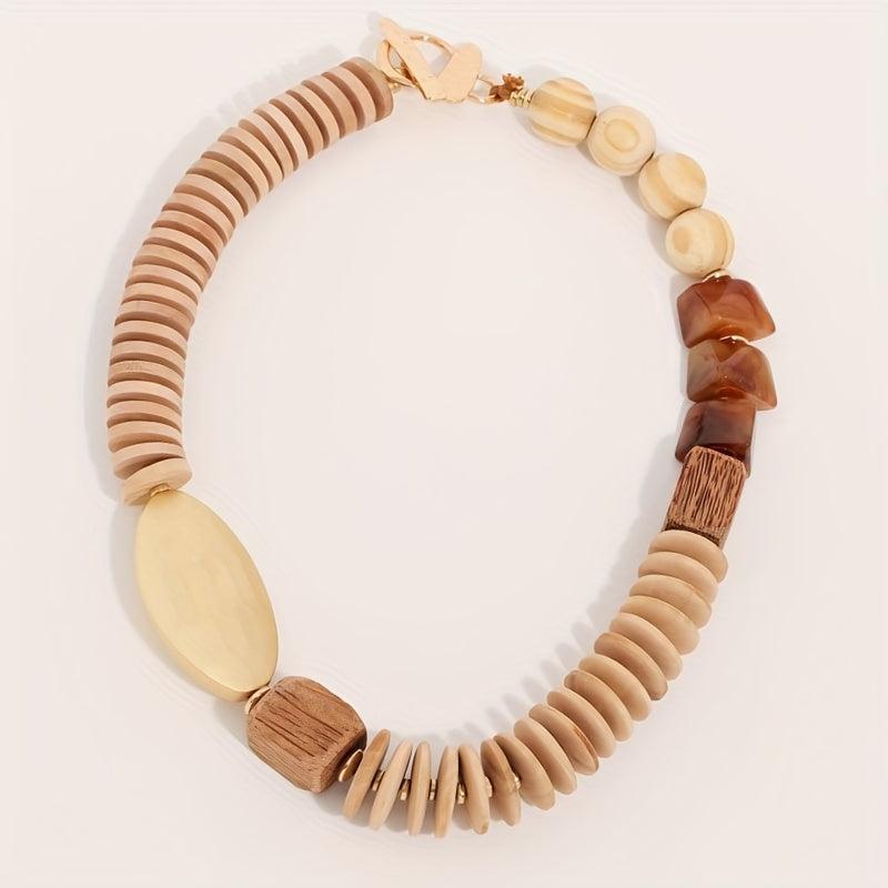 Elevate your look with this boho geometric wood and resin bead necklace featuring golden accents. Ideal for everyday wear, this versatile accessory adds a touch of vintage charm to any outfit.