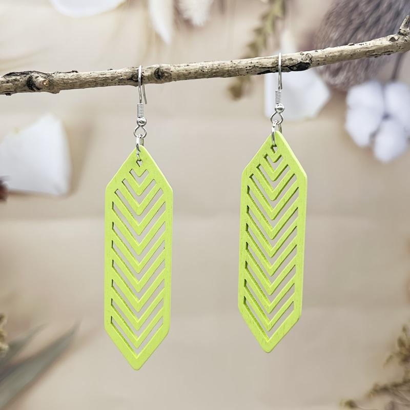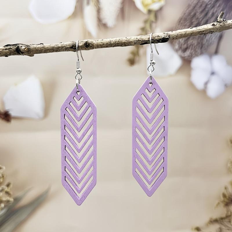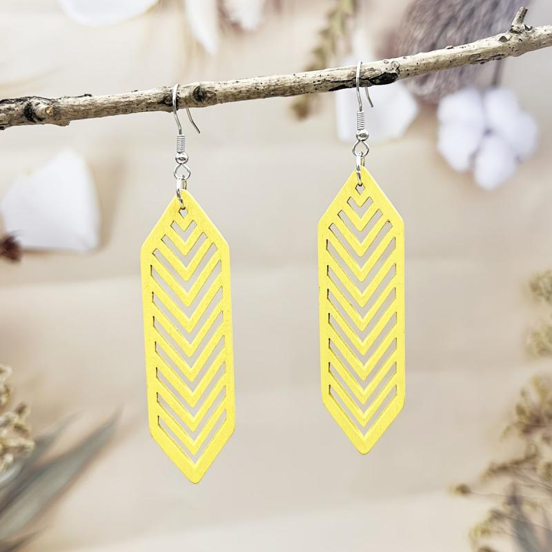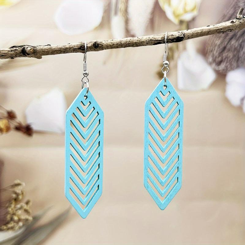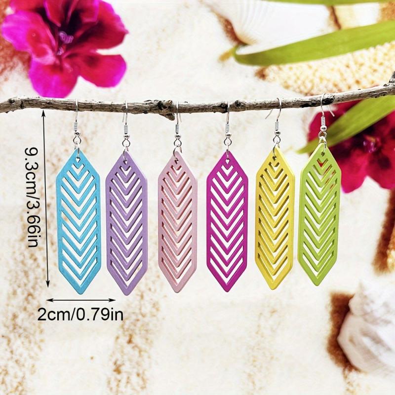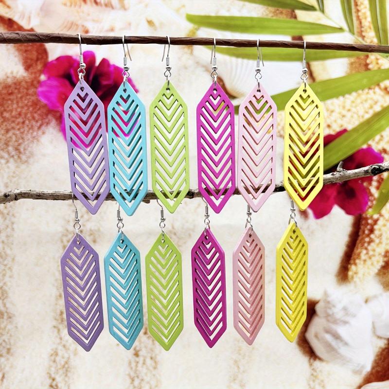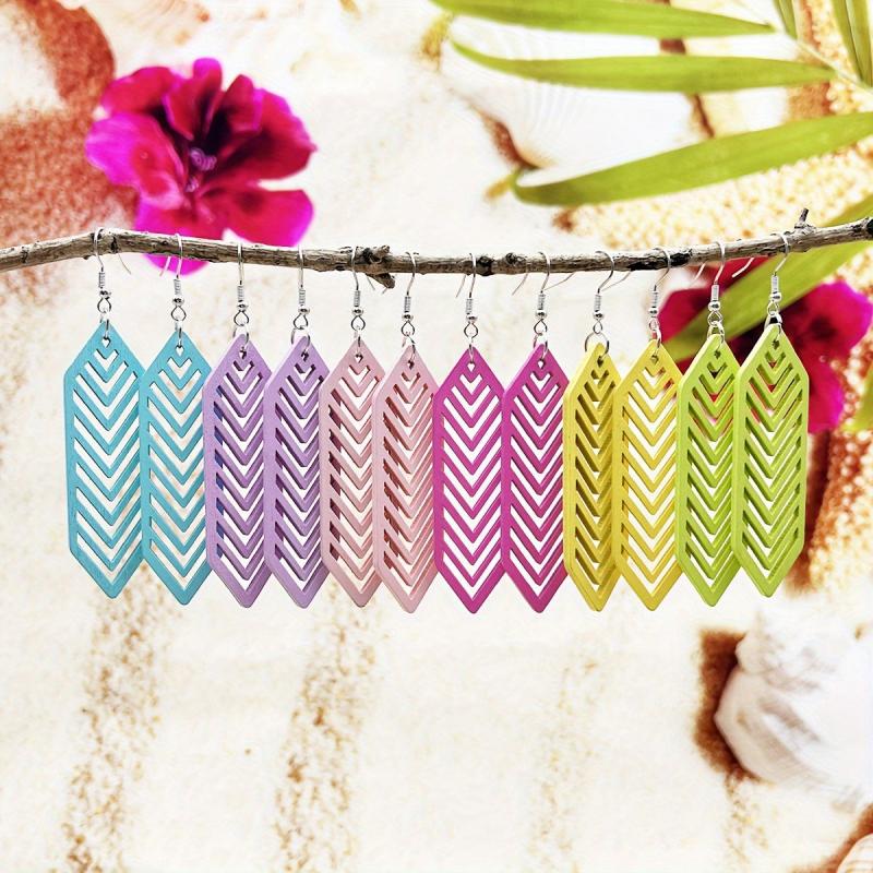 Add a bohemian touch to your summer vacation or casual attire with these colorful wooden drop earrings. Their lightweight design makes them perfect for all-day wear.