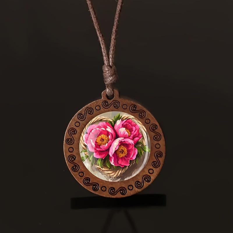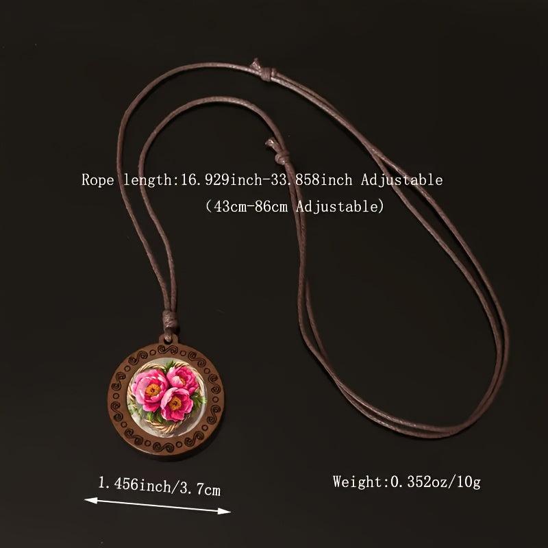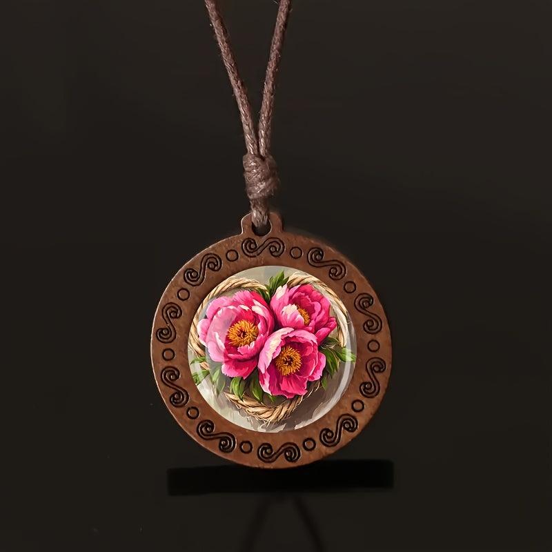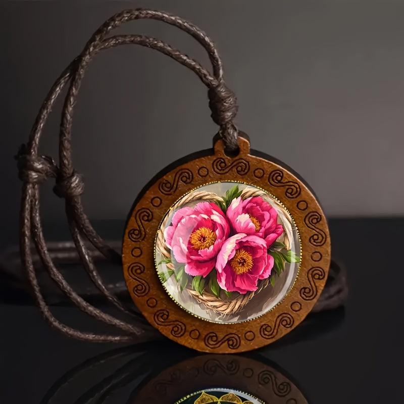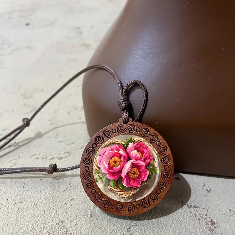 Vintage style necklace perfect for daily wear and gifting. This boho necklace features a wooden pendant with a pink peony design on an adjustable cord.