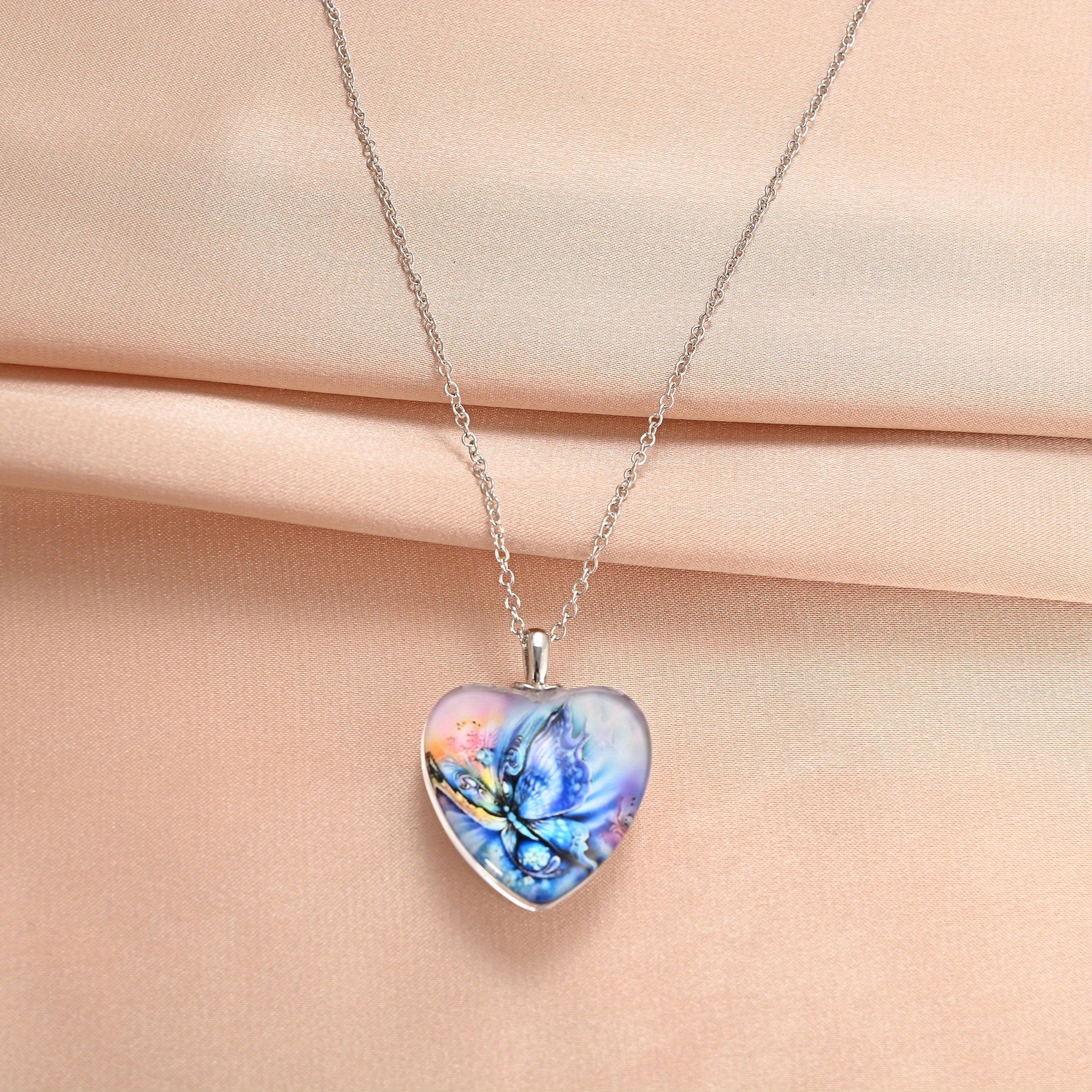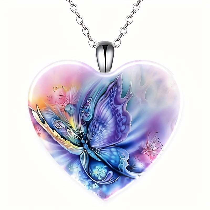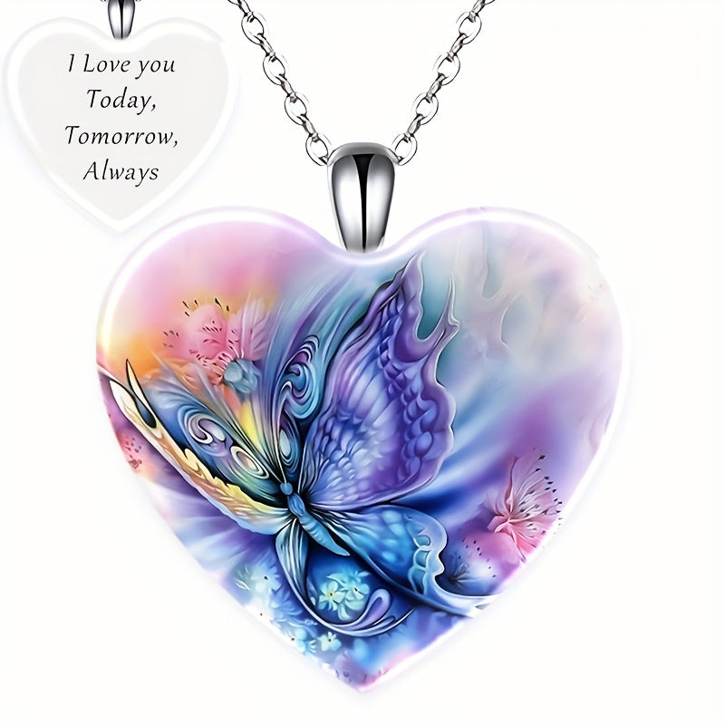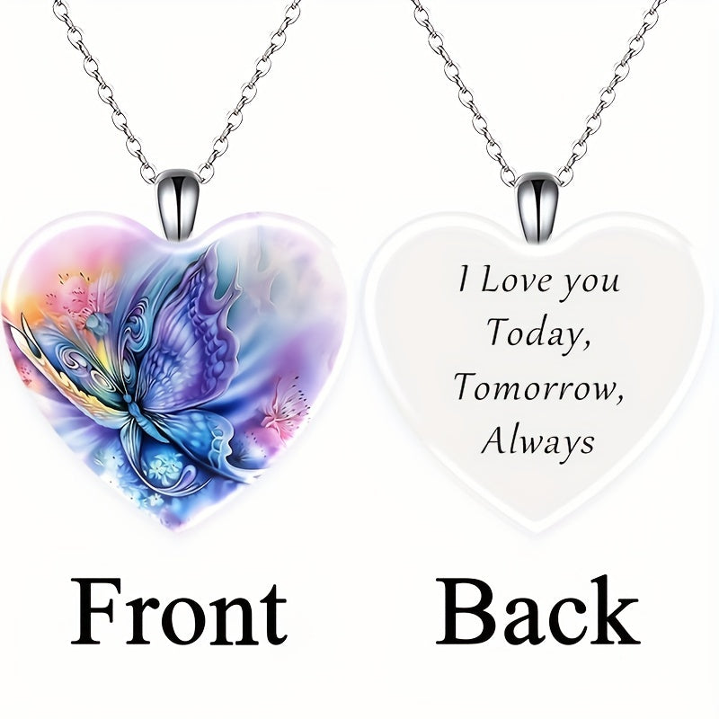 This delicate necklace features a butterfly pattern love heart pendant with sparkly crystals. It is a perfect accessory for women and girls for holiday parties or everyday wear.